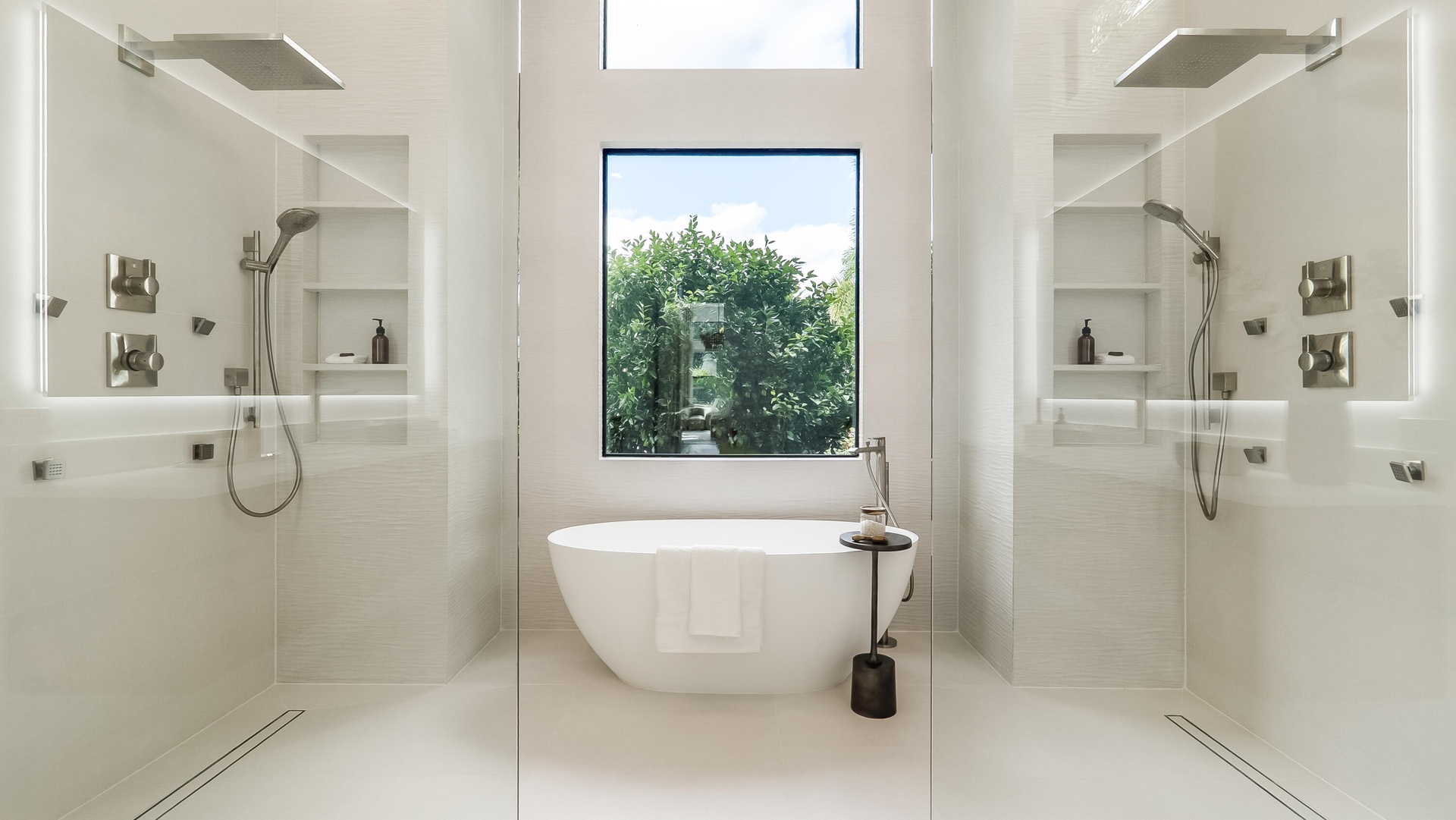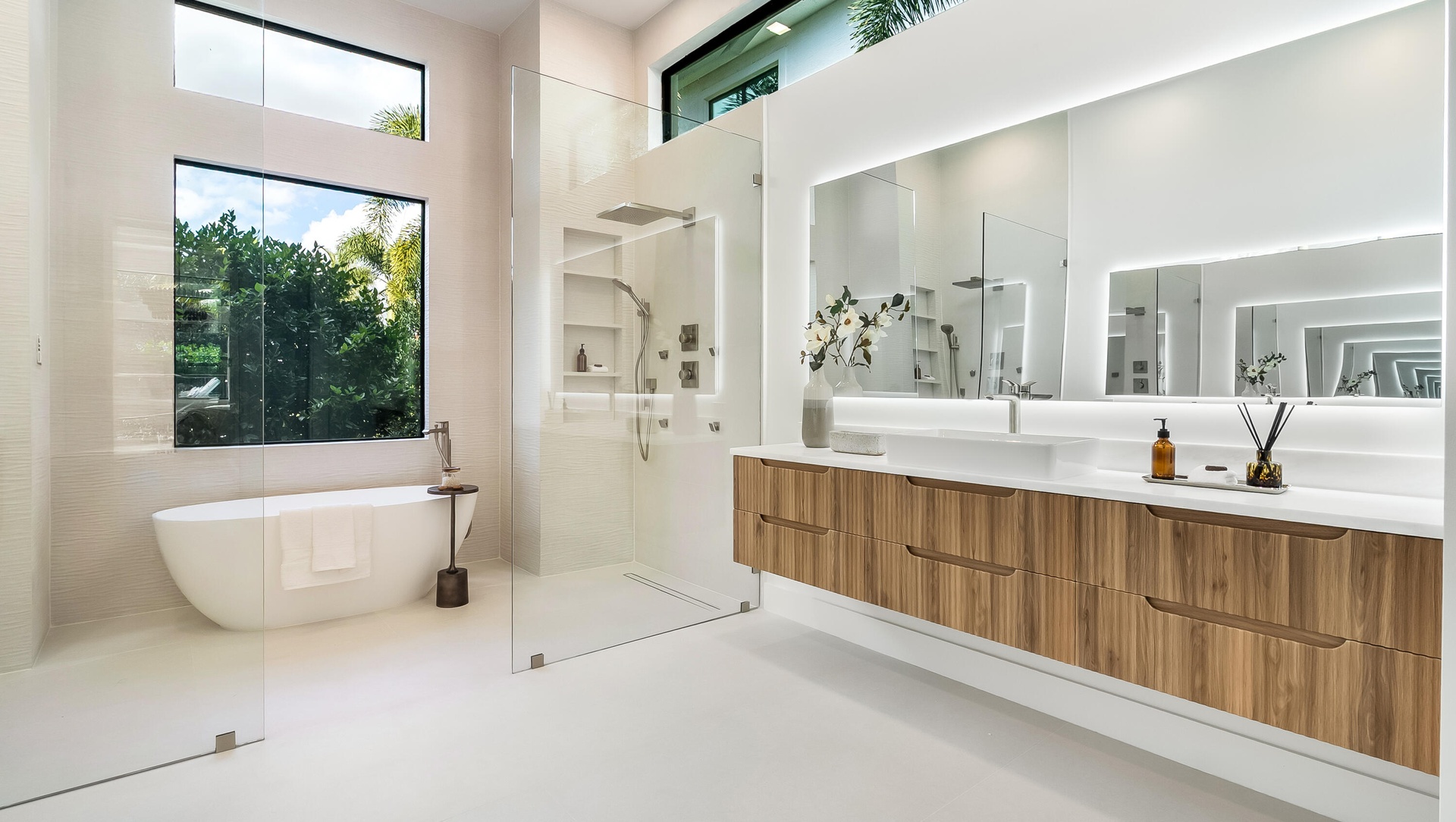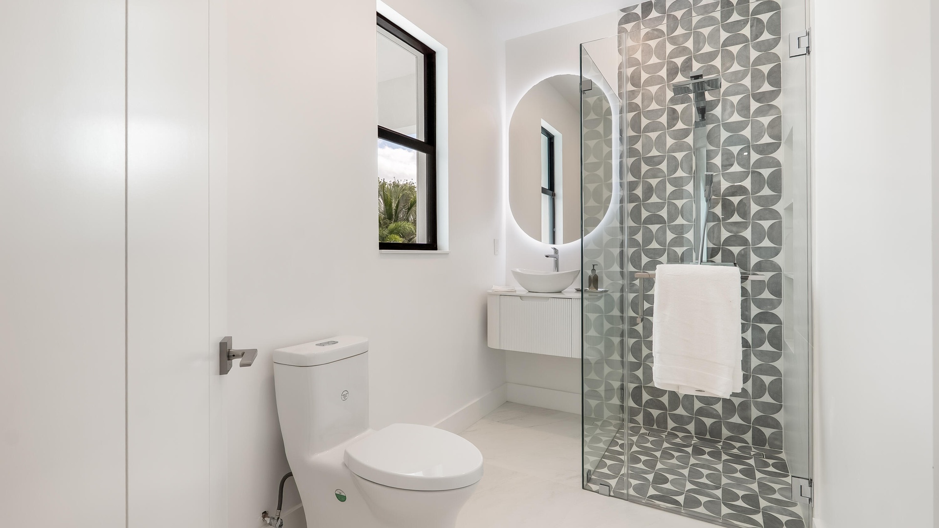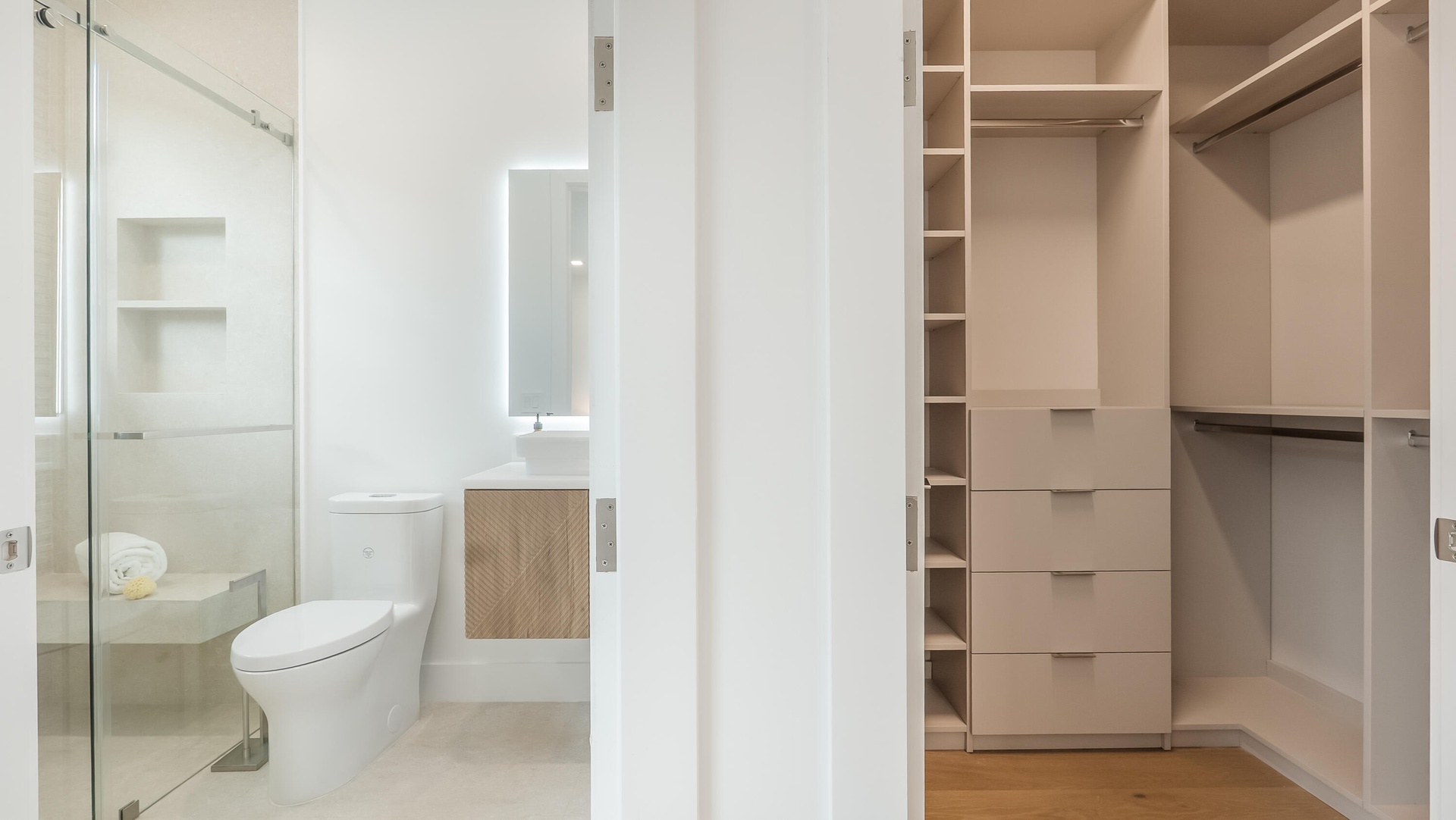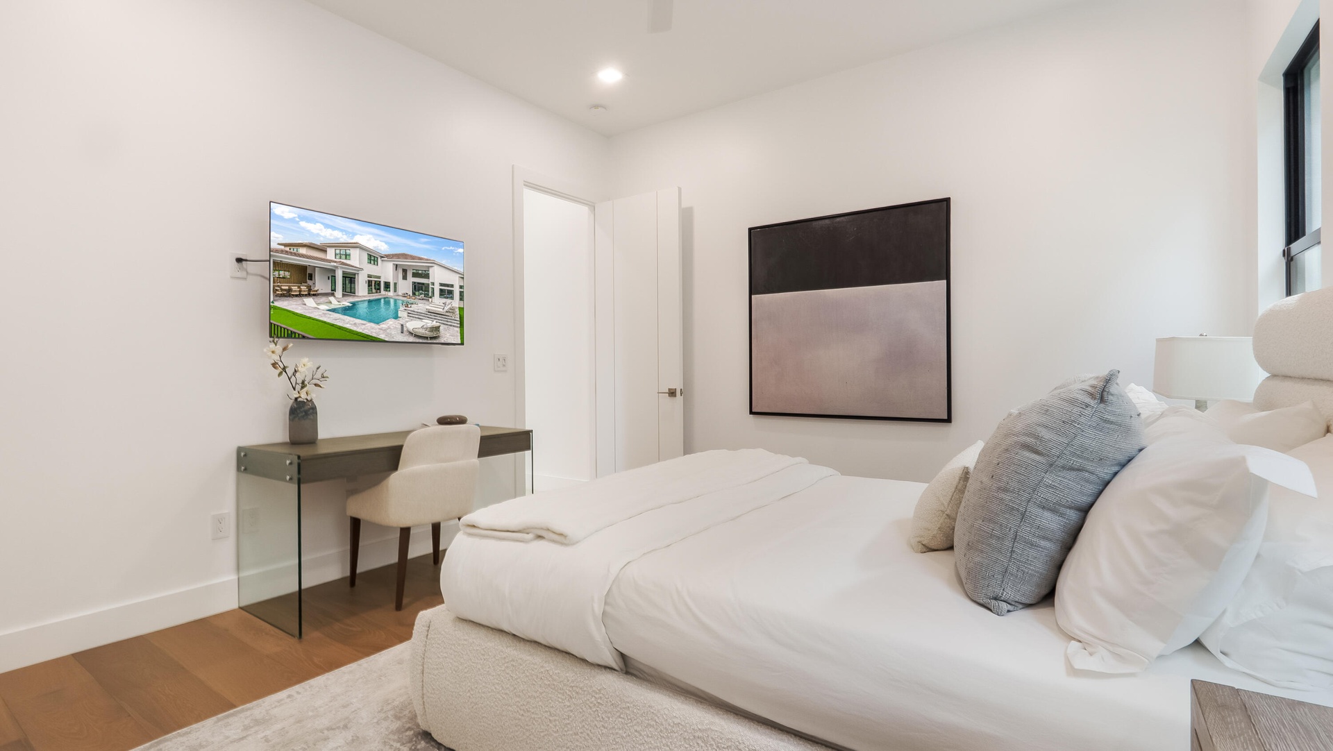 The primary suite is a private retreat, highlighted by a spa inspired bathroom with a luxurious wet room featuring separate his and her showers, a designer soaking tub, Hansgrohe fixtures, and smart EPLO electric toilets. Every bathroom in the home reflects the same level of detail and craftsmanship, finished with imported tile from Spain and premium materials throughout.