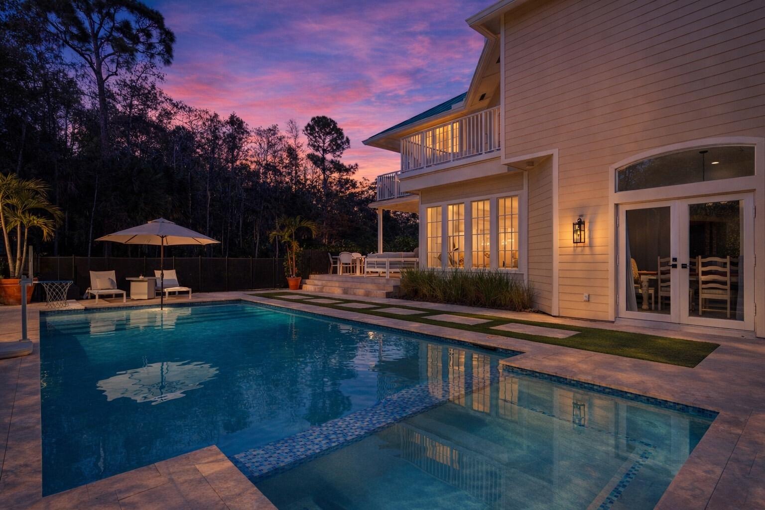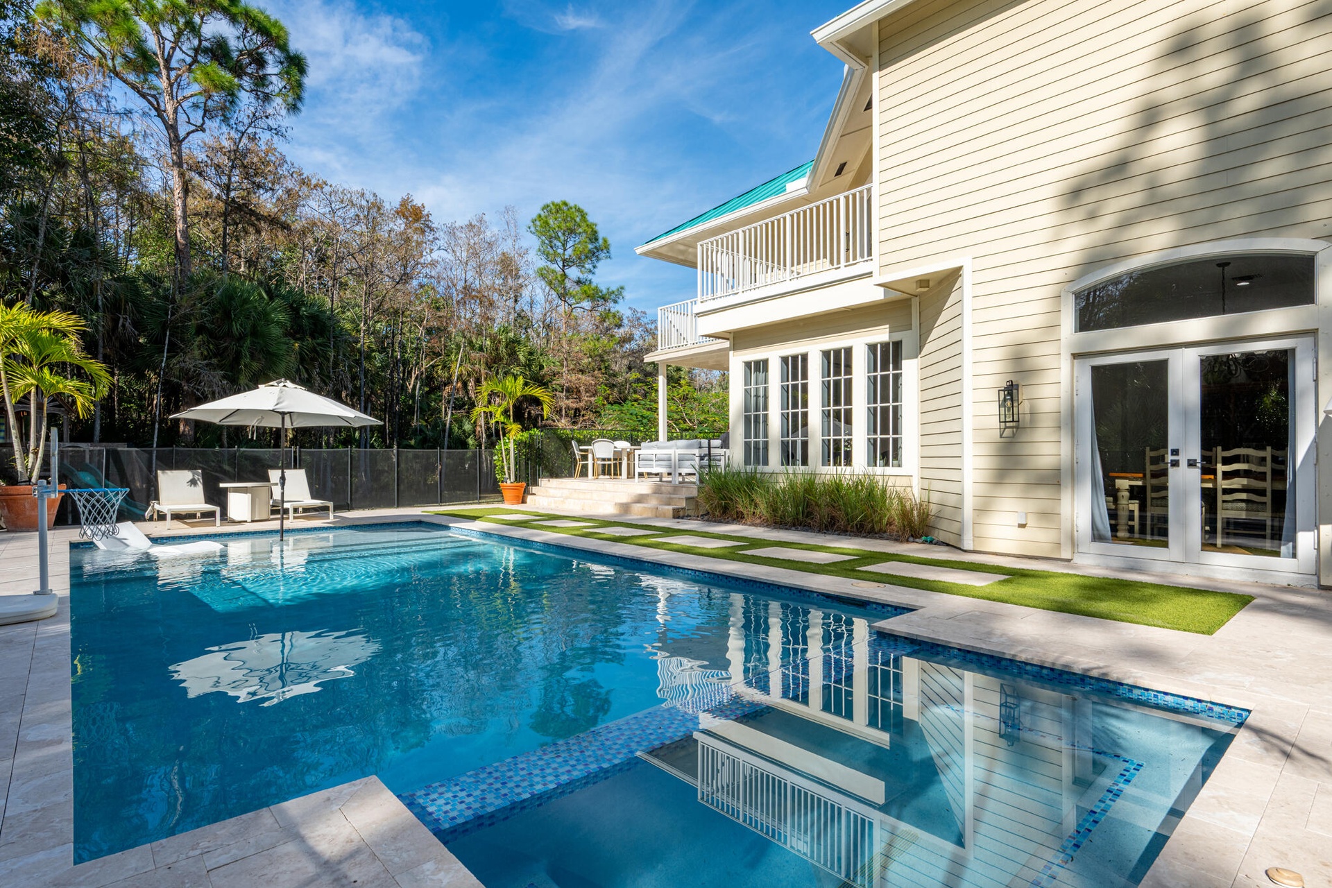 Designed for indoor-outdoor living, the home opens to a resort-style swimming pool with expansive patio areas complete with a travertine pool deck, perfect for entertaining or relaxing in complete privacy. Outdoor living spaces provide opportunities to enjoy Florida's year-round sunshine, whether hosting gatherings or savoring quiet mornings surrounded by nature.