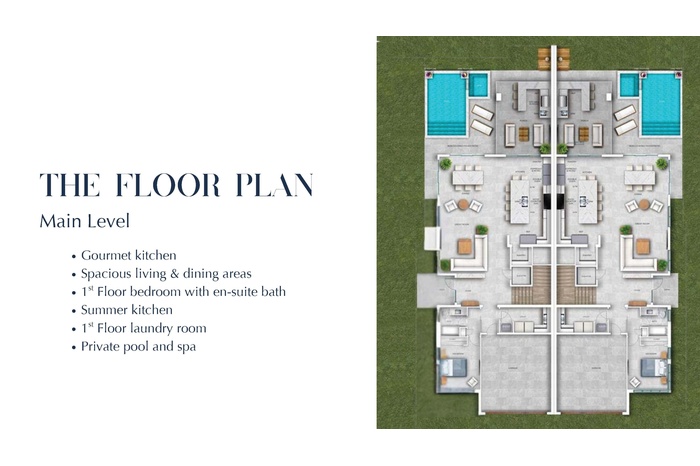 - Primary Suite Balcony — Private east-facing retreat overlooking the pool, designed as a true outdoor living space for quiet mornings and relaxed eveni