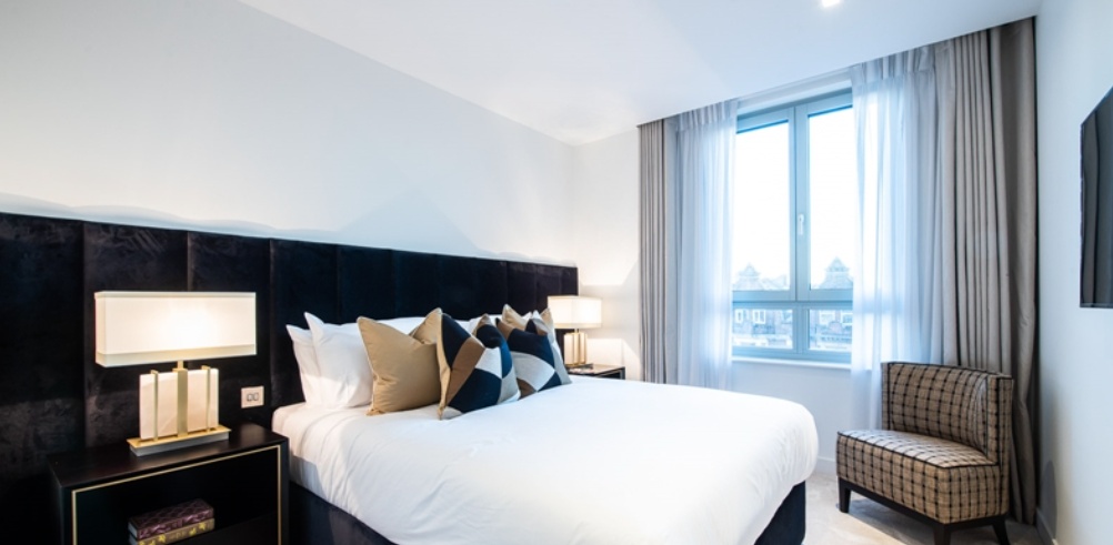 The apartment features a spacious open-plan reception room leading directly onto the balcony, creating a bright and versatile space ideal for both relaxation and entertaining. The fully integrated kitchen is finished with a composite stone worktop and premium Siemens and Miele appliances, including an oven, induction hob, large fridge freezer, dishwasher, and wine chiller.