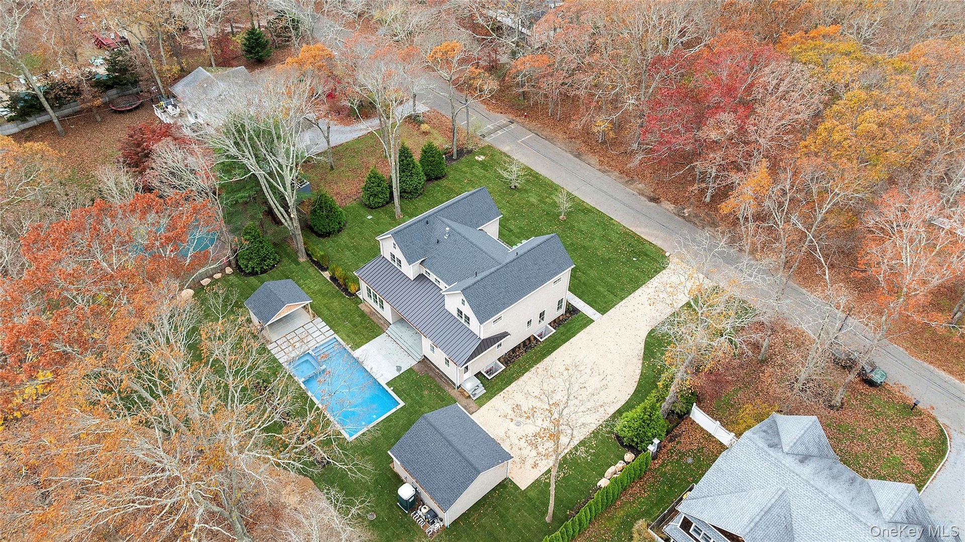 Outdoors, the property transforms into a private retreat. A covered patio off the rear of the home overlooks a beautifully landscaped yard centered around an 18’ x 32’ heated gunite pool with an 8’ x 8’ spa, ideal for both quiet mornings and summer evenings. A poolside cabana enhances the resort-like atmosphere, while a detached two-car garage adds convenience without disrupting the home’s clean architectural lines. Completing the lifestyle offering is private access to Ninevah Beach, allowing residents to enjoy one of Sag Harbor’s most treasured waterfront settings just moments away.