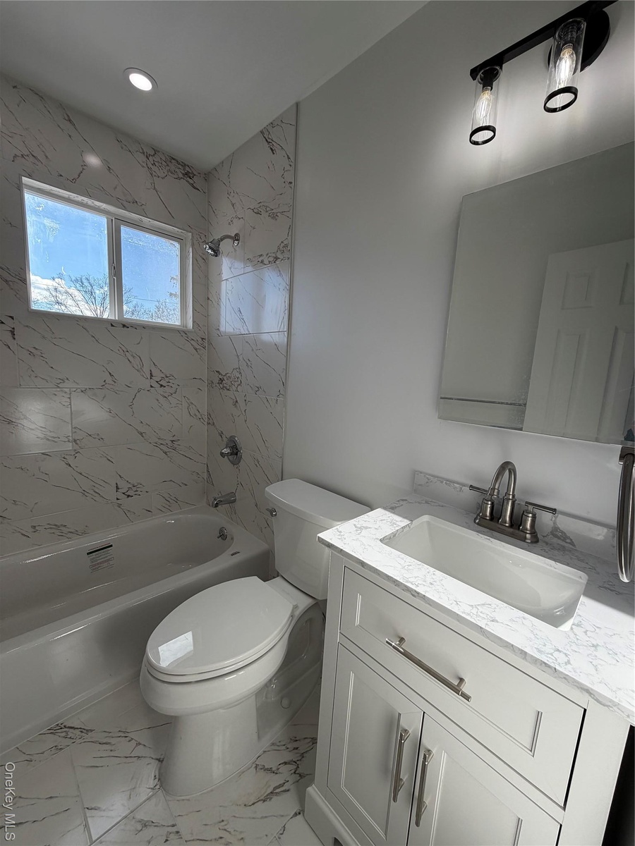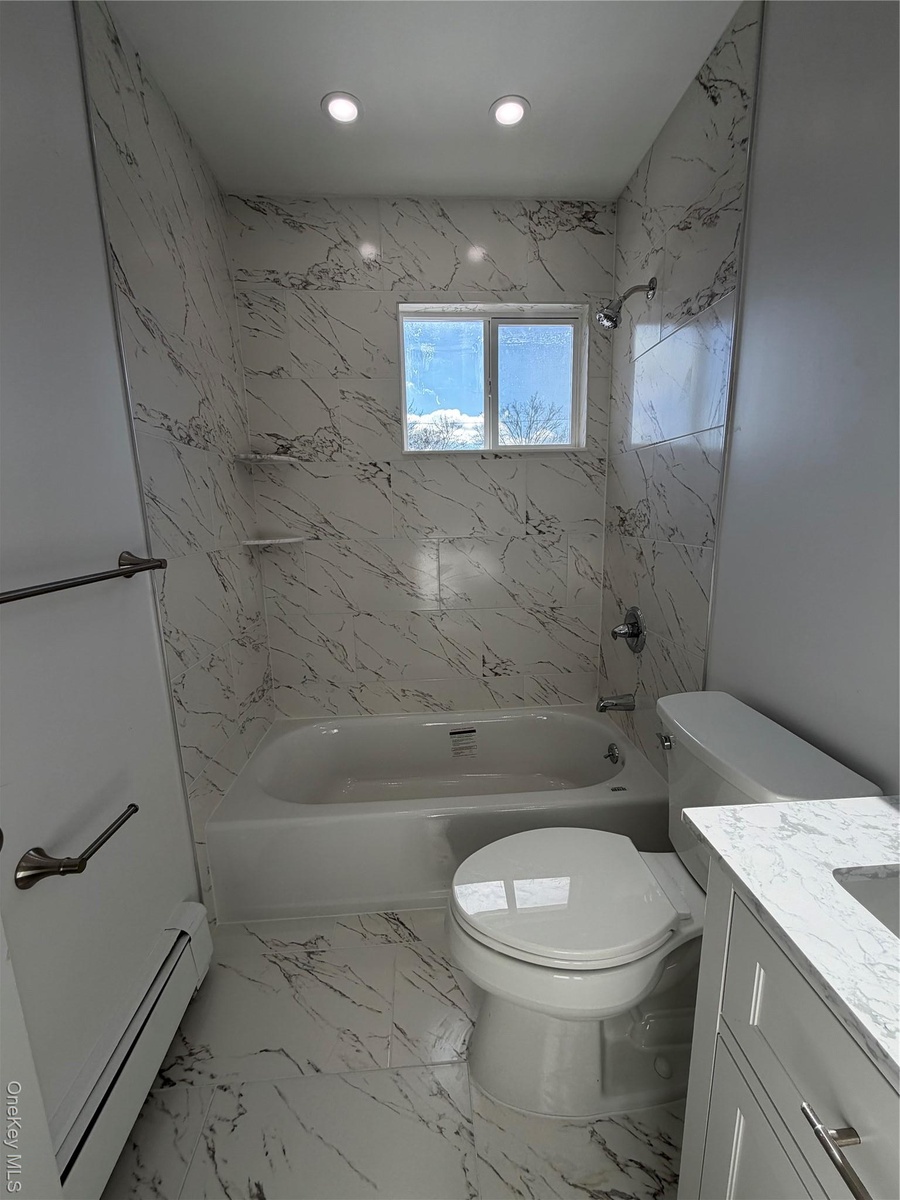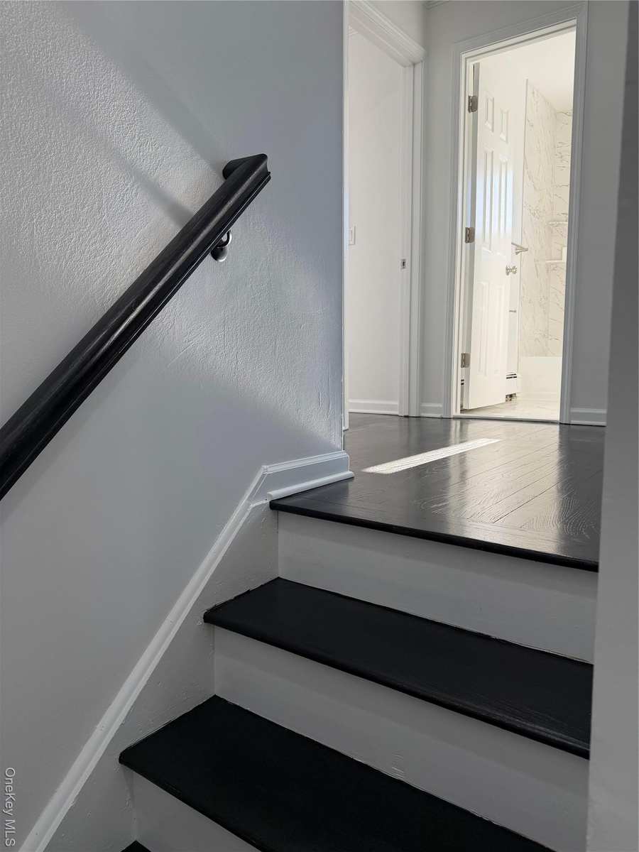 The 2nd floor has 3 light filled bedrooms with all wood flooring and recessed lighting. There is ample closet space in each, including a walk in closet in the primary. The bright, full bathroom on this floor is a contemporary design with marble inspired tiles and modern fixtures. There is a convenient 1/2 bath on the 1st floor as well.