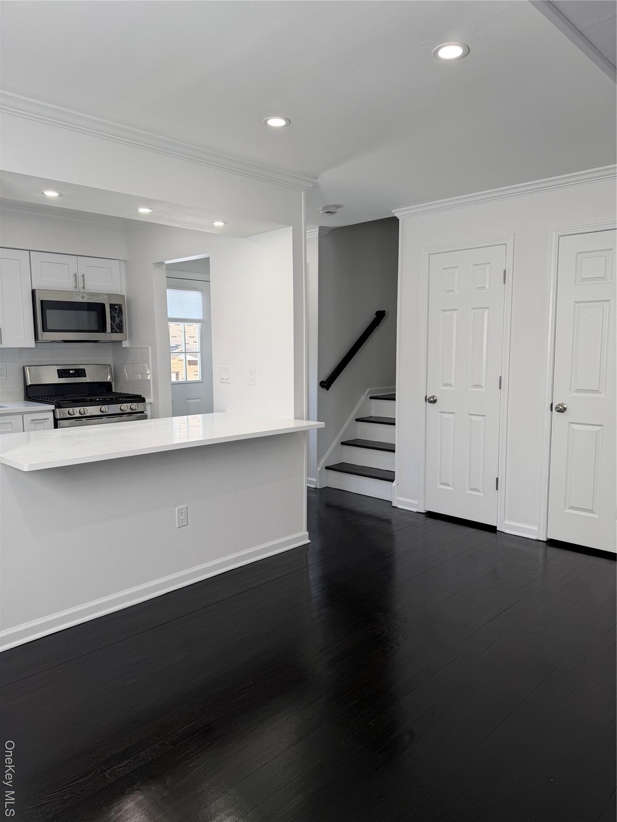 Welcome to 12 Central Drive Unit 1, a beautifully renovated 3 bedroom townhouse at the St. Moritz, Nanuet NY. This totally spacious, light filled unit has an open floor plan for comfortable living and entertaining in style. The contemporary kitchen has all new white cabinetry, quartz countertops and stainless steel appliances. You'll find a double sided counter , designed to accommodate bar chairs for eating and lounging. Adjacent to the kitchen is a dining area that leads to an expansive living room that boasts all new hardwood floors and recessed lighting. The private balcony is right off the living room accessible by a sliding glass door.