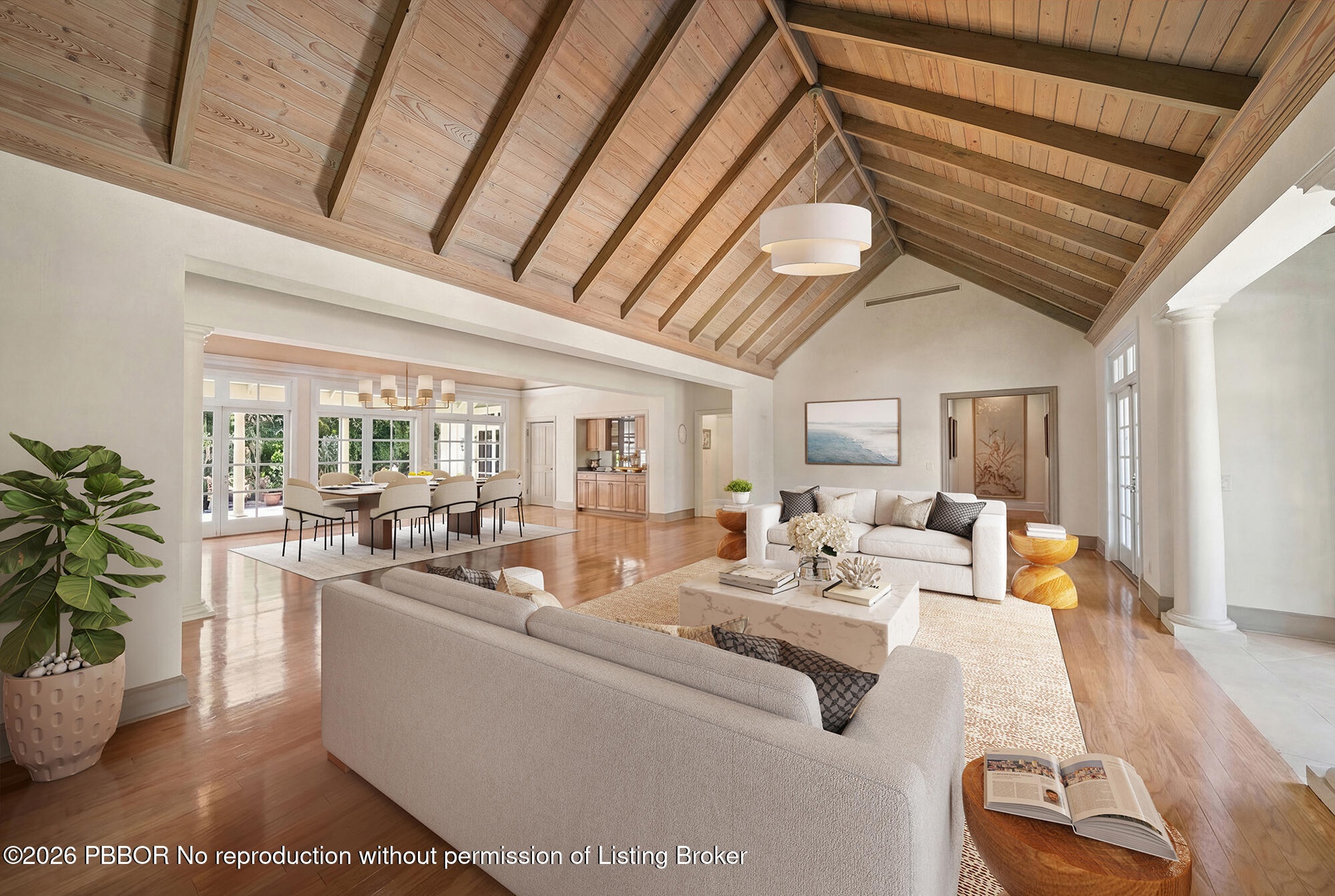 Rare opportunity to own an oversized 17,000 sq. ft. lot on the coveted sunnySouth Side of Tangier Avenue, one of Palm Beach Island's most exclusive near town North End streets. This property features a sprawling single-story home with over 5,400 sq. ft. of total living space, highlighted by stunning vaulted ceilings that frame views of the serene pool and lush gardens.