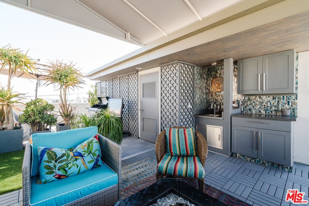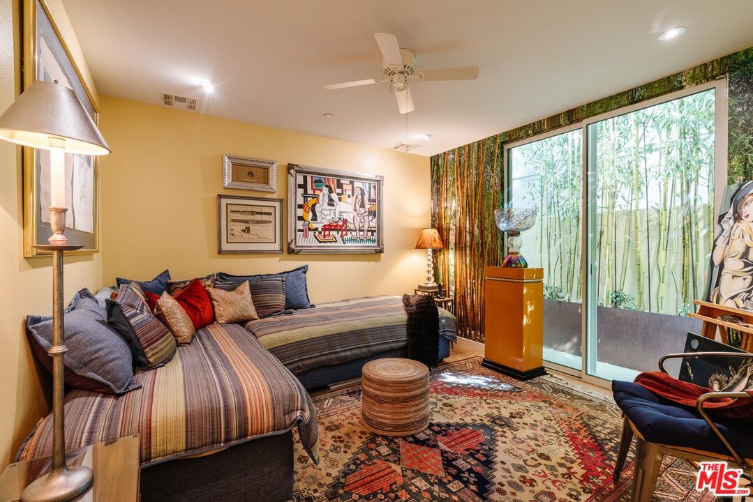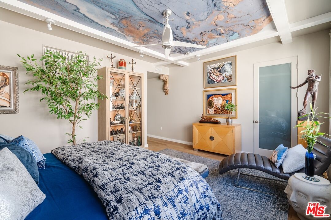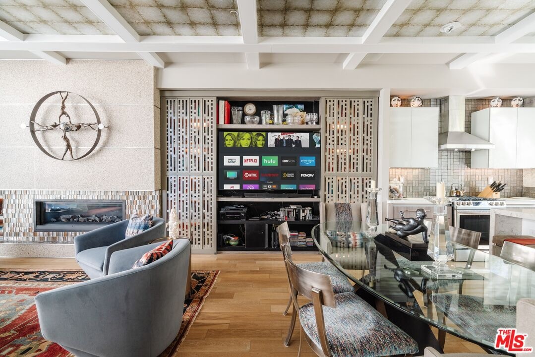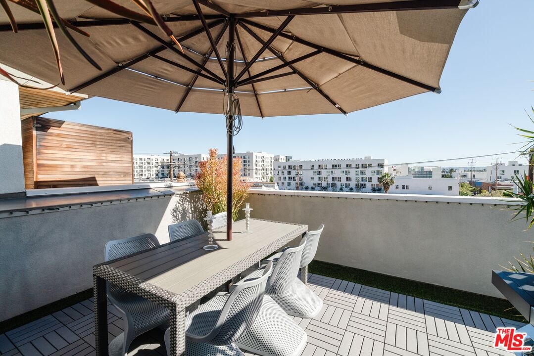 Tucked away on a private gated, brick-paved street, this radiant modern smart home offers both security and serenity in the heart of Hollywood's Media District.From your own oversized, EV-ready two-car garage with storage you step inside to discover the generous two-story gallery-like entry foyer. A stylish bedroom with a full bath and access to a beautifully landscaped lanai perfect as a serene guest suite or sophisticated home office.A graceful, wide staircase leads to the dramatic main floor, where soaring coffered ceilings crown a voluminous great room, seamlessly integrating the open-concept living, dining, with refined built-ins, and chef-inspired kitchen. The kitchen features custom cabinetry, sleek quartz countertops, a large waterfall island, and premium appliances that blend high design with everyday function ideal for both entertaining and intimate evenings at home.Upstairs, you'll find a luxurious primary suite with coffered ceiling and an additional guest suite, currently being used as an office, both offering spa-like bathrooms, generous closet space, and designer finishes that elevate comfort into something extraordinary.Crowning the home is a rooftop terrace your private outdoor sanctuary equipped with a free standing open-sided gable roof large gazebo lounge, bright and breezy under the sun, soothing and exotically inviting under the stars, dining, sink service area, and BBQ areas, all framed by sweeping views of the city skyline, the Hollywood Hills, and its iconic sign. Whether basking in the sun or under the stars, this rooftop retreat is unmatched. Perfectly situated on serene West Hepburn Way, this residence places you just steps from acclaimed restaurants including the Tesla Diner drive-in theater with 75 - V4 Supercharger stalls, premier art galleries, several live theaters and the vibrant pulse of Hollywood all while offering the peace of a tucked-away retreat. Sunlit and airy throughout the day, the home transforms at night into a haven of tranquil, exotic comfort. Rare, radiant, and move-in ready this is a must-see opportunity that won't last.