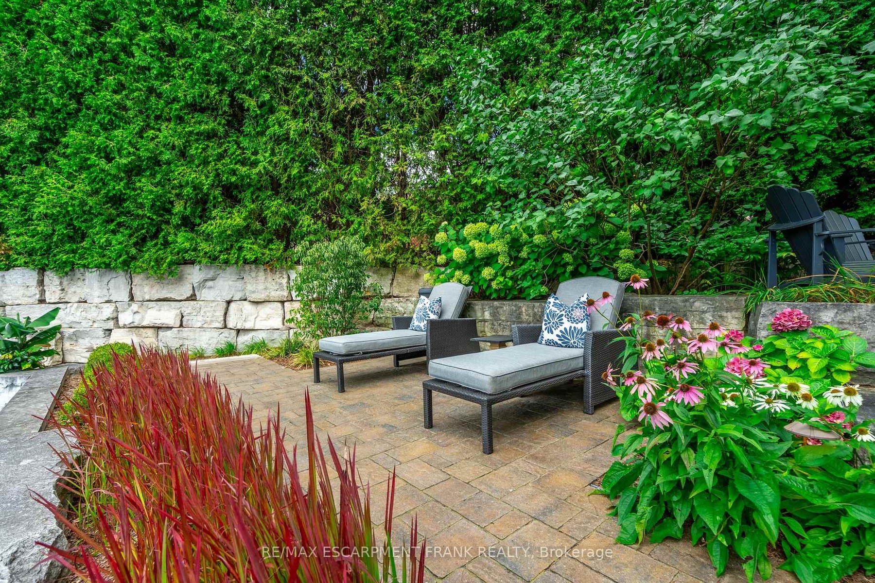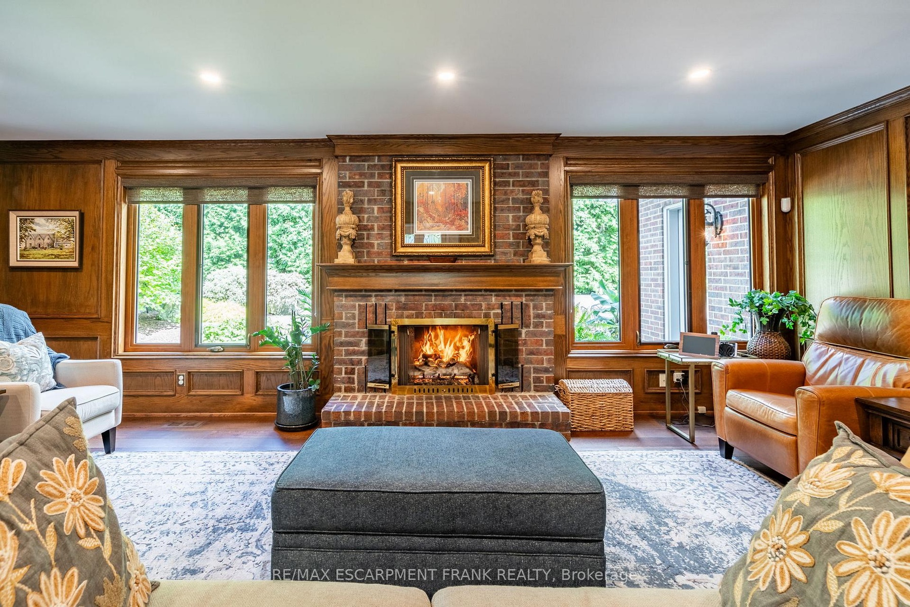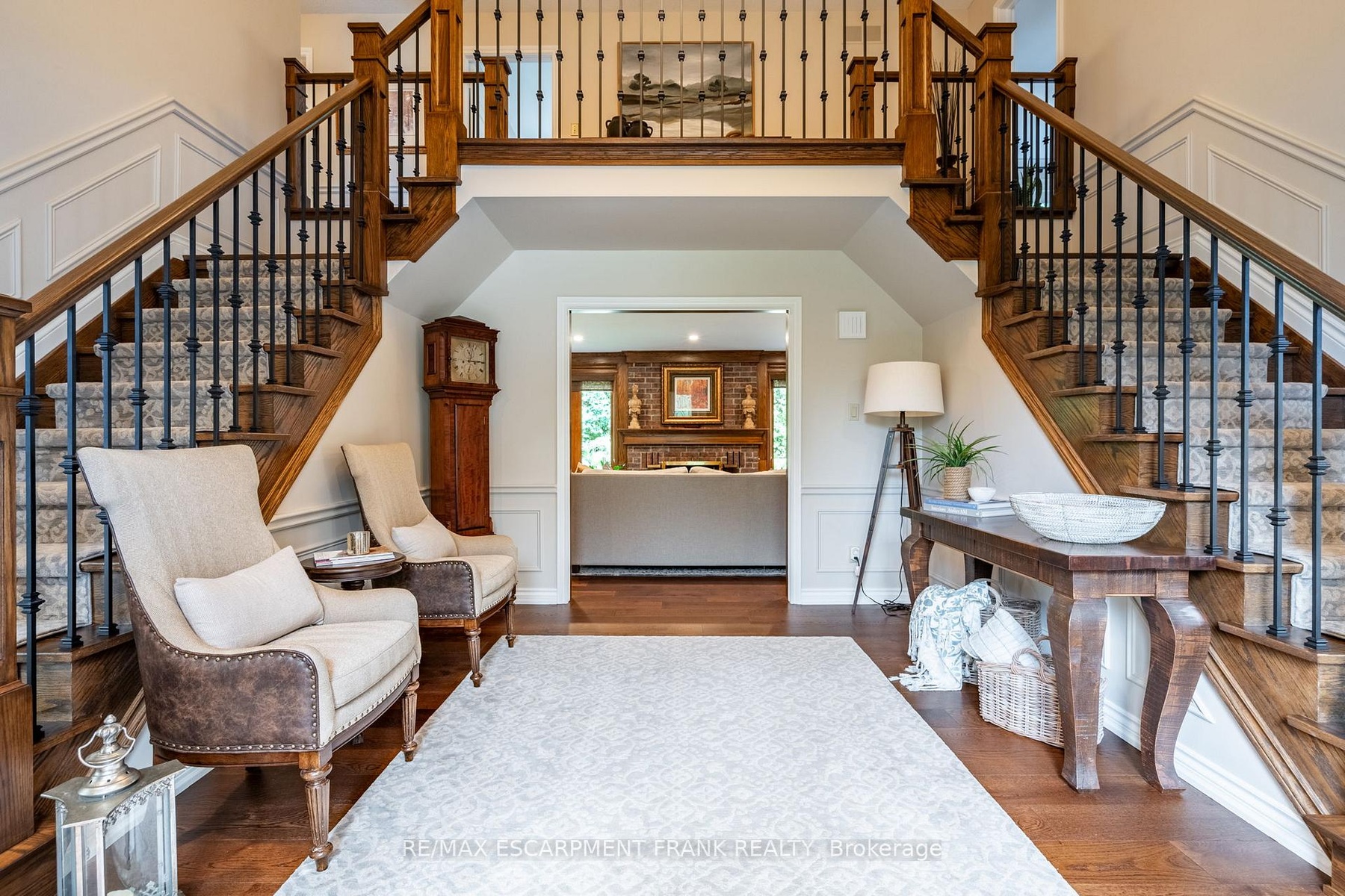 Exceptional Estate in One of Ancaster's most sought-after Neighbourhoods! Just steps from the prestigious Hamilton Golf & Country Club, this remarkable estate offers over 4000sqft above grade of living space on a generous pie-shaped lot w/ lush landscaping, inground pool & a resort-like bckyrd! The approach alone is unforgettable- you're greeted by a picturesque streetscape, grand windows & exterior drs (replaced '11-'15), extensive stonework & landscaping ('14) & an incredible architectural presence. Inside, a stunning dbl staircase (reno'd Spring '21) makes an immediate statement. Beneath the staircase, the elegant great rm feat rich oak wainscoting & a gas fp, creating a warm yet sophisticated gathering space. Main flr hdwd '21. The kitchen, fully reno'd in '21, boasts Cambria quartz countertops & premium Thermador appl. Step outside from the kitch to an extraordinary, bckyrd oasis designed for entertaining! Highlights include two gas fp, multiple outdoor entertaining areas, an impressive L-shaped pool & ample green space for children and pets. Landscaping by Cedar Springs in '11. The main lvl also offers a gracious living rm w/ a wood-burning fp, a formal dining rm, a regal office w/ oak detailing and wainscoting, a 2-pc bthrm and a convenient main-flr lndry rm off the grg w/ heated floors. Upstairs, you'll find 4 generously sized bdrms and 3 full bthrms. The children's rms share a Jack & Jill bthrm reno'd in 15', while the luxurious primary suite feat his-and-hers w/i closets, a spa-like ensuite reno'd in 15' w/ Cambria Quartz countertops, heated flrs, and an add'l gym or private office. The lower lvl offers exceptional versatility, w/ a spacious bdrm, full kitch w/ granite countertops ('15), and a reno'd bthrm w/ heated flrs ('15). With a sep entrance, this lvl is ideal for summer entertaining, pool access, or extended family living. A truly rare offering-private, elegant, and perfectly located-this home delivers timeless design & an unmatched lifestyle.