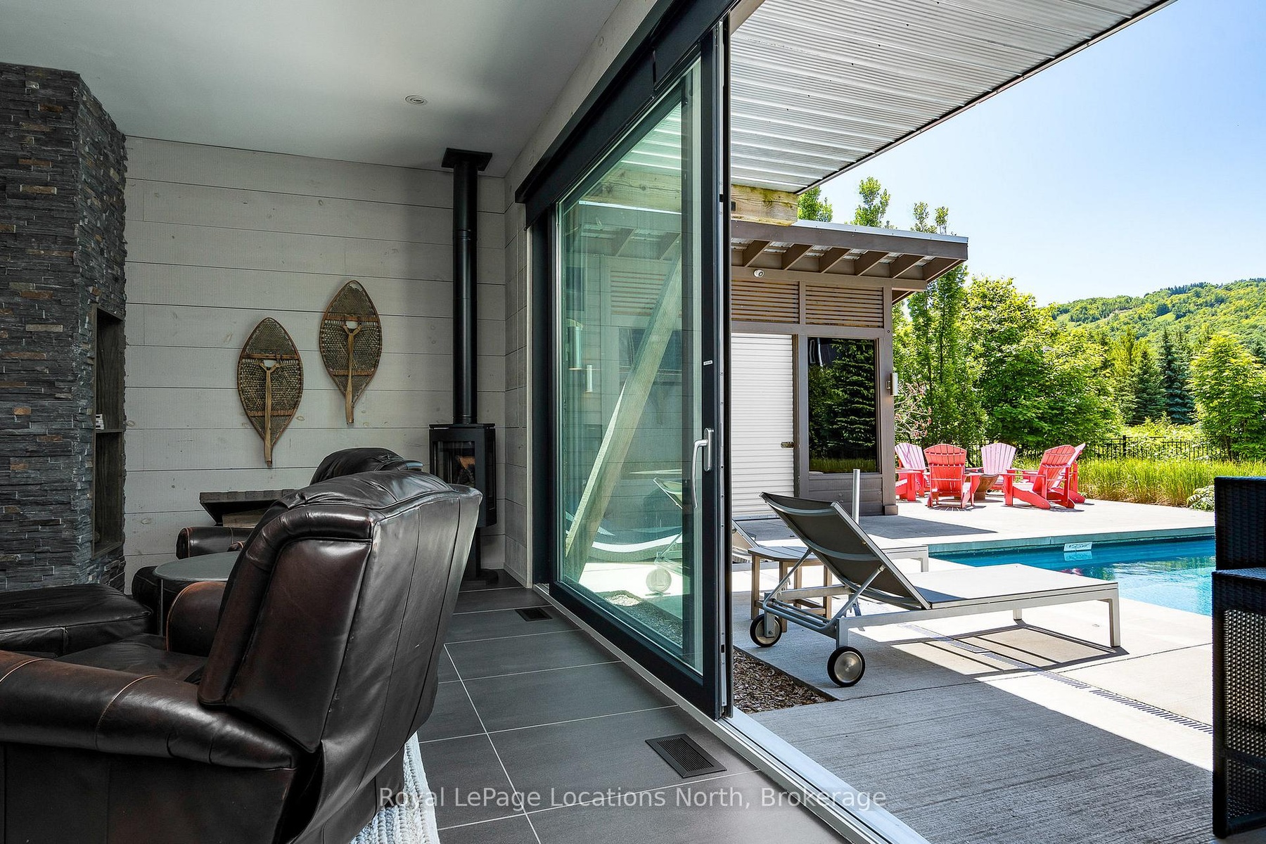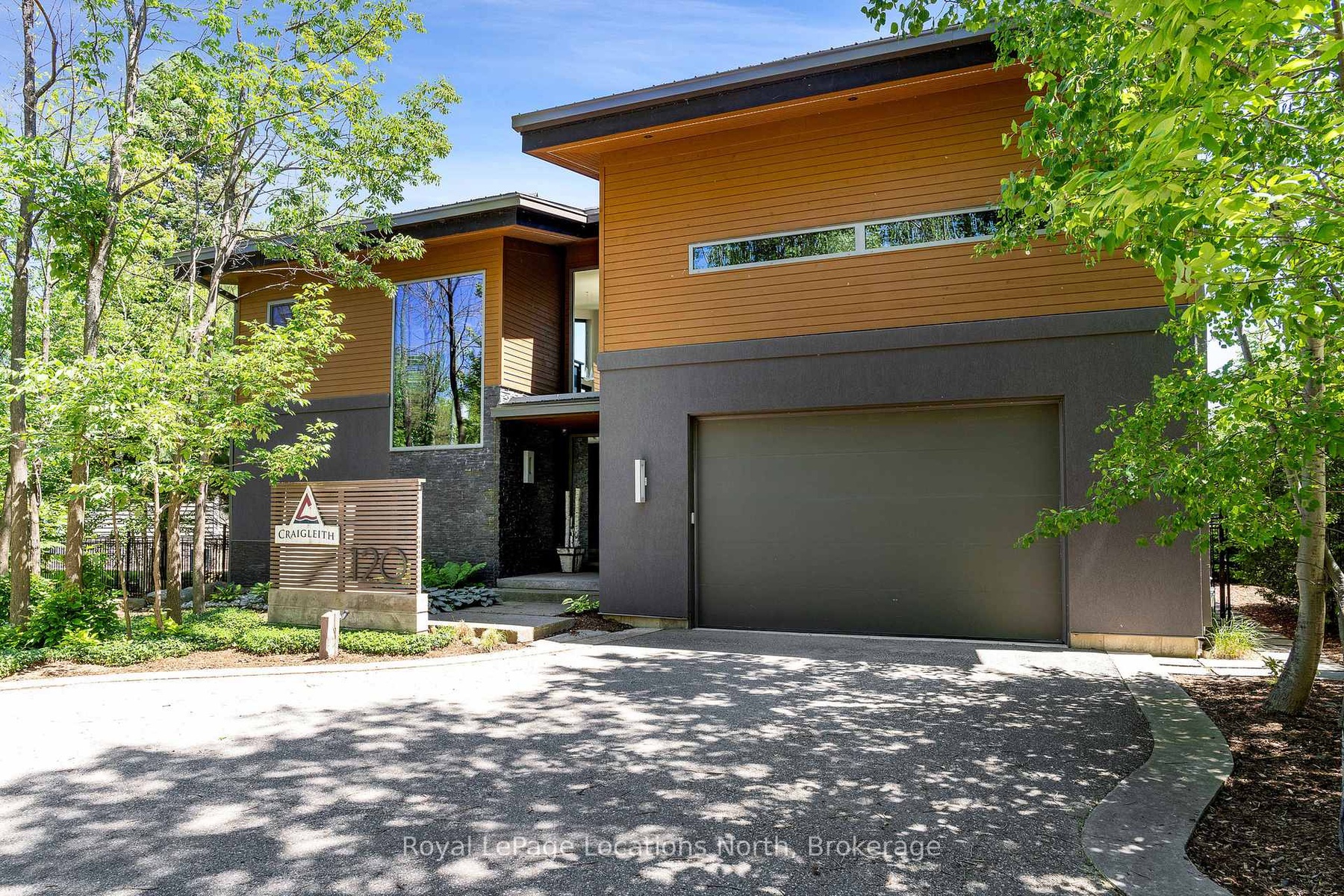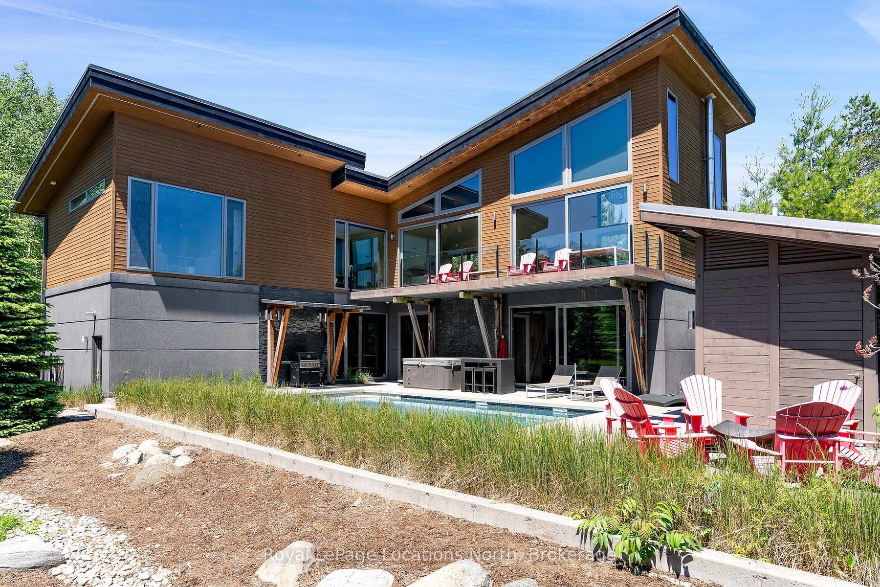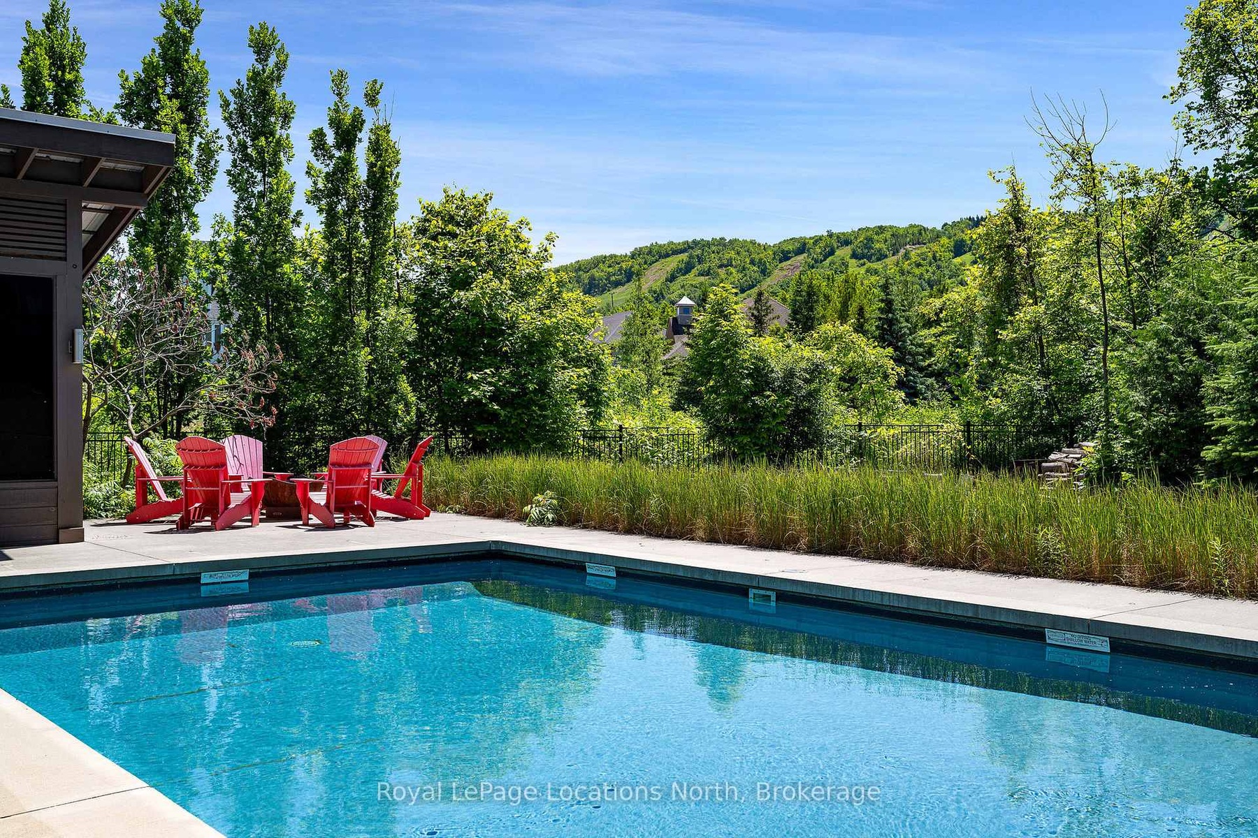An Architecturally Iconic Luxury Ski Chalet, just steps from Craigleith. This celebrated retreat offers a rare balance of total privacy and effortless access, moments from the ski hills and tennis courts. Set on an expansive 100' x 159' lot backing onto tranquil green space, the property is beautifully landscaped to create a true four-season sanctuary. Designed for elevated mountain living, the chalet features a resort-style swimming pool, pool house, and hot tub, all framed by dramatic TILCO lift-and-slide window walls across two levels, capturing sweeping views of the ski hills and grounds beyond. Spanning three levels, the residence offers six luxurious bedrooms and four bathrooms. The upper-level great room is a showpiece, with soaring 22-foot ceilings, a Rumford-style gas fireplace, and a cantilevered walk-out deck-perfect for après-ski gatherings. The chef's kitchen is outfitted with premium appliances, a striking island, and a walk-in pantry, seamlessly blending form and function.The private primary suite occupies the upper level as well, featuring a distinctive walk-in closet and serene views. On the main floor, a sophisticated media lounge opens directly to the pool deck through expansive sliding doors and includes a wet bar / kitchenette, and fireplace, along with two additional bedrooms and full bath. The lower level completes the home with three generously sized bedrooms and another bath, ideal for hosting family and guests. This exceptional ski chalet is offered for immediate possession - an unparalleled opportunity to own a landmark retreat in one of the area's most coveted locations.