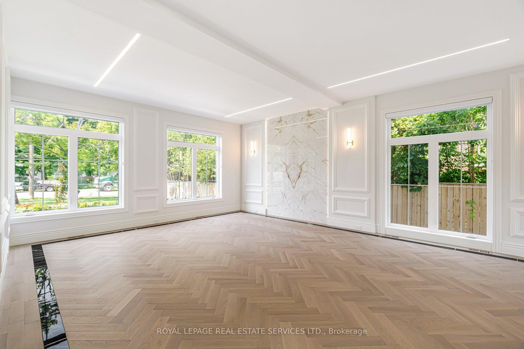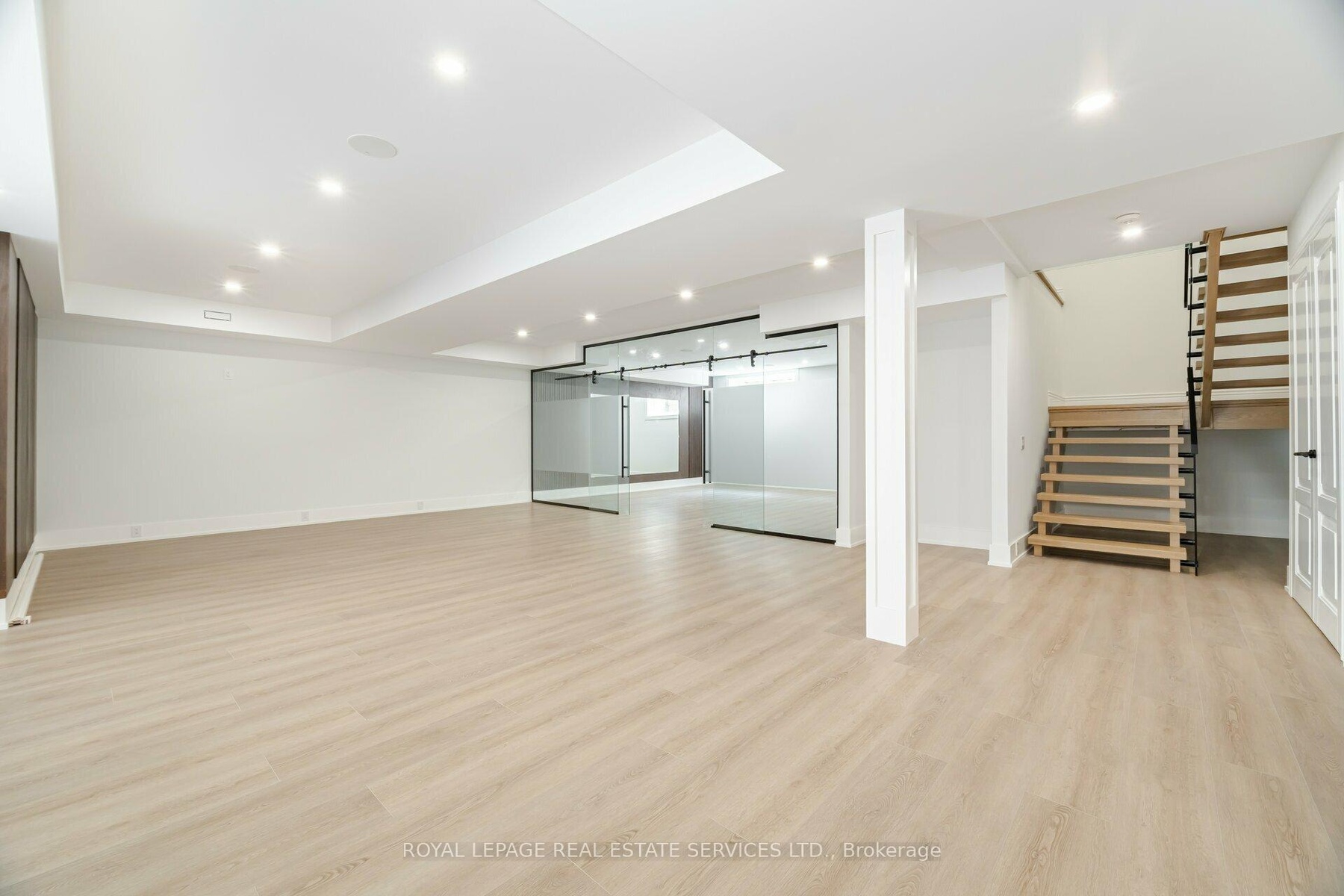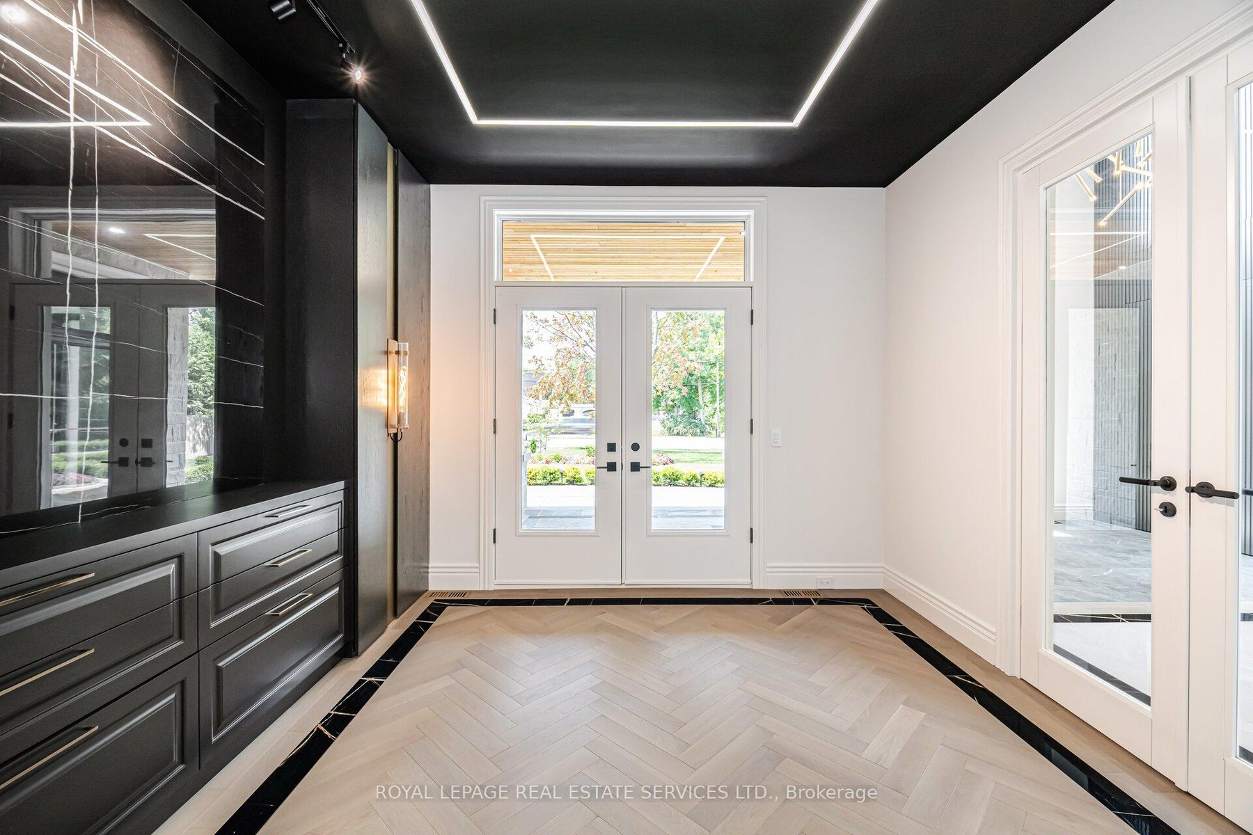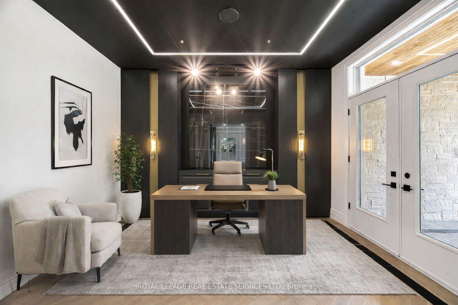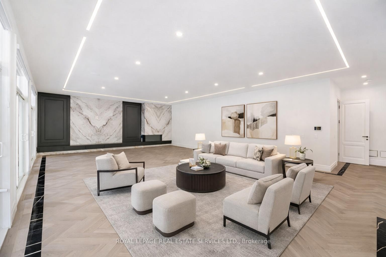 Set on a commanding 112.5'x199.5' lot just steps from the lake, this custom modern-traditional estate offers nearly 11,000SF of finished living space across three levels. A long private drive with parking for up to 12 cars and oversized 3-car garage create a striking arrival, complemented by stone and stucco architecture, soffit lighting, and professionally landscaped grounds. A dramatic double-height foyer introduces the home's scale, anchored by an open-riser staircase with smoked glass panels and integrated lighting. Principal rooms feature tile inlaid borders, herringbone engineered hardwood flooring, oversized windows, and sleek architectural lighting. The chef's kitchen is centred around a 10' quartz island with premium Thermador appliances, bespoke cabinetry, and a dedicated coffee station, flowing seamlessly into the family room with a modern fireplace feature wall, built-in media cabinetry, and multiple walkouts to a covered portico designed for four-season entertaining. A private main-floor office with double French doors and its own exterior entry offers exceptional work-from-home flexibility. Upstairs, four bedroom suites include a luxurious primary retreat with dual walk-in closets and a spa-inspired ensuite featuring a steam shower, freestanding tub, wall-mounted fixtures, and heated floor. The walk-up lower level is designed for lifestyle living with radiant in-floor heating, theatre room, wet bar, glass-enclosed gym, guest suite, pet spa, and extensive storage. Outdoor living is elevated with a rectangular pool and water feature, large-format stone terraces, composite sun deck, covered outdoor fireplace wall with TV rough-in, built-in BBQ station, and pool-house. Smart home technology, multi-zone audio, dual HVAC systems, and security surveillance complete this exceptional Lakeshore Road offering near parks, trails, and Bronte amenities. An outstanding blend of architectural presence, scale, and resort-style living! (some images have virtual staging)