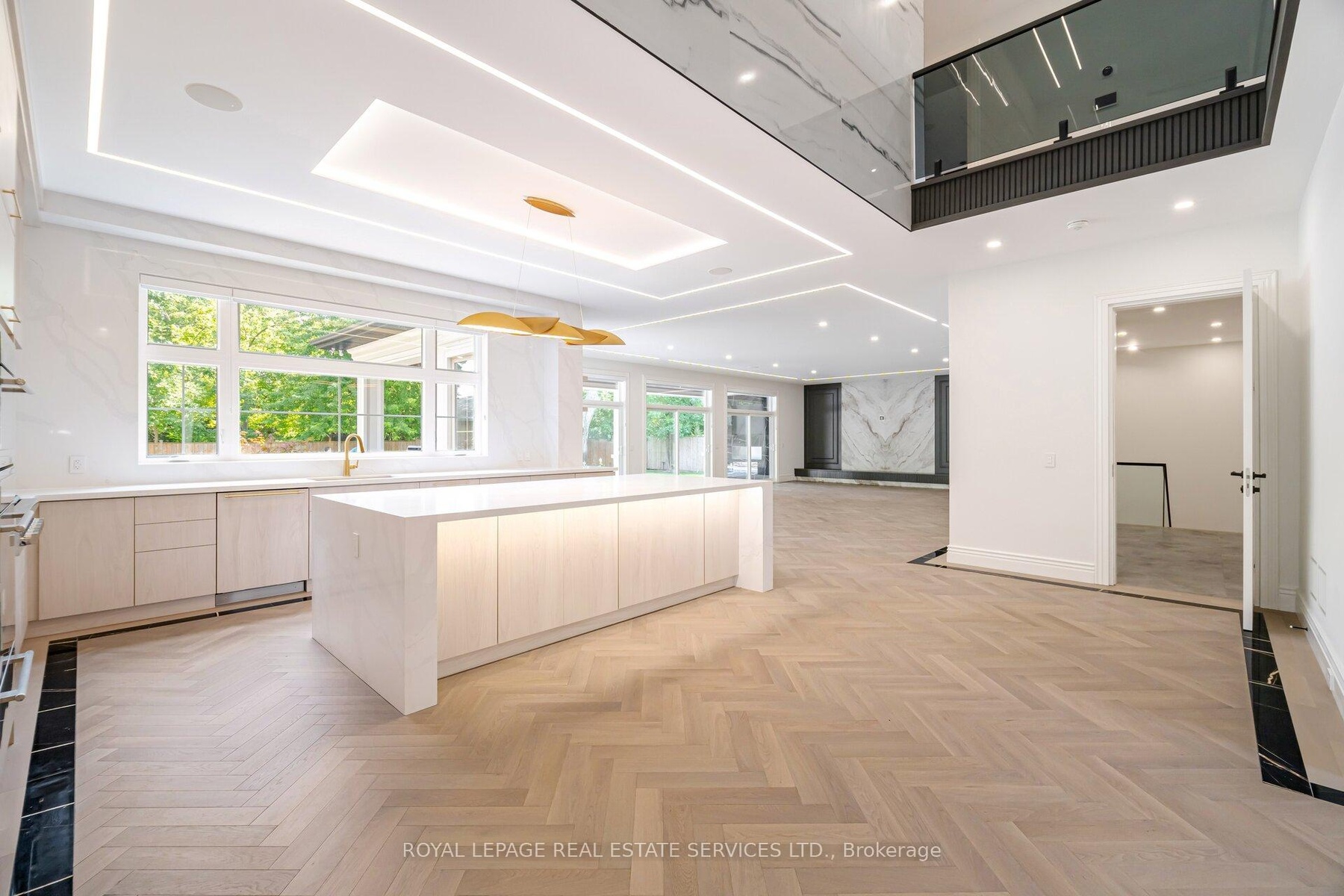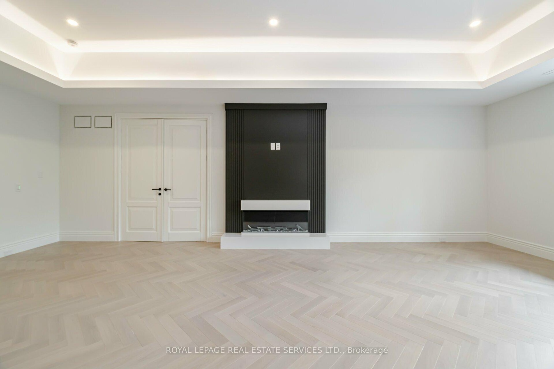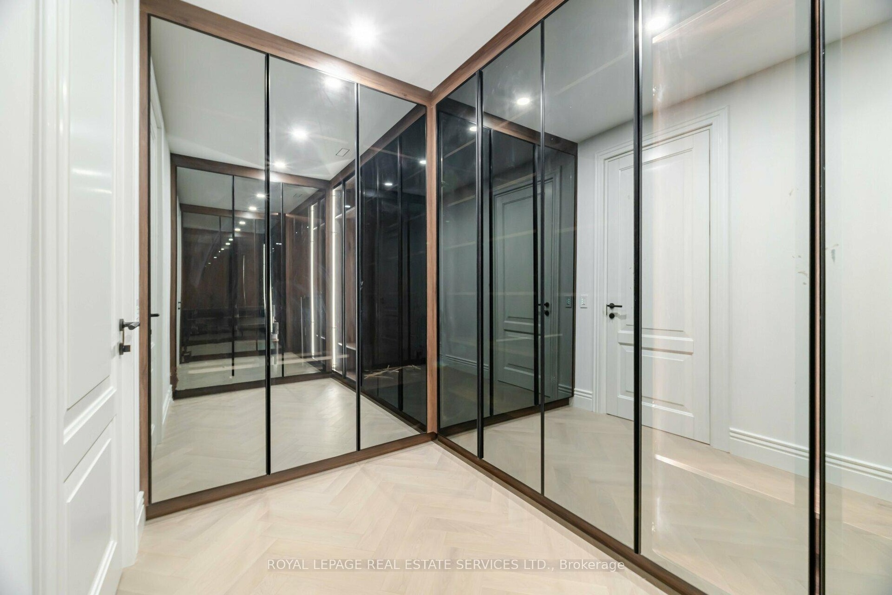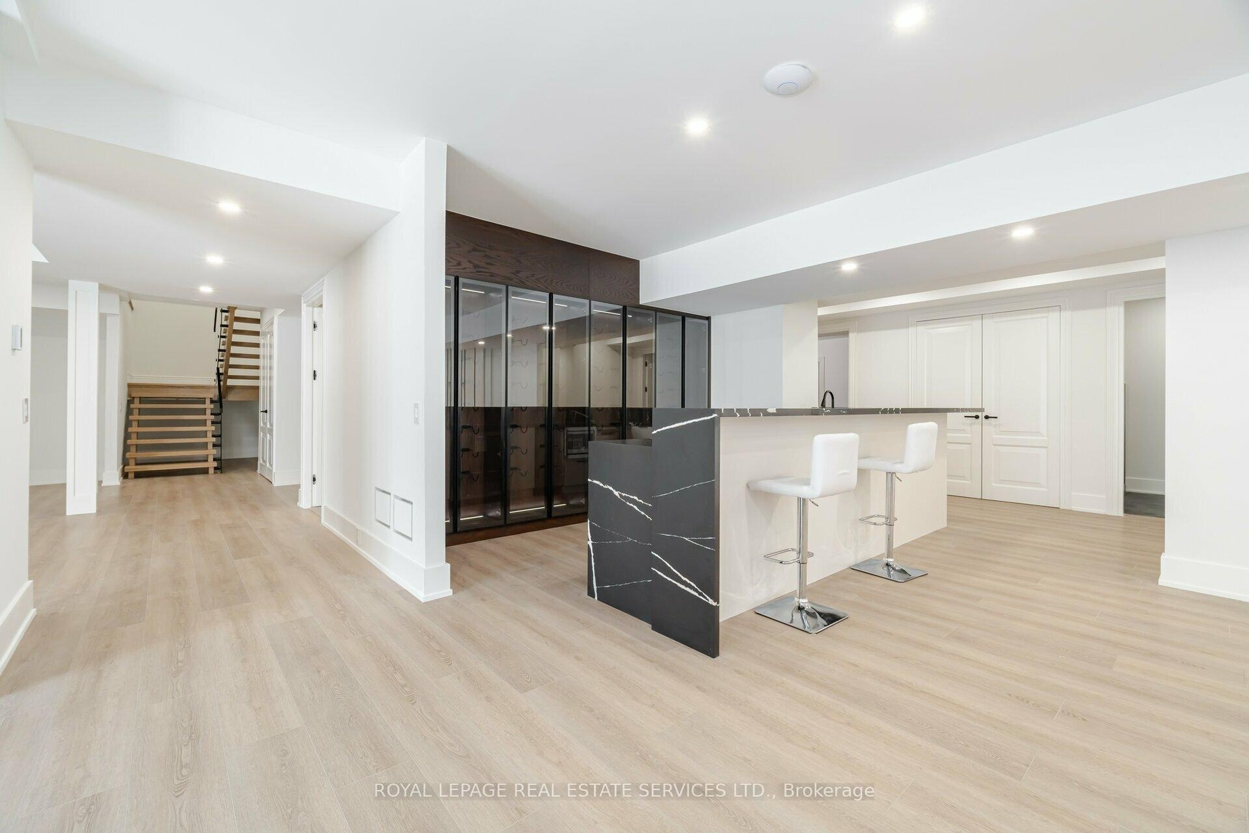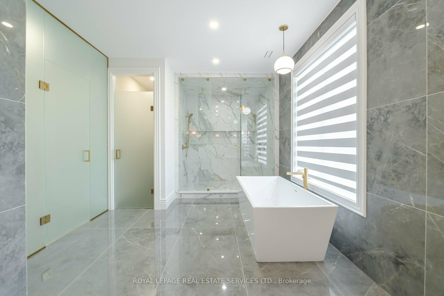 Set on a commanding 112.5'x199.5' lot just steps from the lake, this custom modern-traditional estate offers nearly 11,000SF of finished living space across three levels. A long private drive with parking for up to 12 cars and oversized 3-car garage create a striking arrival, complemented by stone and stucco architecture, soffit lighting, and professionally landscaped grounds. A dramatic double-height foyer introduces the home's scale, anchored by an open-riser staircase with smoked glass panels and integrated lighting. Principal rooms feature tile inlaid borders, herringbone engineered hardwood flooring, oversized windows, and sleek architectural lighting. The chef's kitchen is centred around a 10' quartz island with premium Thermador appliances, bespoke cabinetry, and a dedicated coffee station, flowing seamlessly into the family room with a modern fireplace feature wall, built-in media cabinetry, and multiple walkouts to a covered portico designed for four-season entertaining. A private main-floor office with double French doors and its own exterior entry offers exceptional work-from-home flexibility. Upstairs, four bedroom suites include a luxurious primary retreat with dual walk-in closets and a spa-inspired ensuite featuring a steam shower, freestanding tub, wall-mounted fixtures, and heated floor. The walk-up lower level is designed for lifestyle living with radiant in-floor heating, theatre room, wet bar, glass-enclosed gym, guest suite, pet spa, and extensive storage. Outdoor living is elevated with a rectangular pool and water feature, large-format stone terraces, composite sun deck, covered outdoor fireplace wall with TV rough-in, built-in BBQ station, and pool-house. Smart home technology, multi-zone audio, dual HVAC systems, and security surveillance complete this exceptional Lakeshore Road offering near parks, trails, and Bronte amenities. An outstanding blend of architectural presence, scale, and resort-style living! (some images have virtual staging)