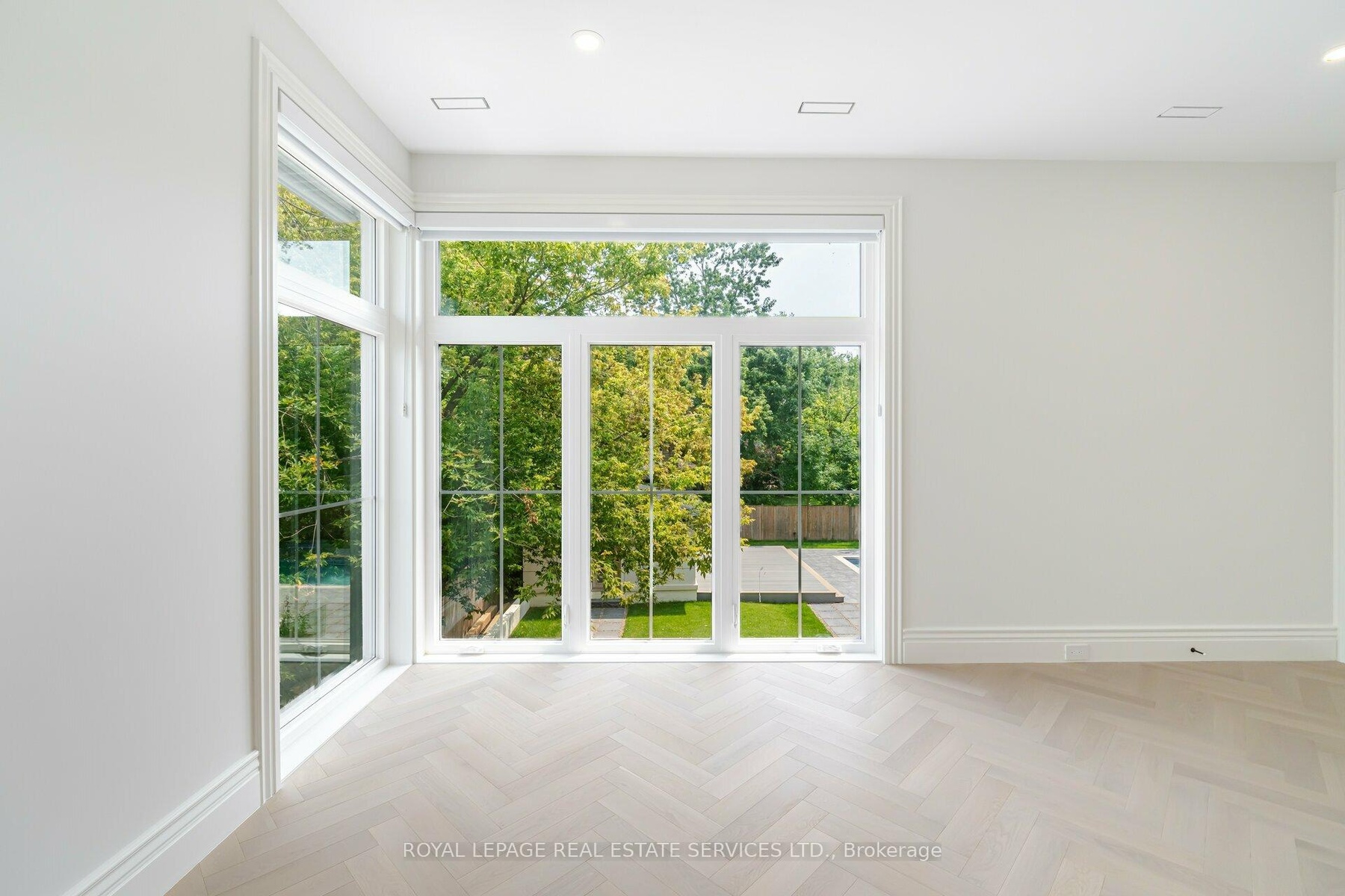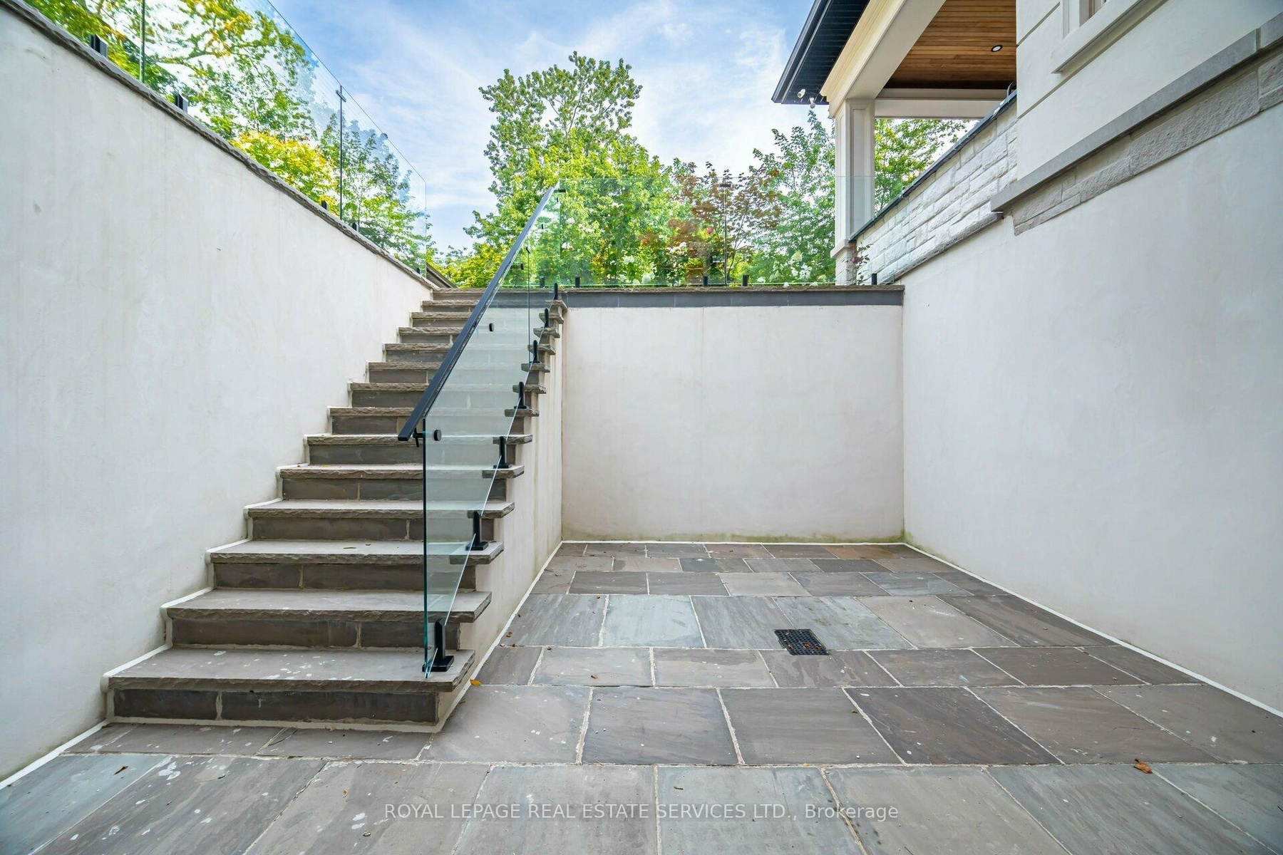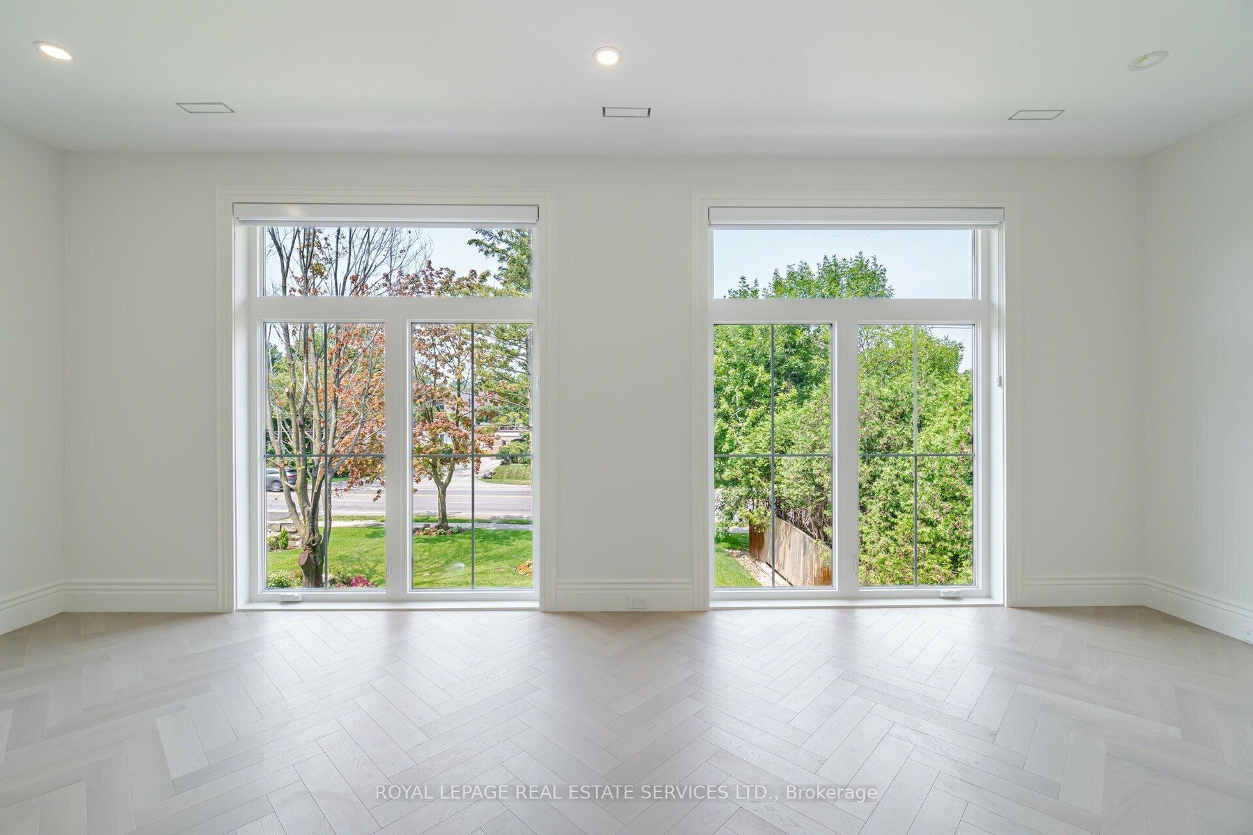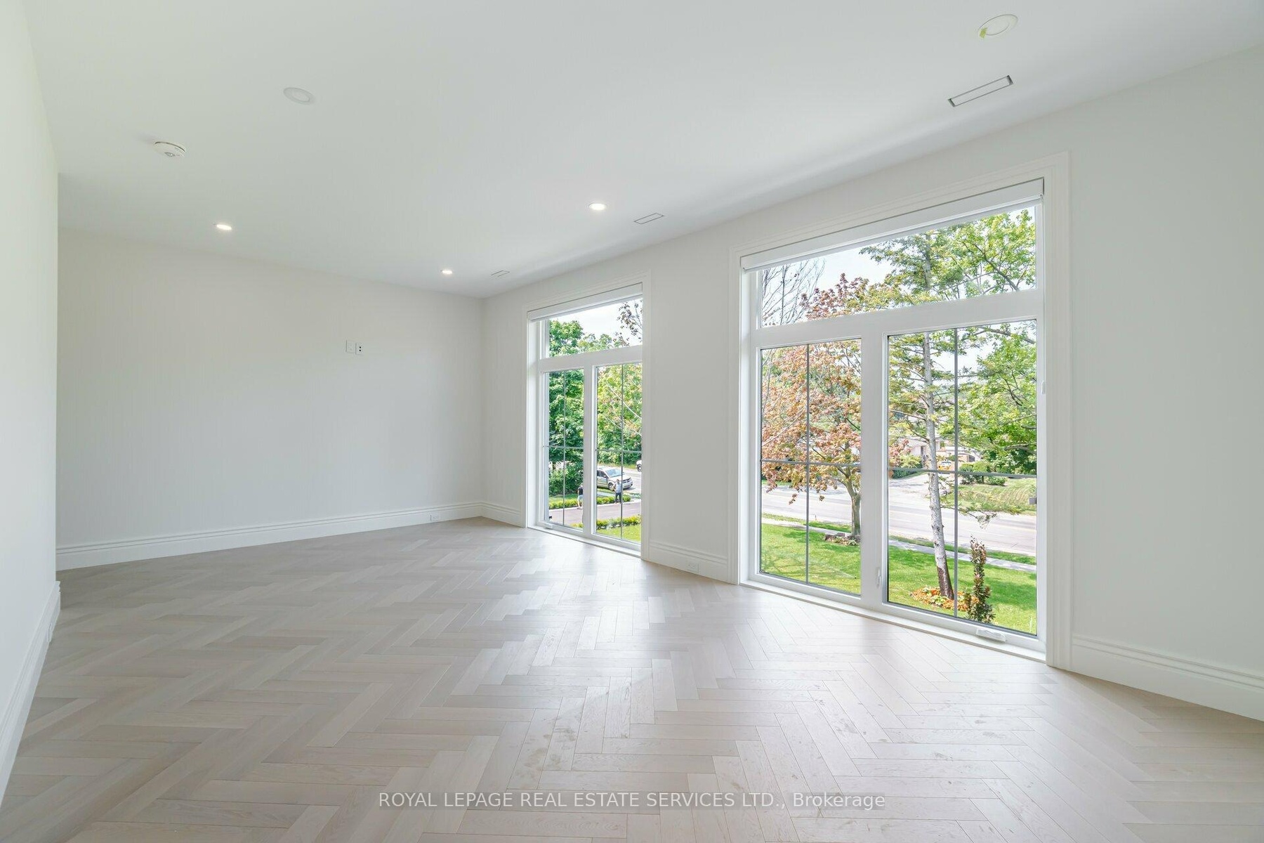 Set on a commanding 112.5'x199.5' lot just steps from the lake, this custom modern-traditional estate offers nearly 11,000SF of finished living space across three levels. A long private drive with parking for up to 12 cars and oversized 3-car garage create a striking arrival, complemented by stone and stucco architecture, soffit lighting, and professionally landscaped grounds. A dramatic double-height foyer introduces the home's scale, anchored by an open-riser staircase with smoked glass panels and integrated lighting. Principal rooms feature tile inlaid borders, herringbone engineered hardwood flooring, oversized windows, and sleek architectural lighting. The chef's kitchen is centred around a 10' quartz island with premium Thermador appliances, bespoke cabinetry, and a dedicated coffee station, flowing seamlessly into the family room with a modern fireplace feature wall, built-in media cabinetry, and multiple walkouts to a covered portico designed for four-season entertaining. A private main-floor office with double French doors and its own exterior entry offers exceptional work-from-home flexibility. Upstairs, four bedroom suites include a luxurious primary retreat with dual walk-in closets and a spa-inspired ensuite featuring a steam shower, freestanding tub, wall-mounted fixtures, and heated floor. The walk-up lower level is designed for lifestyle living with radiant in-floor heating, theatre room, wet bar, glass-enclosed gym, guest suite, pet spa, and extensive storage. Outdoor living is elevated with a rectangular pool and water feature, large-format stone terraces, composite sun deck, covered outdoor fireplace wall with TV rough-in, built-in BBQ station, and pool-house. Smart home technology, multi-zone audio, dual HVAC systems, and security surveillance complete this exceptional Lakeshore Road offering near parks, trails, and Bronte amenities. An outstanding blend of architectural presence, scale, and resort-style living! (some images have virtual staging)