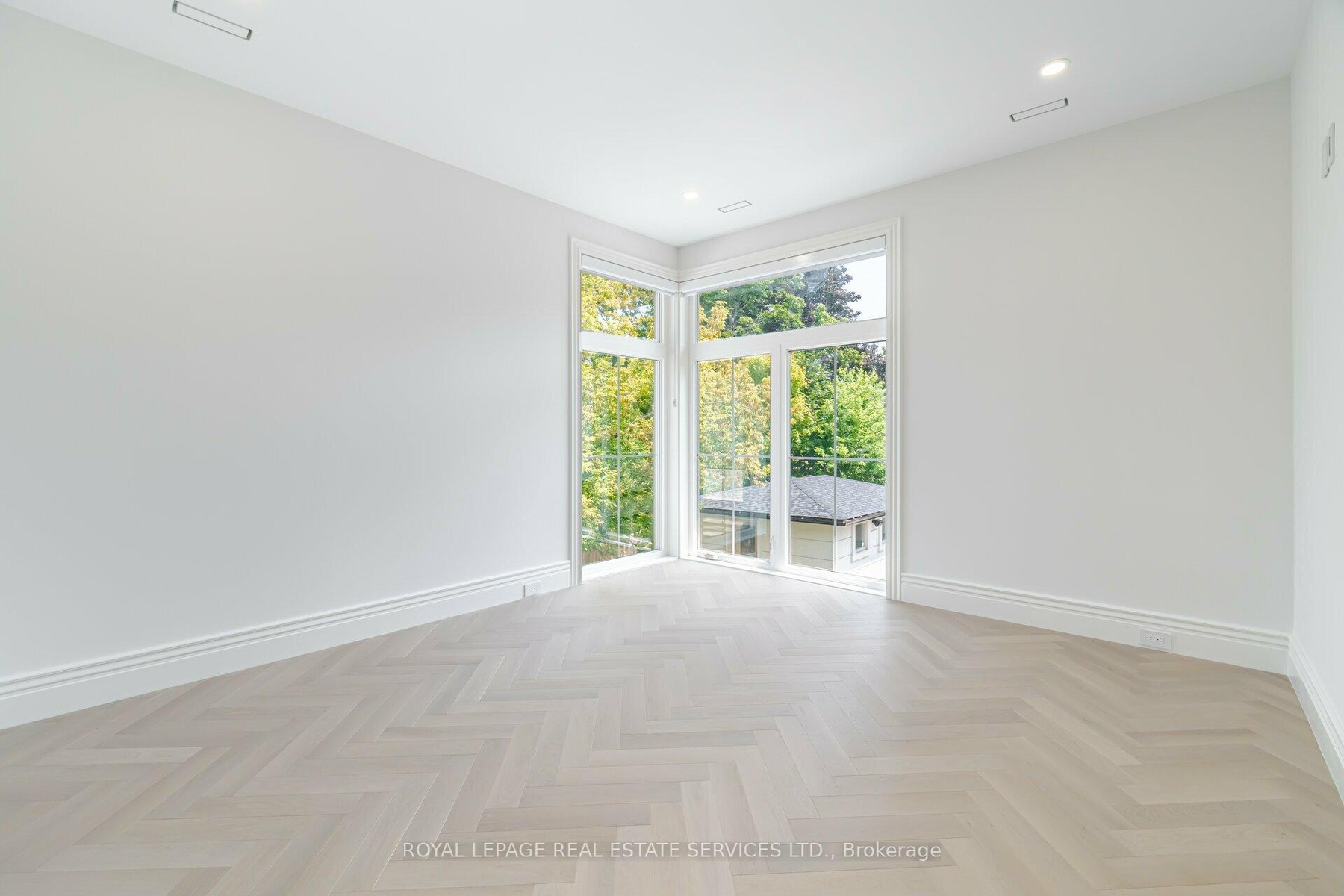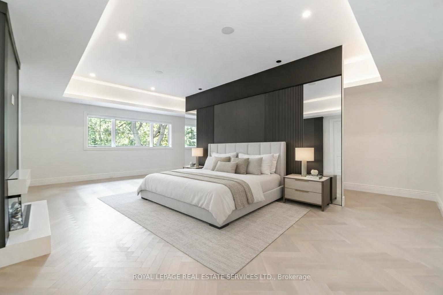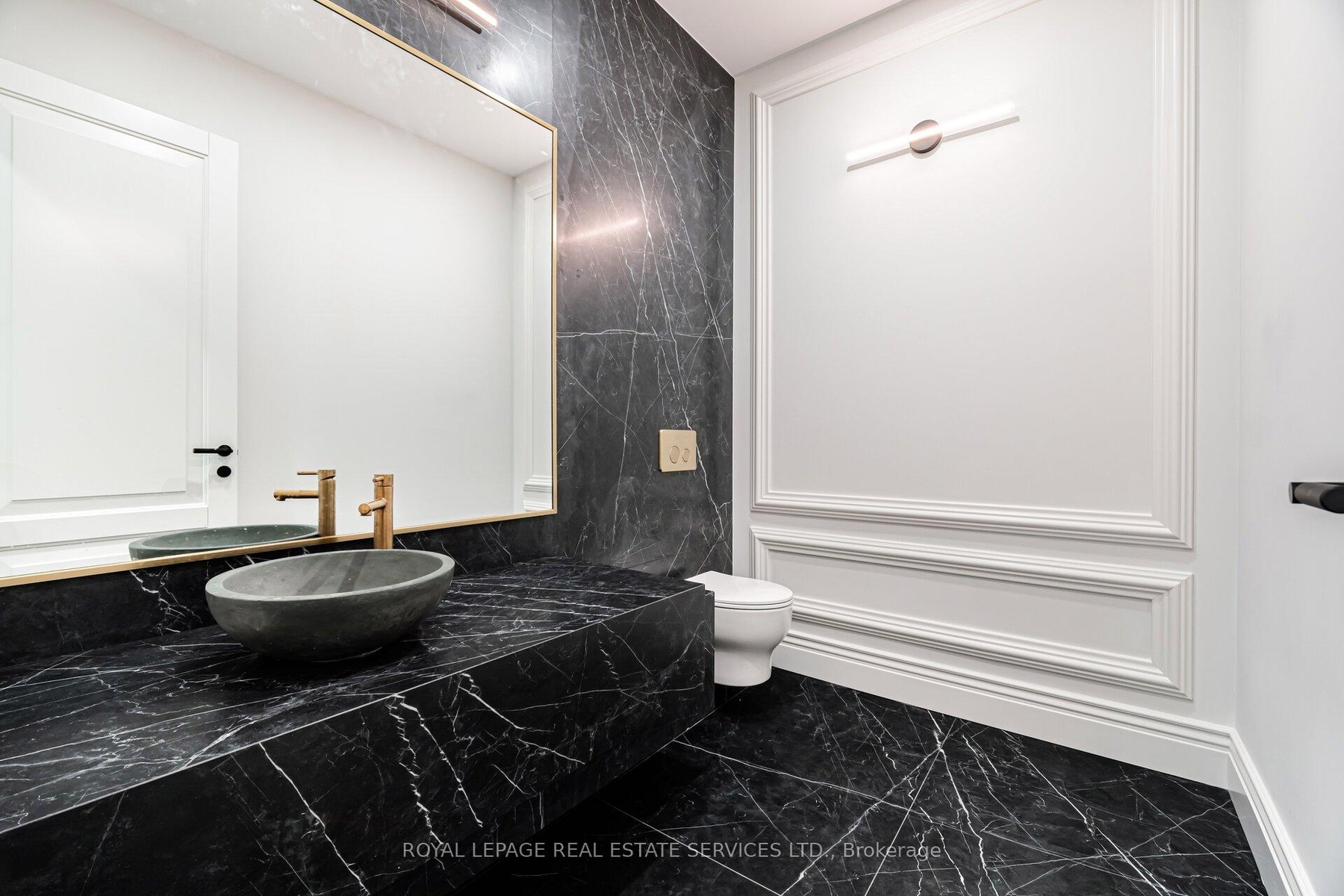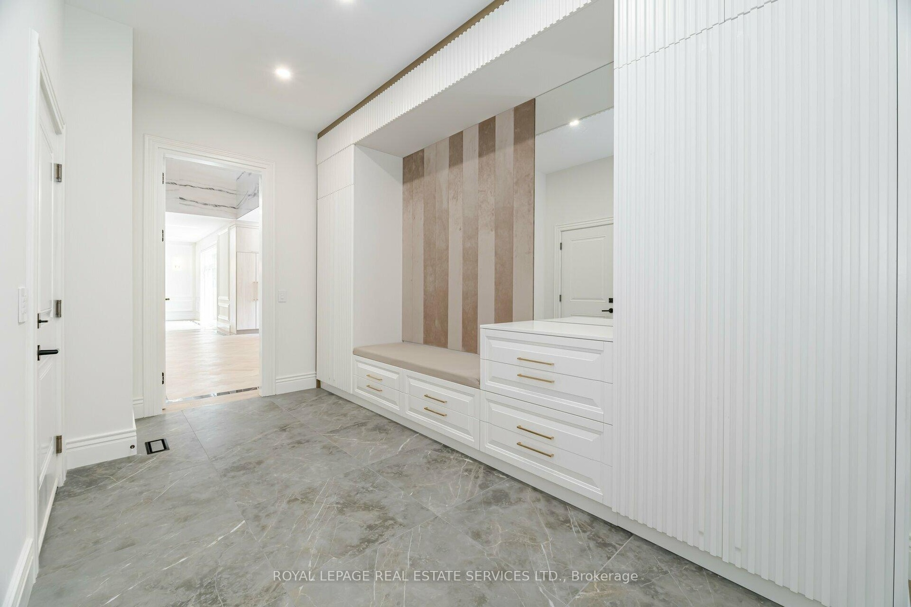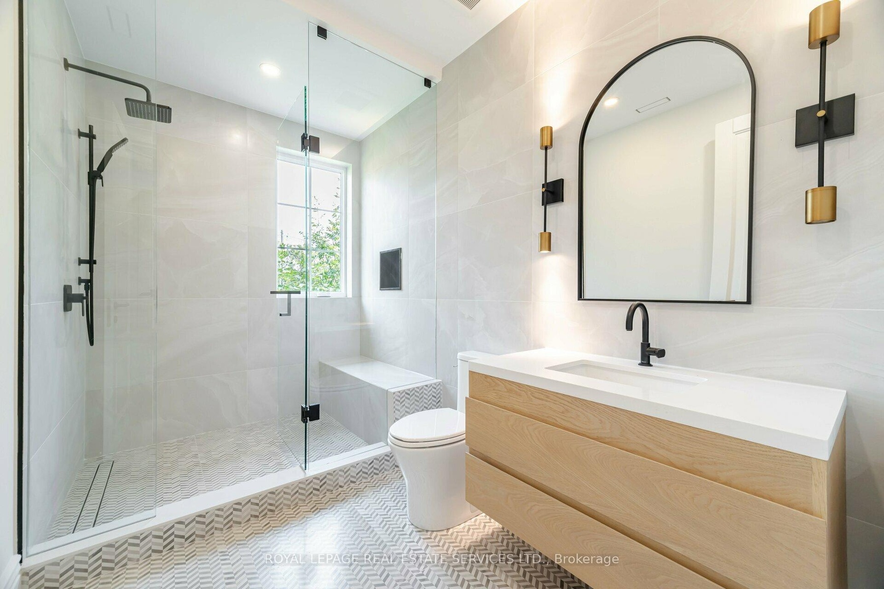 Set on a commanding 112.5'x199.5' lot just steps from the lake, this custom modern-traditional estate offers nearly 11,000SF of finished living space across three levels. A long private drive with parking for up to 12 cars and oversized 3-car garage create a striking arrival, complemented by stone and stucco architecture, soffit lighting, and professionally landscaped grounds. A dramatic double-height foyer introduces the home's scale, anchored by an open-riser staircase with smoked glass panels and integrated lighting. Principal rooms feature tile inlaid borders, herringbone engineered hardwood flooring, oversized windows, and sleek architectural lighting. The chef's kitchen is centred around a 10' quartz island with premium Thermador appliances, bespoke cabinetry, and a dedicated coffee station, flowing seamlessly into the family room with a modern fireplace feature wall, built-in media cabinetry, and multiple walkouts to a covered portico designed for four-season entertaining. A private main-floor office with double French doors and its own exterior entry offers exceptional work-from-home flexibility. Upstairs, four bedroom suites include a luxurious primary retreat with dual walk-in closets and a spa-inspired ensuite featuring a steam shower, freestanding tub, wall-mounted fixtures, and heated floor. The walk-up lower level is designed for lifestyle living with radiant in-floor heating, theatre room, wet bar, glass-enclosed gym, guest suite, pet spa, and extensive storage. Outdoor living is elevated with a rectangular pool and water feature, large-format stone terraces, composite sun deck, covered outdoor fireplace wall with TV rough-in, built-in BBQ station, and pool-house. Smart home technology, multi-zone audio, dual HVAC systems, and security surveillance complete this exceptional Lakeshore Road offering near parks, trails, and Bronte amenities. An outstanding blend of architectural presence, scale, and resort-style living! (some images have virtual staging)