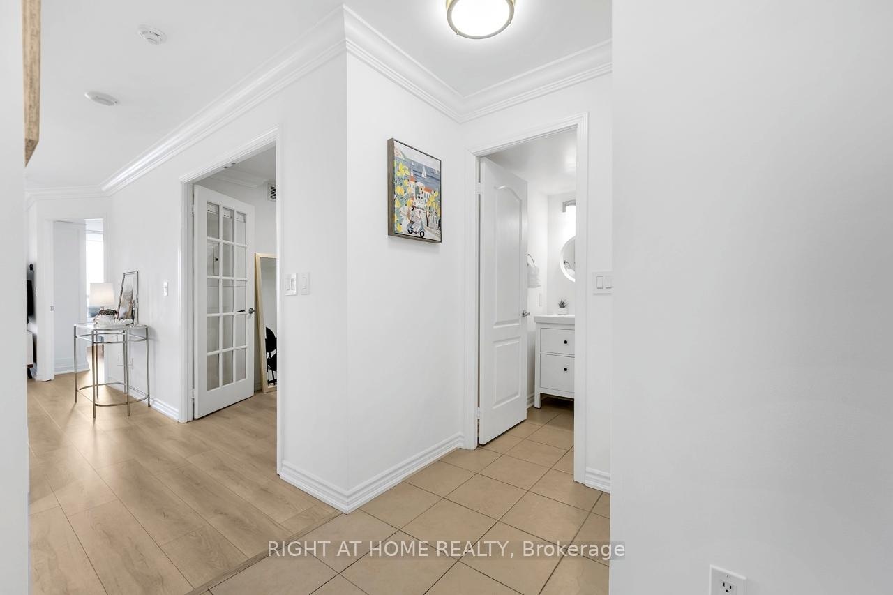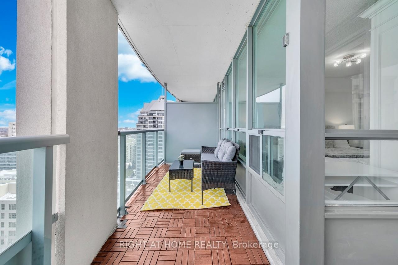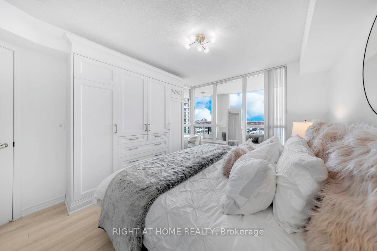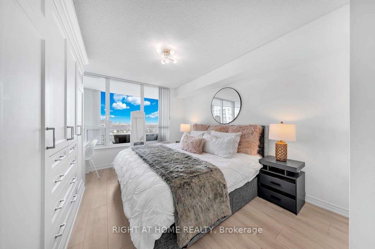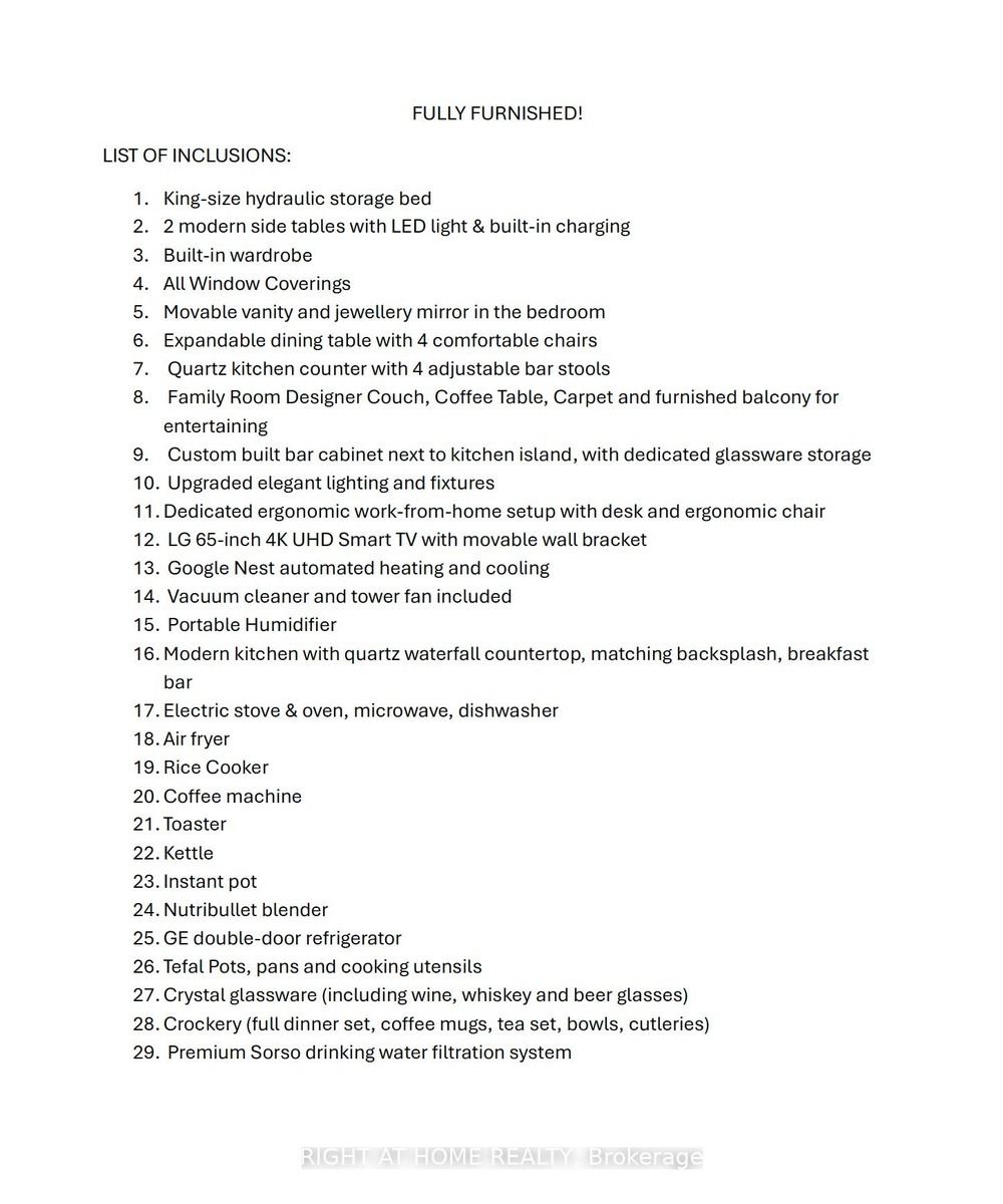 FULLY FURNISHED! Welcome To Your Completely Furnished Home That Includes Everything You Need To Live Comfortably; Just Move-In! This condo is a haven of brightness and space, filled with natural light throughout the day for a welcoming atmosphere. The large primary bedroom features wraparound windows that offer stunning views and a serene retreat, complete with a king-size hydraulic storage bed for optimal comfort and clever storage solutions. Enjoy the luxury of a primary ensuite bathroom plus a separate full bathroom for guests, ensuring privacy for everyone. Additional bedroom amenities include two modern side tables with LED lights and built-in charging, a built-in wardrobe, and a movable vanity with a jewelry mirror. The large den can serve as a second bedroom or a versatile work-from-home setup, equipped with French doors and privacy blinds. Storage is exceptional, thanks to a custom storage cabinet, a dedicated laundry area with built-in pantry storage, and a separate coat and shoe closet. Step out to the oversized private balcony for sweeping panoramic views, perfect for relaxing or enjoying the outdoors. The open living and dining layout is ideal for hosting gatherings, with an expandable dining table and four comfortable chairs that accommodate friends and family effortlessly. A quartz kitchen counter with four adjustable bar stools serves as a stylish focal point, while the cozy seating area and furnished balcony provide enchanting spots for entertaining. Enhance your events with a custom built bar cabinet next to the kitchen island, featuring dedicated glassware storage. Upgraded elegant lighting and fixtures add a touch of sophistication throughout, making every occasion feel special. Stay productive and comfortable with a dedicated ergonomic work-from-home setup, including a desk and ergonomic chair for all-day focus. Entertainment is elevated with an LG 65-inch 4K UHD Smart TV on a movable wall bracket, while Google Nest automated heating and cooling.