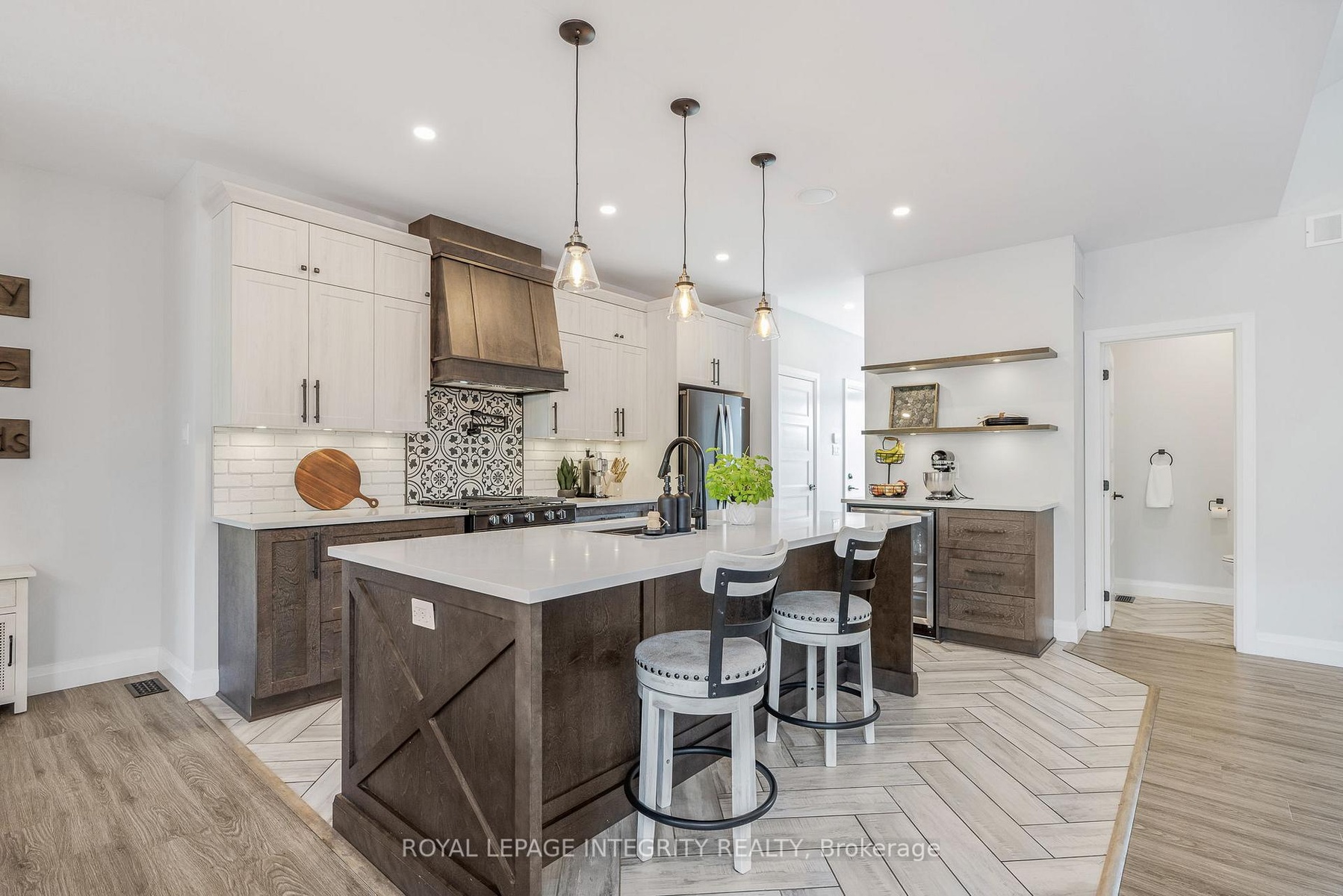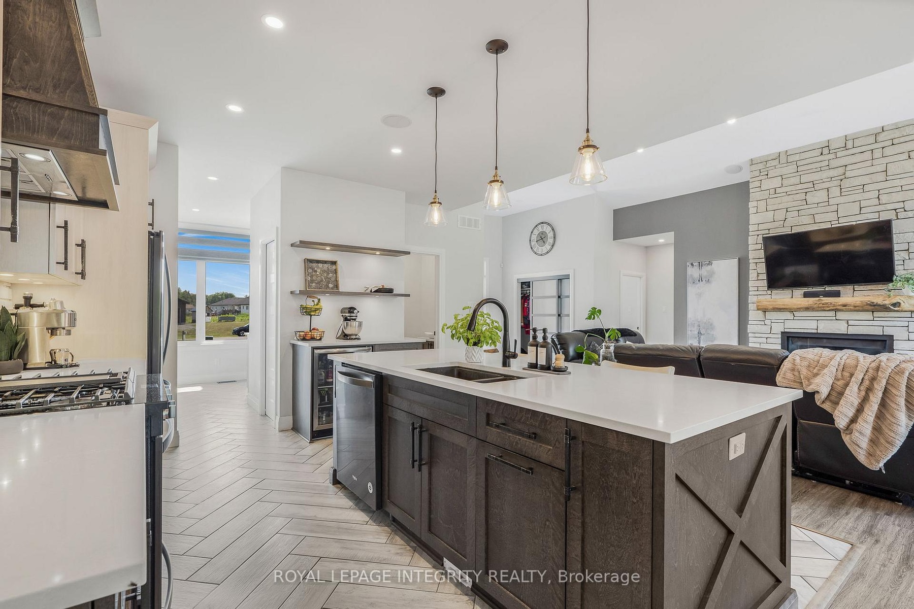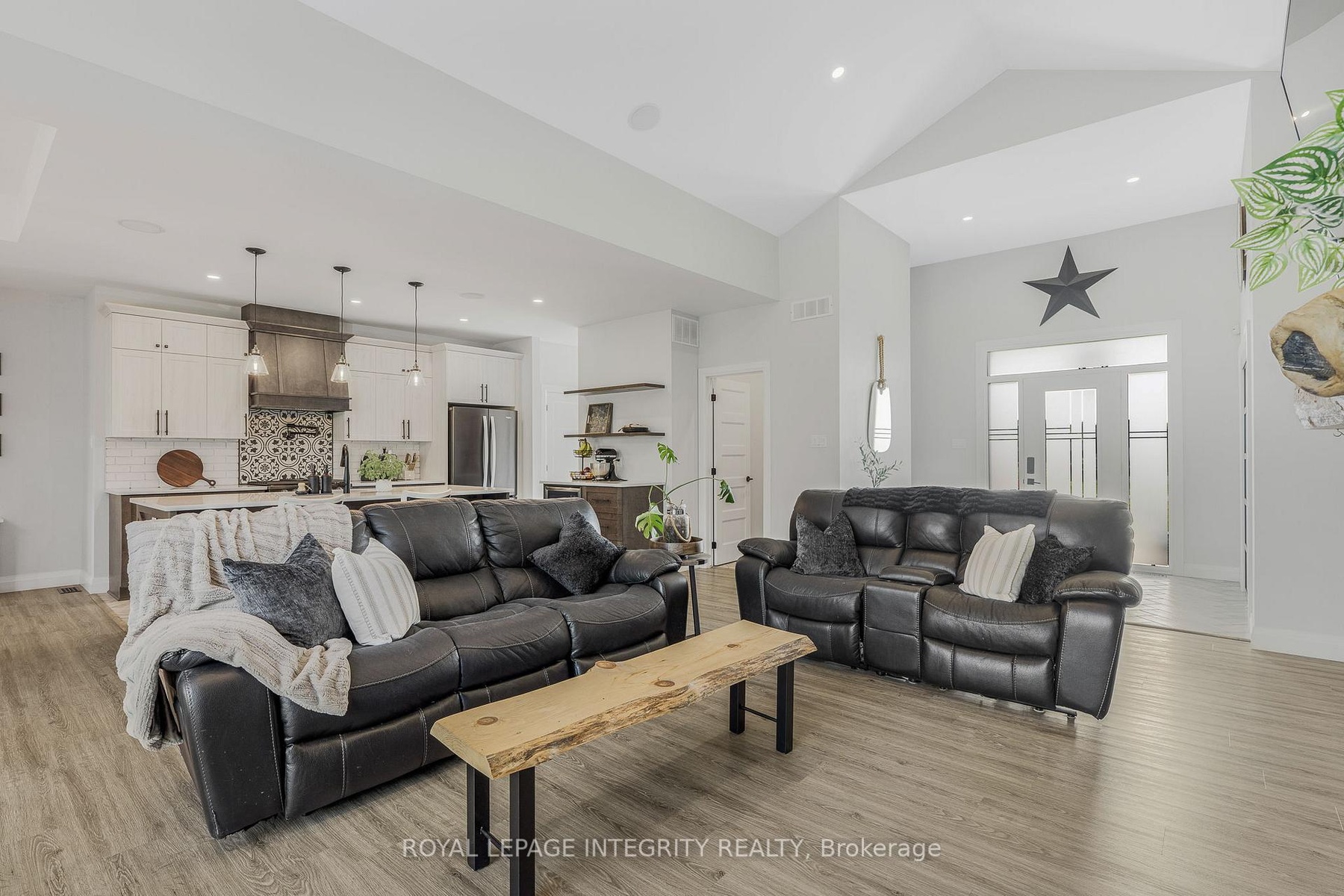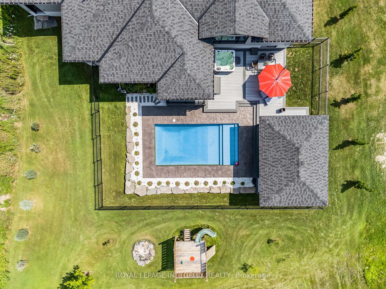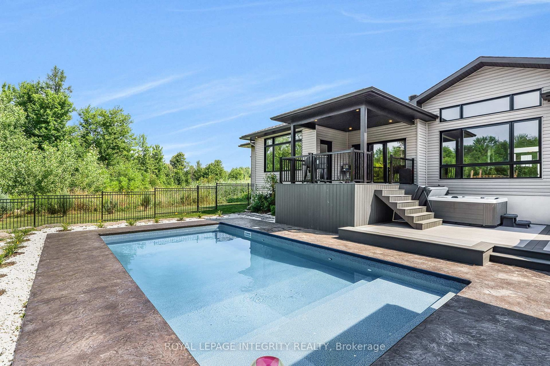 Welcome to this exceptional 3+1 bedroom, 3.5 bathroom custom-built bungalow, thoughtfully designed with high-end finishes and modern comfort in mind. Set on a private, landscaped lot, this home offers a perfect blend of style, function, and serenity. The open-concept main level features vaulted ceilings, wide plank flooring, and oversized windows that flood the space with natural light. The chefs kitchen impresses with quartz countertops, two-tone cabinetry, a statement backsplash, and a large island ideal for both cooking and entertaining. The primary suite is a true retreat with a luxurious ensuite boasting a freestanding soaker tub, walk-in shower with custom tile, and expansive windows with views of nature. The fully finished basement adds a spacious recreation room, a fourth bedroom, full bath, and room for a gym or office. Step outside to your own private oasis: a beautifully fenced yard with an inground pool, hot tub, and multi-level composite deck, offering the perfect setting for relaxation or entertaining. Complete with an oversized three-car garage, paved driveway, and surrounded by greenery, this property offers refined living in a peaceful, family-friendly location just minutes to local amenities.