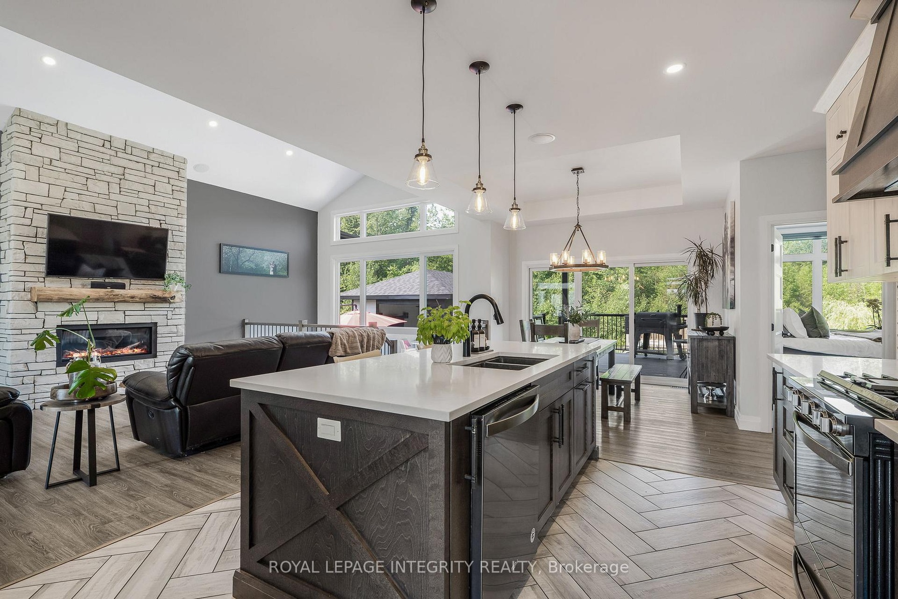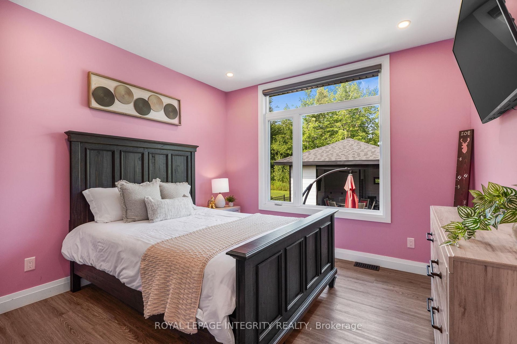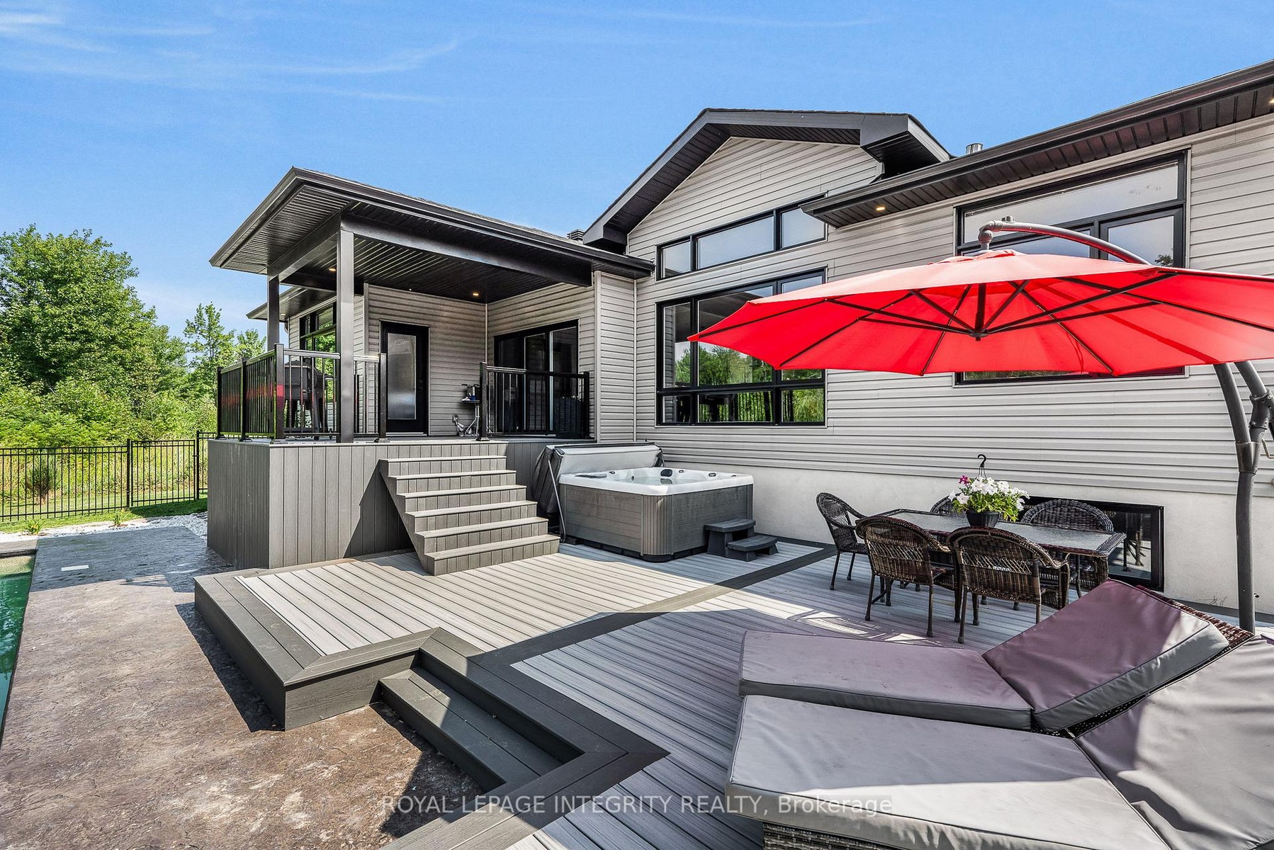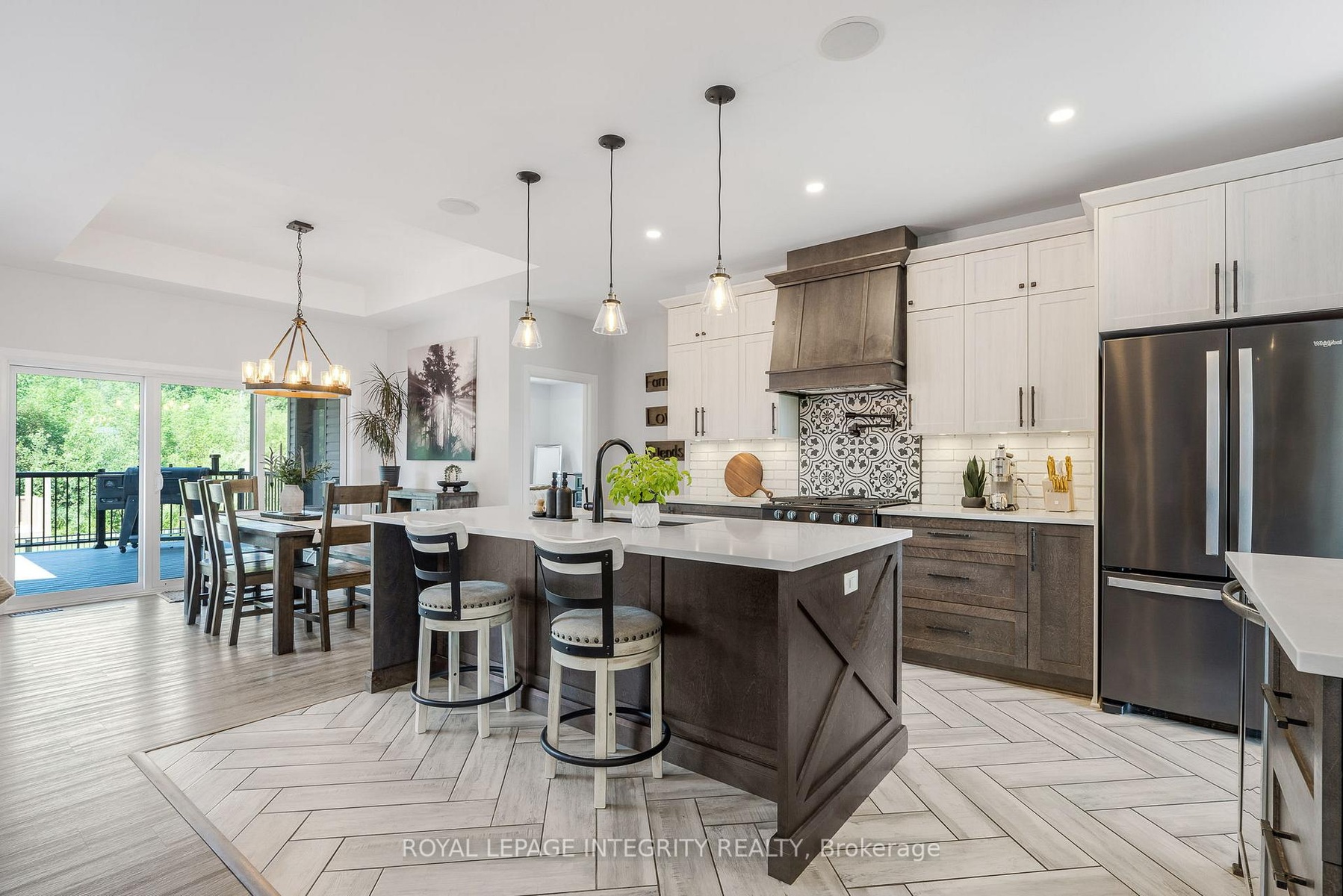 Welcome to this exceptional 3+1 bedroom, 3.5 bathroom custom-built bungalow, thoughtfully designed with high-end finishes and modern comfort in mind. Set on a private, landscaped lot, this home offers a perfect blend of style, function, and serenity. The open-concept main level features vaulted ceilings, wide plank flooring, and oversized windows that flood the space with natural light. The chefs kitchen impresses with quartz countertops, two-tone cabinetry, a statement backsplash, and a large island ideal for both cooking and entertaining. The primary suite is a true retreat with a luxurious ensuite boasting a freestanding soaker tub, walk-in shower with custom tile, and expansive windows with views of nature. The fully finished basement adds a spacious recreation room, a fourth bedroom, full bath, and room for a gym or office. Step outside to your own private oasis: a beautifully fenced yard with an inground pool, hot tub, and multi-level composite deck, offering the perfect setting for relaxation or entertaining. Complete with an oversized three-car garage, paved driveway, and surrounded by greenery, this property offers refined living in a peaceful, family-friendly location just minutes to local amenities.