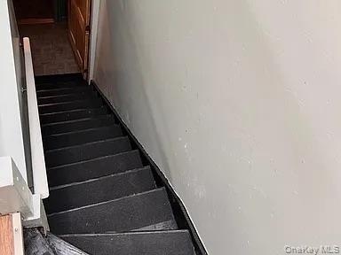 Each bedroom offers its own distinct character. All sleeping areas maintain simple, unfurnished designs with open closet spaces and light-colored walls, providing flexibility for personalization. A carpeted staircase provides access to a functional lower level, adding flexible space for storage, a home office, or additional living areas. The sensible layout flows naturally from entry through living spaces and bedrooms, connected by a practical hallway system.