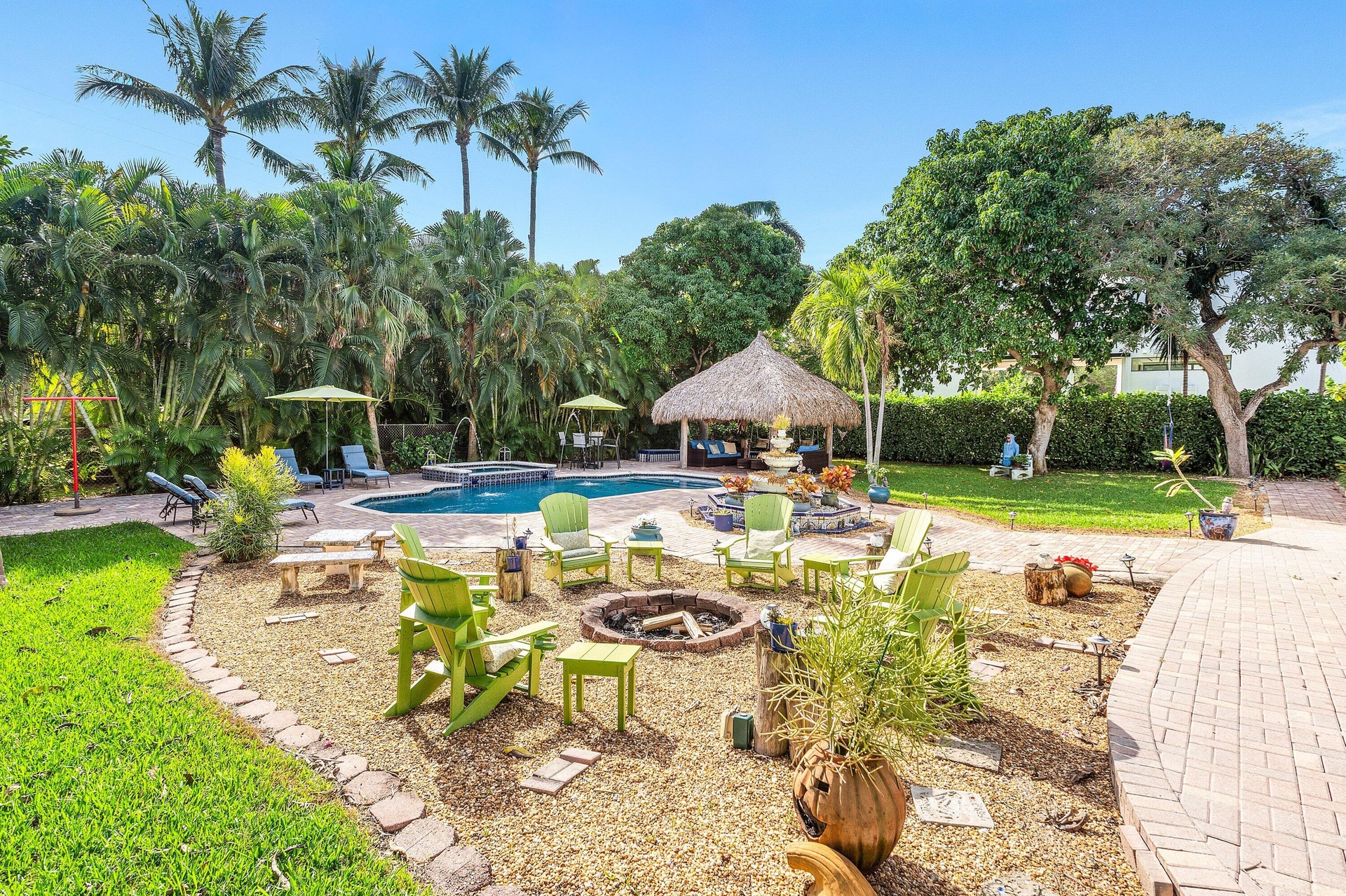 Rare Beachside Gem in Ocean Ridge - Timeless Charm, Modern Living. Welcome to your private slice of paradise in Ocean Ridge—one of South Florida's most charming, exclusive seaside towns and one of its best-kept value secrets. This beautifully updated coastal retreat is just steps from the beach with deeded private access, offering the laid-back elegance of Old Florida with all the comforts of today. Behind a secure electronic gate, a brick-paved drive leads to a detached two-car garage and a welcoming entry framed by Mediterranean columns and custom tile details. Inside, light-filled spaces flow effortlessly from the foyer into an open-concept layout featuring new solid wood floors, crown molding, and solid interior doors throughout. The spacious family room is warm and inviting, centered around a fireplace, with imported tile detailing, and framed by impact glass doors that open to an expansive backyard and patioperfect for indoor-outdoor living. The kitchen is designed for both style and entertaining, with expansive quartzite countertops, custom wood cabinetry, a breakfast bar, and top-tier stainless steel appliances, including a commercial gas range and striking Mediterranean mosaic backsplash. A formal dining area sits just steps away, ideal for easy gatherings with family and friends. This five-bedroom, three-and-a-half-bath home offers flexibility and comfort. A downstairs guest suite with ensuite bath and adjacent bonus room works beautifully as a home office, den, or optional fifth bedroom. Upstairs, the primary suite is a true retreat, complete with a sitting area, two walk-in closets with custom shelving, and dual spa-like bathroomsone featuring a soaking tub, steam sauna shower, dual vanities, and bidet; the other offering a tub/shower combination and spacious vanity. Step out onto the large tiled balcony and enjoy serene views of lush tropical gardens and a tranquil fountain. The outdoor living spaces are exceptional: a covered patio with tongue-and-groove wood ceiling, Mediterranean tile accents, graceful arches, a fire pit conversation area, and a thatched tiki hut beside the custom pool and spaall surrounded by brick pavers. Located less than a block from your private deeded beach path, this home offers miles of pristine shoreline just outside your door. Enjoy the peaceful, intimate feel of Ocean Ridge while being minutes from world-class dining, shopping, Boca Raton, Worth Avenue, and Palm Beach International Airport. A true coastal lifestyle homechic, relaxed, and an incredible value in one of South Florida's most beloved beach towns.