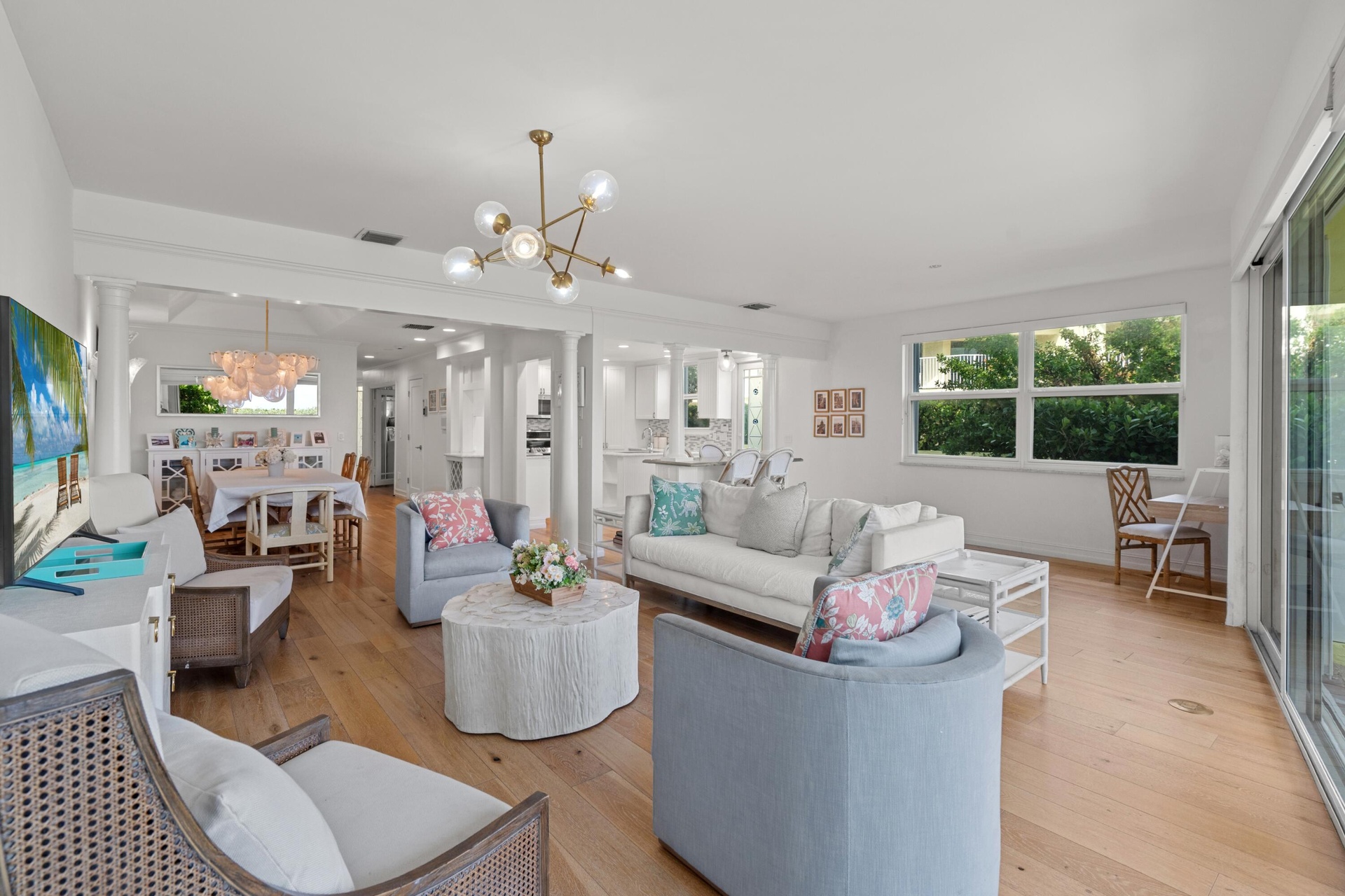 This sophisticated/beach chic oceanfront townhouse in Ocean Ridge offers the utmost in contemporary coastal living. With three bedrooms and boasting 3,658± total square feet designed in an open-concept plan, the living room, fronted by a window-wall of glass sliding doors opening to the patio and ocean, flows seamlessly with the dining area, wet bar, breakfast bar and kitchen. The gourmet kitchen is finished with custom cabinets, Cambria Quartz counters, glass backsplashes, high-end appliances and a passe-plat for easy service. On the second floor, along with the large ensuite guest bedroom is the primary suite, a serene sanctuary with sliding doors leading out to a private balcony delivering awe-inspiring ocean views. The suite comprises two custom-fitted walk-in closets and a tiled spa-like bathroom. Completing the layout is a first-floor guest bedroom suite, laundry room and garage parking for one car with an adjacent uncovered dedicated parking space. Amenities include wood flooring, impact windows and doors and a central vacuum system, with details that include a new roof, new exterior painting, two new air-conditioners and new washer and dryer.