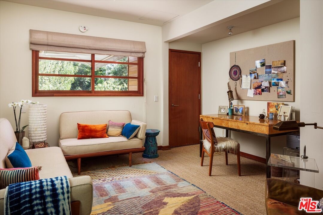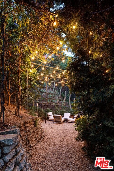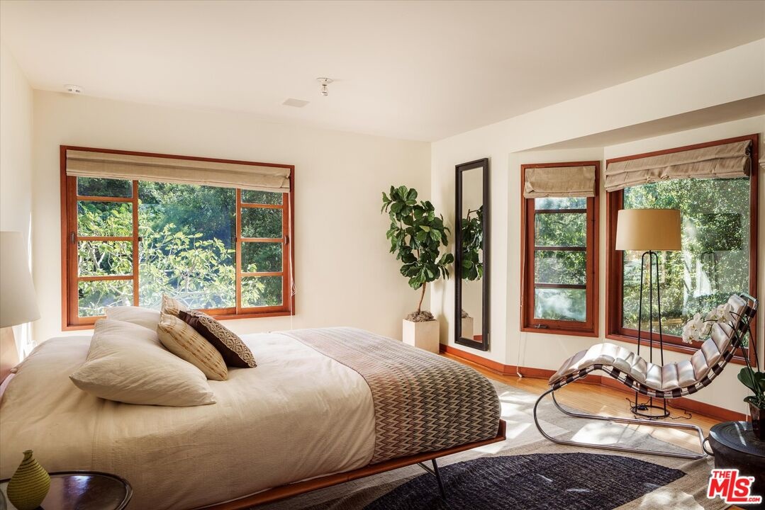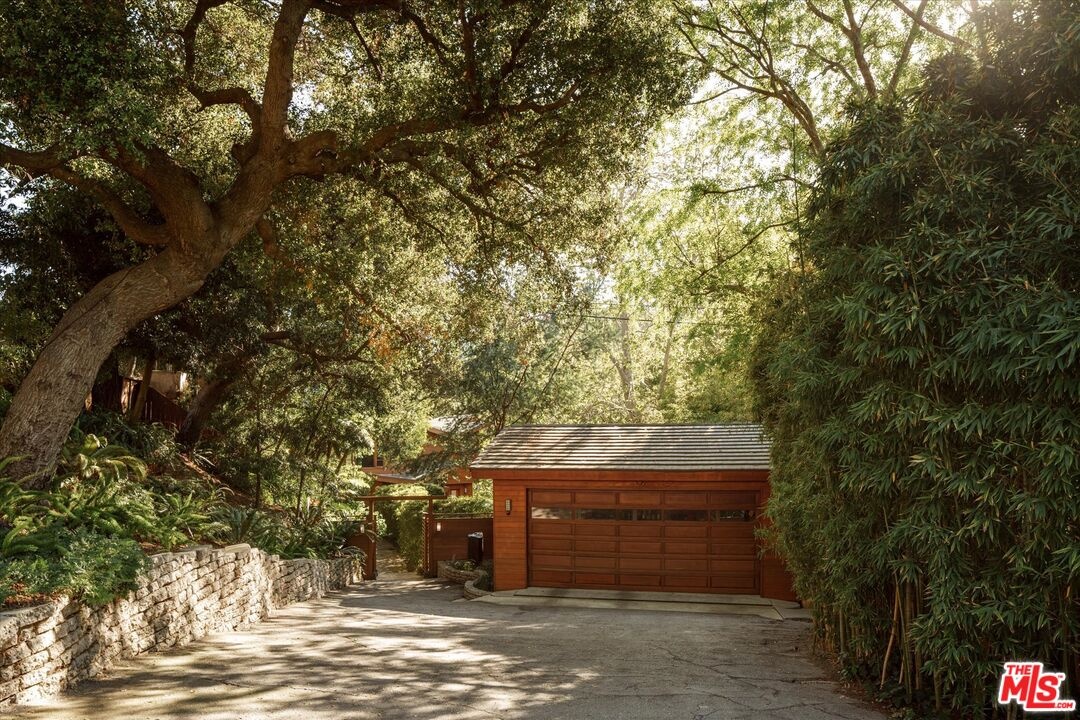 Nichols Canyon Paradiso is a rare Hollywood Hills sanctuary set on nearly an acre, a true fortress of privacy that blends Mid-Century Modern and architectural rigor with the elemental calm and soulfulness of Big Sur, evoking the serenity and romance of Post Ranch Inn. Encompassing approximately 6,000 square feet, the estate was reimagined in 1991 as a creative refuge for legendary Eagles songwriter JD Souther, who enjoyed the stand-alone creative studio on the property, and later the property was expanded by renowned architect Stephen Kanner, FAIA, resulting in a home that feels both deeply personal and quietly monumental. The architecture is a masterclass in organic design, with massive glass sliders, stone fireplaces, and natural materials that dissolve the boundary between indoors and out, framing lush, forested canyon views in every direction. The expansive grounds are a true canyon rarity, offering a resort-like experience with a swimming pool newly resurfaced in luxurious midnight blue micro pebble, winding walking paths, a private vineyard overlooking an outdoor feasting terrace nestled among fruit trees. Adding to this abundance, is a discreet, near-secret access point to the trails of Runyon Canyon Park just steps away. Designed to nurture creative life, the home features a professional-grade Chef's Kitchen, a state-of-the-art private screening room, and multiple inspired spaces for work and retreat, including the detached creative studio and a stone-and-wood guest cottage rich with character. The layout includes five generous bedrooms, anchored by a secluded primary wing that feels like a true retreat, often described as a personal "stairway to heaven." Currently owned by the creator and director of Netflix's Chef's Table, the property seamlessly reflects its owners' sensibility, balancing cinematic scale with intimate craftsmanship and soulful detail. Tucked into a coveted Nichols Canyon enclave, the estate offers a transportive, retreat-like atmosphere while remaining moments from the city's most celebrated dining and cultural destinations. This is a legacy property for those looking to check in anytime, but never leave.