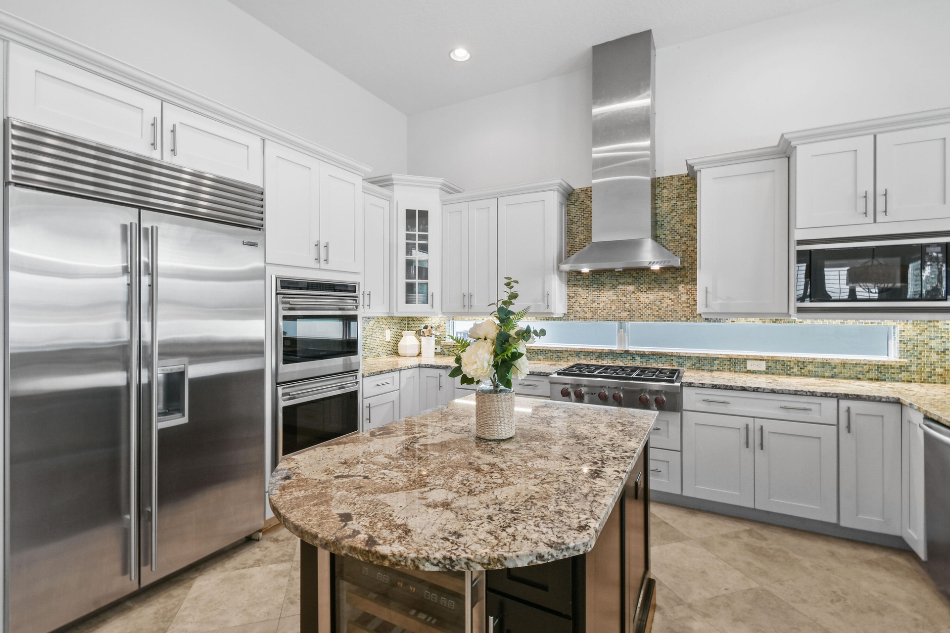 Designed for intimate living and grand-scale entertaining alike, the chef's kitchen is appointed with Wolf and Sub-Zero appliances, custom cabinetry, and an expansive waterfall island. The space opens seamlessly into the living and dining areas, where sliding glass walls dissolve the divide between indoors and out. Beyond lies a resort-style lanai featuring a Twin Eagles summer kitchen, covered entertaining pavilion, and a sparkling pool with sun shelf and spa, all overlooking the manicured grounds and shimmering Intracoastal backdrop.