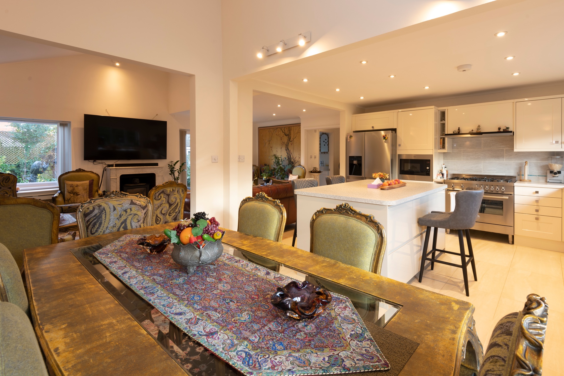 The ground floor is centred around a welcoming entrance hall that opens into a spacious open-plan reception and dining area, ideal for both everyday family life and entertaining. Large windows and garden-facing doors allow natural light to flow throughout, creating a bright and relaxed atmosphere.
