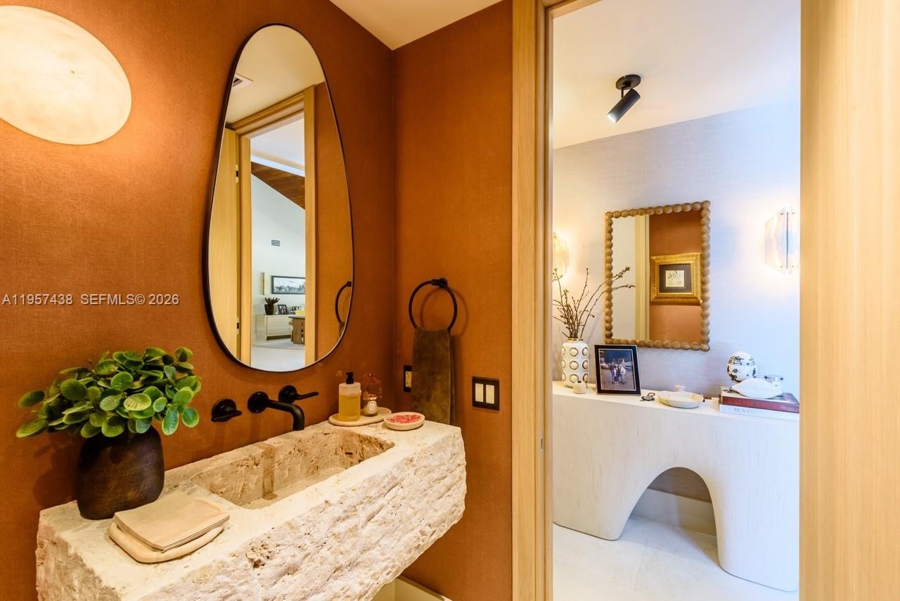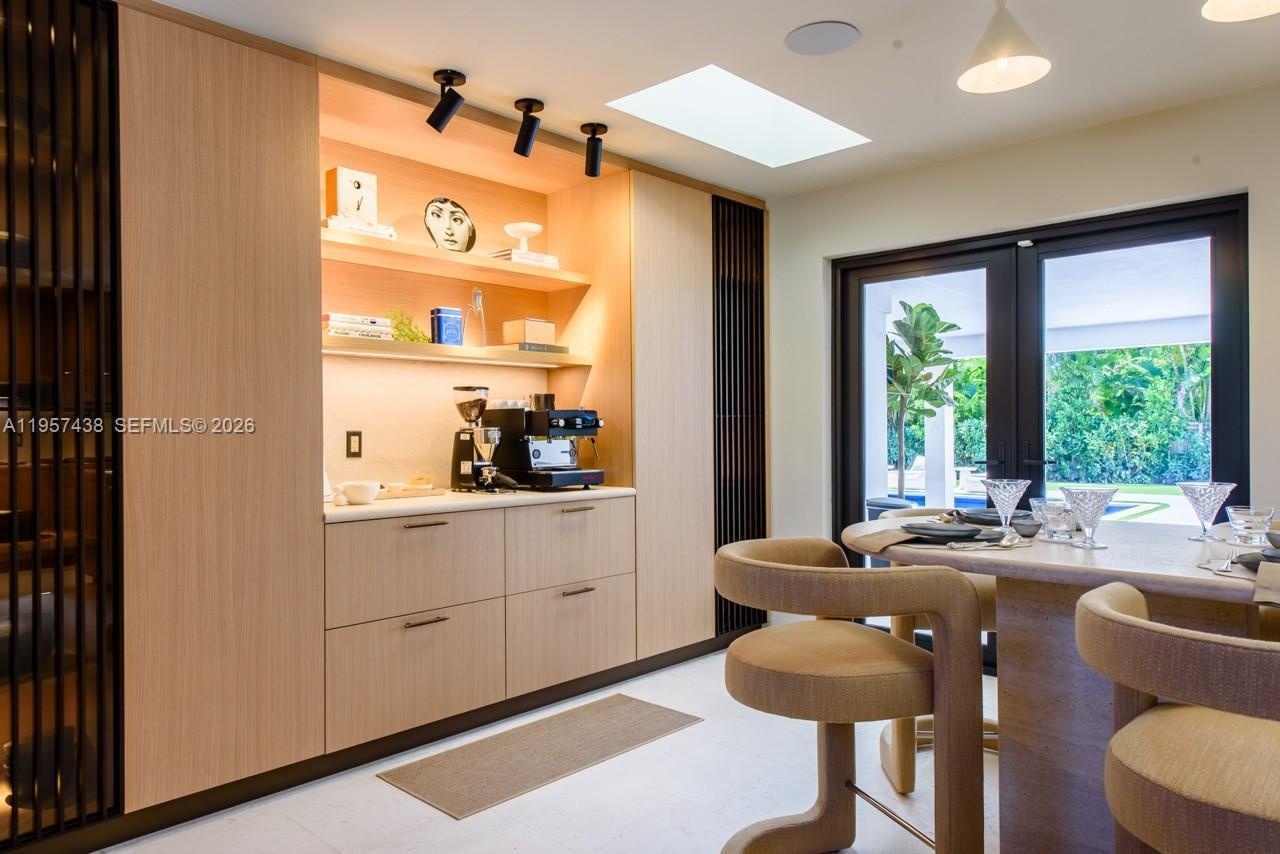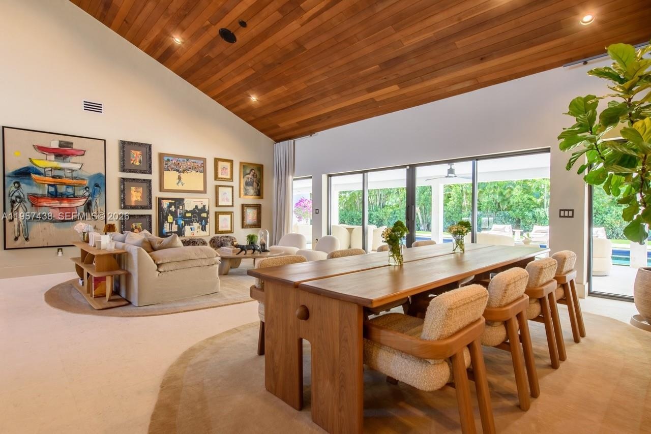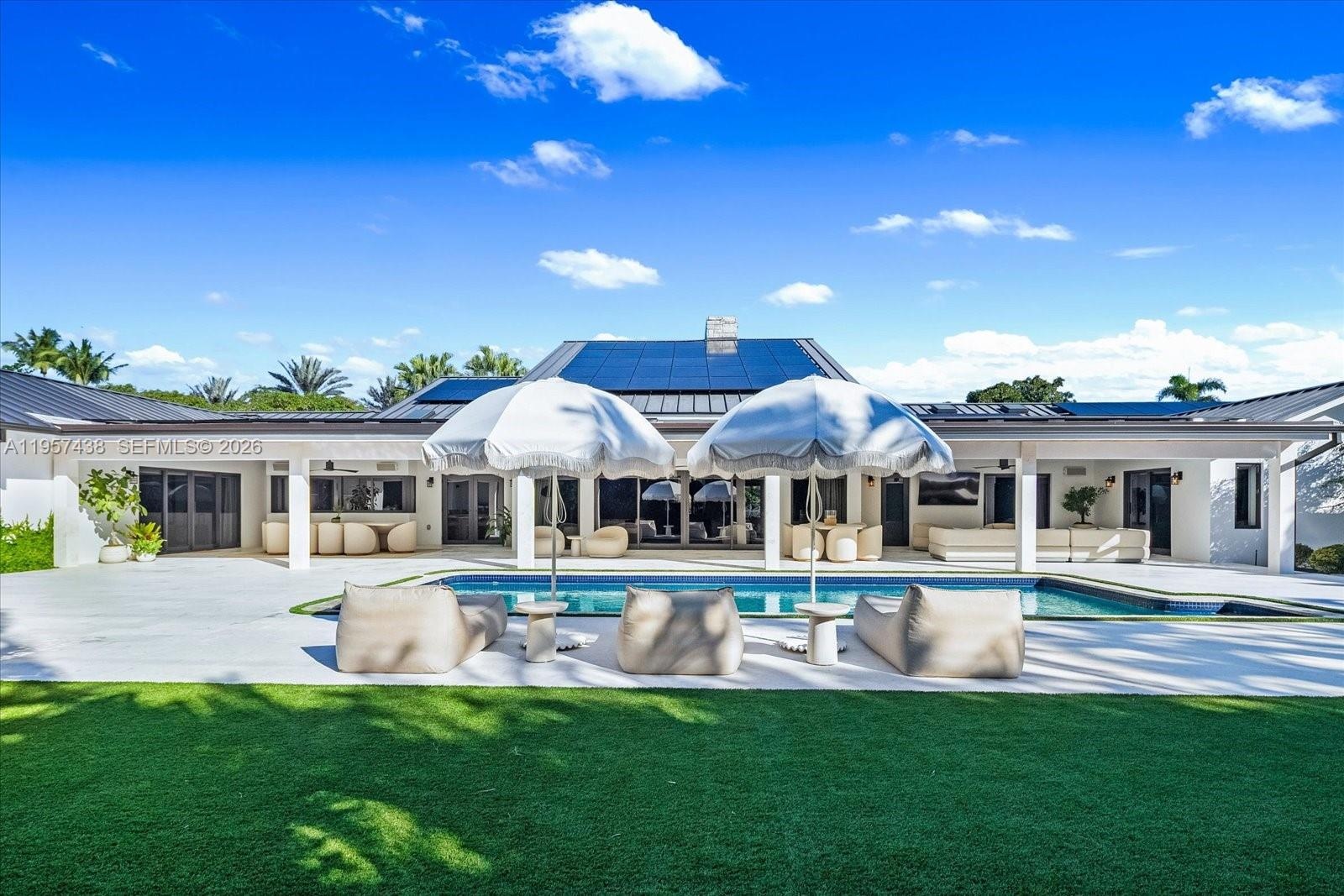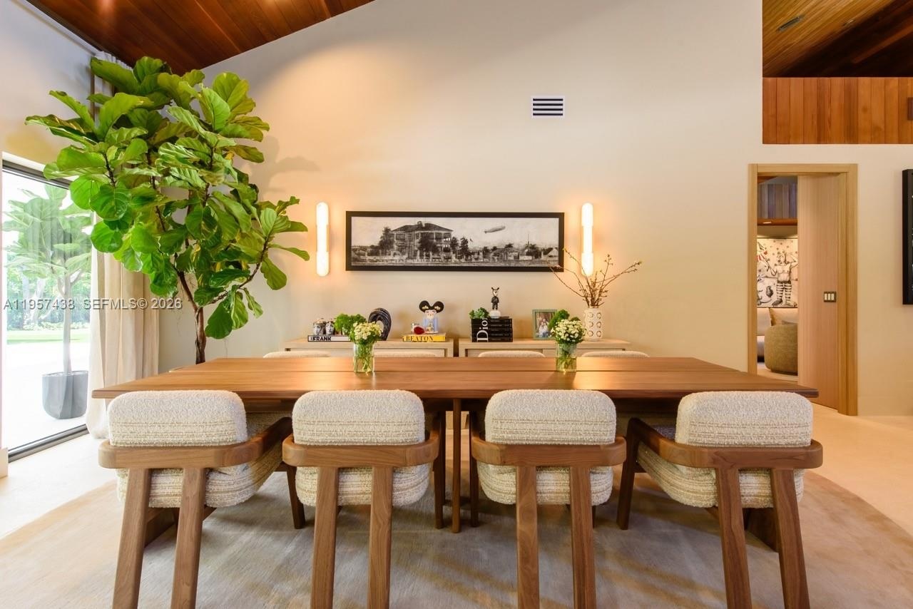 Welcome to Villa Armonia. Originally built in 1983 and completely renovated in 2025, this exceptional one-story residence offers 9,649 total sq ft and sits on a full acre within one of the few gated communities in North Pinecrest. This home is one of the latest turnkey residences designed and renovated by Sensi Casa Design. The property features six spacious bedrooms, each with its own en-suite bathroom and walk-in closet. Additional highlights include a dedicated playroom with dual TVs, a family room with bar, and two formal living areas—one featuring a fireplace—along with wood beam ceilings and an elegant blend of wood and stone flooring throughout. The residence also offers a gym, sauna, steam room, and a detached, air-conditioned three-car garage. Outdoor amenities include a heated pool, covered terrace, and BBQ area, ideal for year-round entertaining. The kitchen, bathrooms, and closets are Made in Italy by Mia Cucina, complemented by Miele appliances and premium finishes throughout the home. Offered fully furnished.
