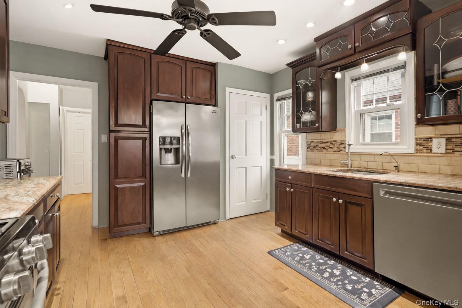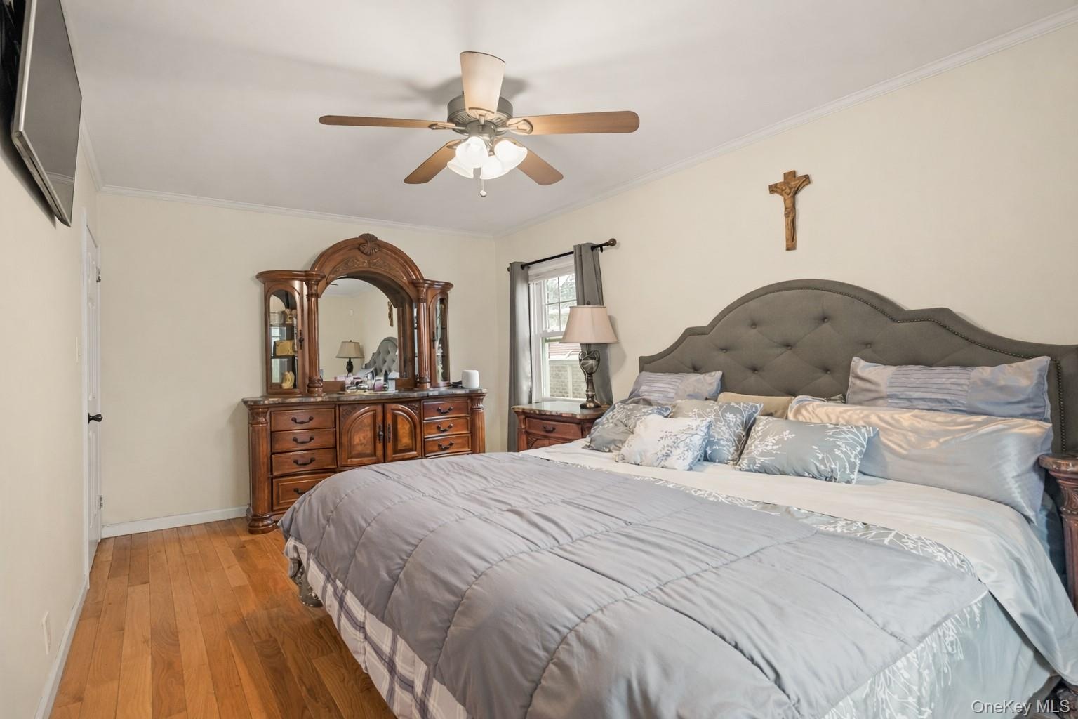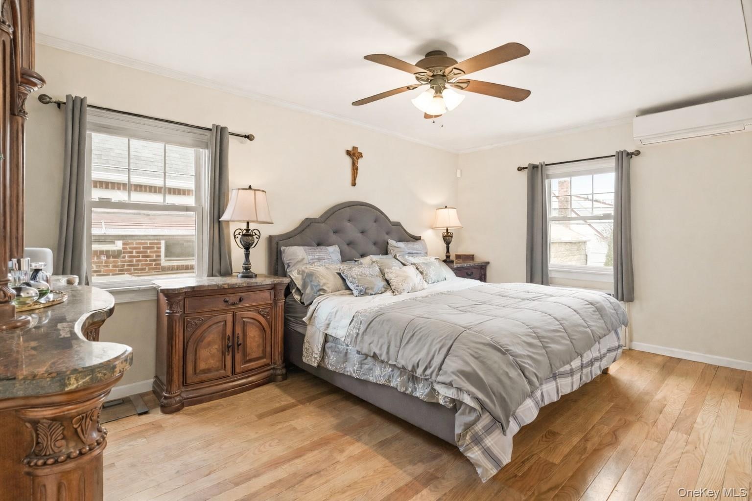 Welcome home to this beautifully maintained brick cape offering space, comfort and timeless charm in the heart of Fresh Meadows. A covered front porch with decorative masonry railing and room for seating creates a warm and inviting entry. Inside, bright and well-proportioned living spaces feature hardwood floors, crown molding, and abundant natural light. The living room flows seamlessly into a dedicated dining area, ideal for everyday living and entertaining. A graceful archway adds architectural character and leads into the updated kitchen. The kitchen is both functional and stylish with solid wood cabinetry, granite countertops, tile backsplash, and stainless steel appliances including a gas range with double oven, refrigerator, microwave, and dishwasher. Recessed lighting, a ceiling fan, and generous storage complete the space. Four comfortable bedrooms; two located on the first floor including a spacious primary with hardwood floors, ceiling fan, and double exposure windows. Upstairs; two generously-sized bedrooms provide flexible living space with charming built-in storage and ceiling fans. The private, fully fenced backyard is a true highlight, with expansive paved patio areas perfect for outdoor dining and gatherings. A long private driveway leads to a detached garage, offering secure parking and additional storage. Ductless Split A/C units and new windows ensure comfort throughout the year. This home combines classic character, modern convenience, and generous indoor-outdoor living in a charming residential setting. Close to Cunningham & Kissena Park -hiking, picnic, sports fields and golf. Fresh Meadows Place Shopping Center. Short distance to Flushing commerce and dining. Convenient access to the LIE and Grand Central Parkway. Express bus service to Manhattan and frequent local buses connect you to the subway system at 169th St, 179th St (Jamaica) and Kew Gardens.