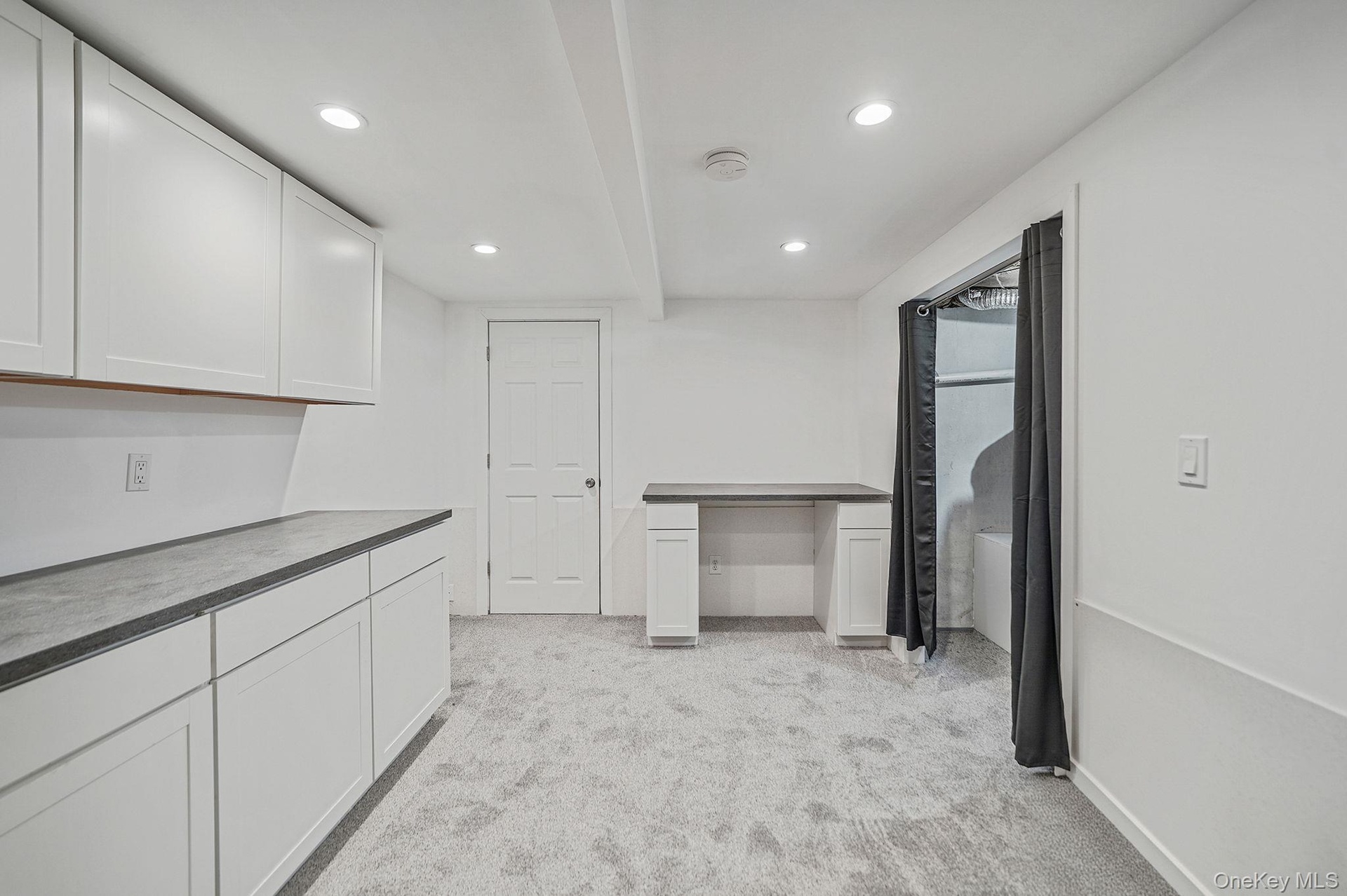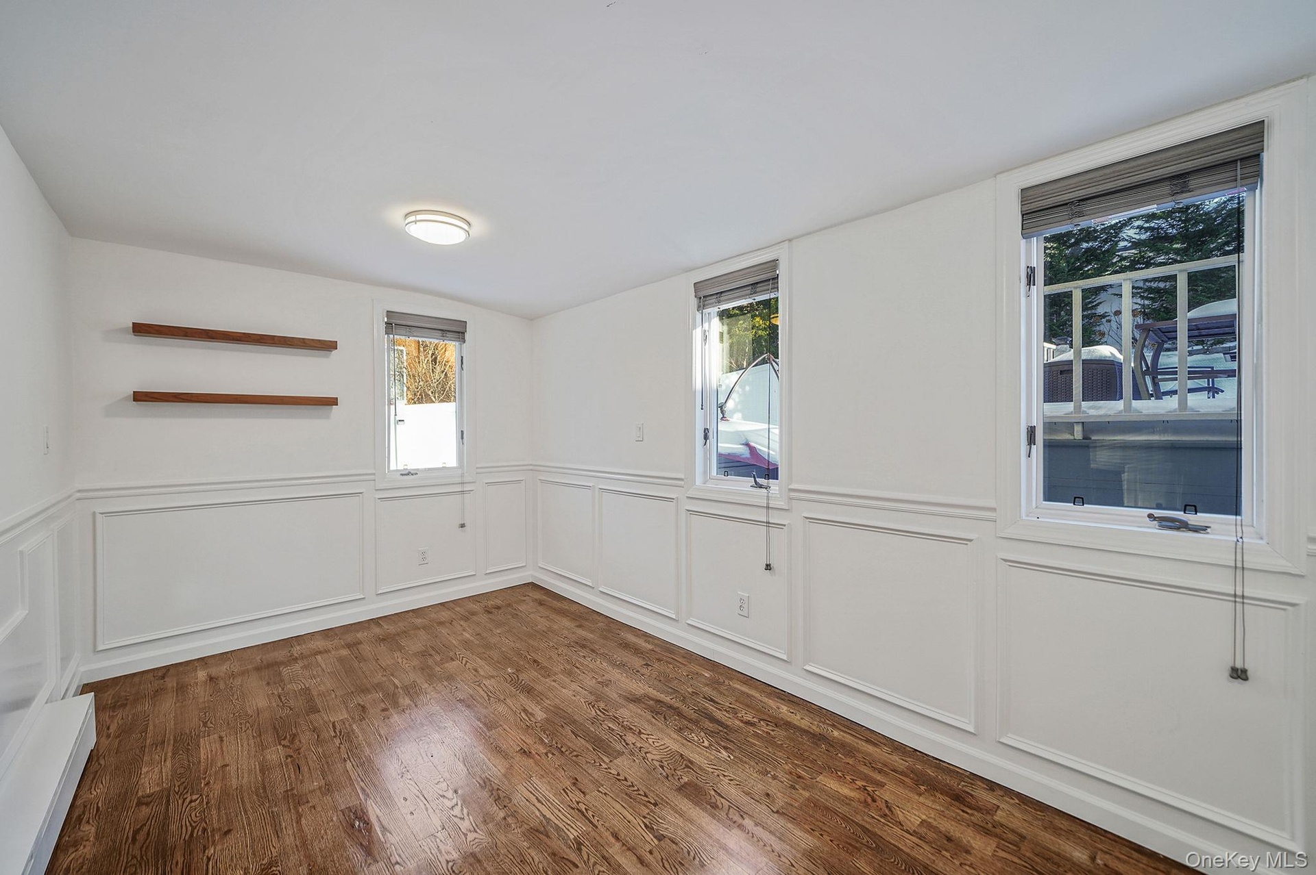 Inside, enjoy generously proportioned bedrooms, oak hardwood floors, and impeccable craftsmanship, highlighted by custom wainscoting and detailed trim work. The living area, anchored by a striking fireplace, offers a refined setting for both relaxation and entertaining. The well-appointed kitchen, topped with stone countertops and paired with its dining area, provides a perfect space for everyday living or hosting guests. A den with an adjoining bathroom serves as a tranquil retreat or guest suite, featuring a door that opens directly to the wraparound deck—ideal for seamless indoor-outdoor living. The finished basement, currently housing laundry facilities, offers versatile space for a family room, home office, or recreation area.