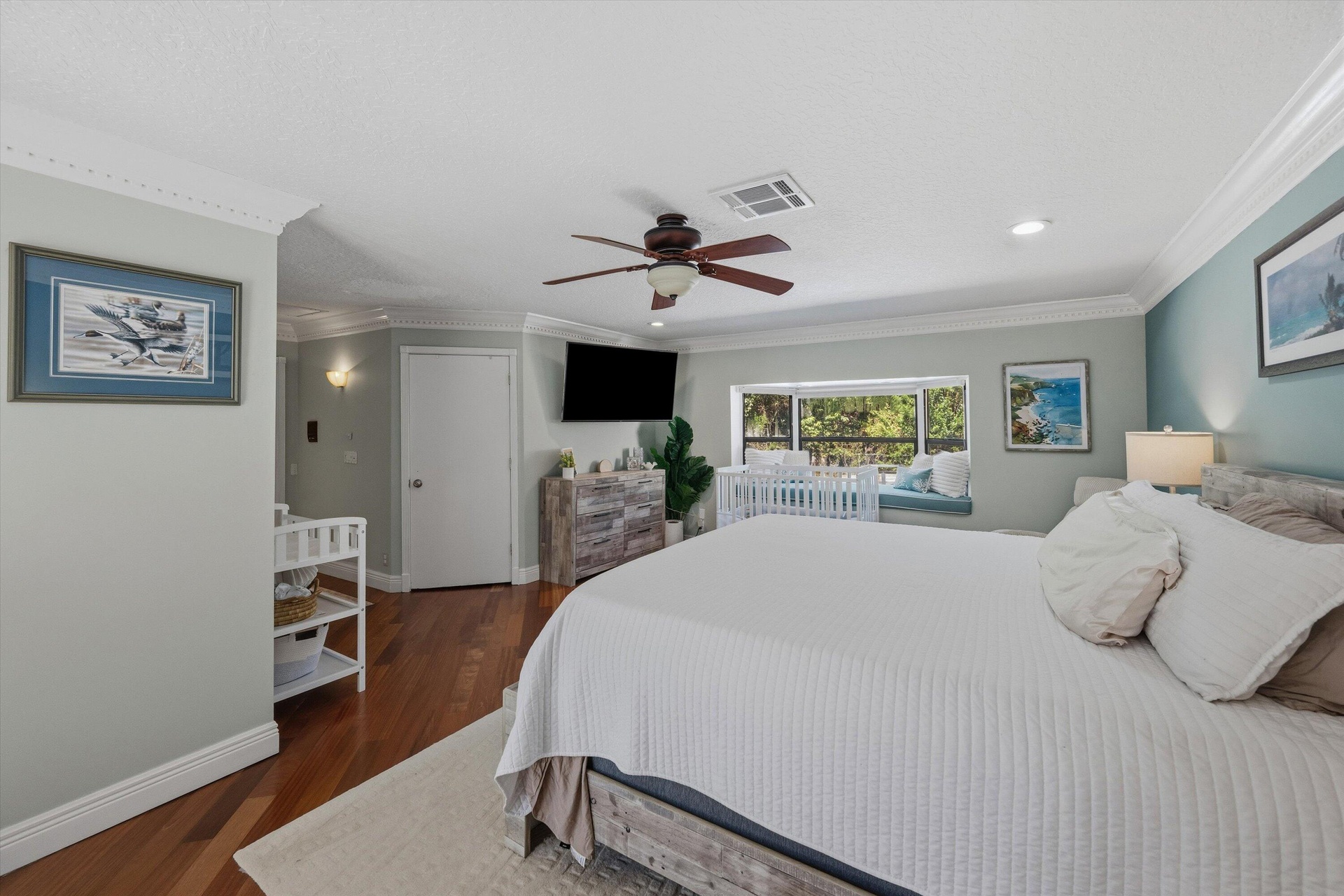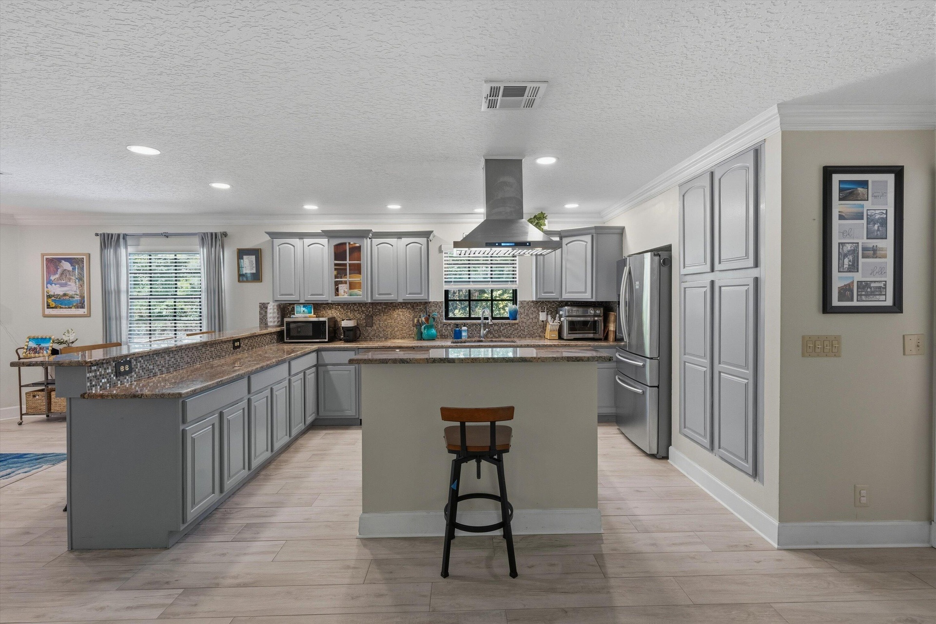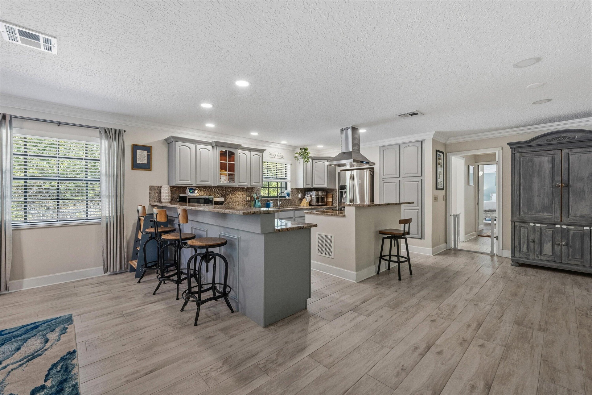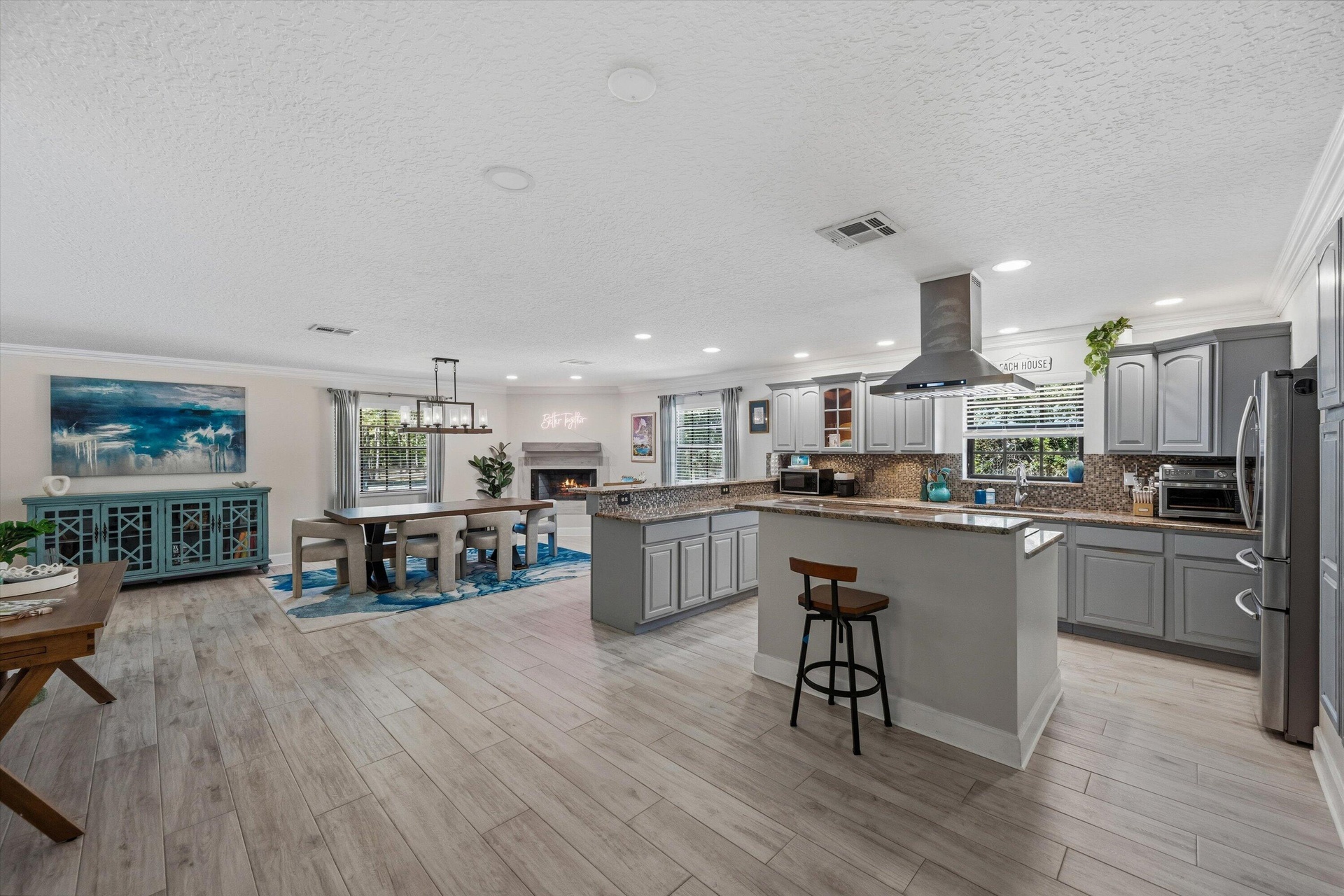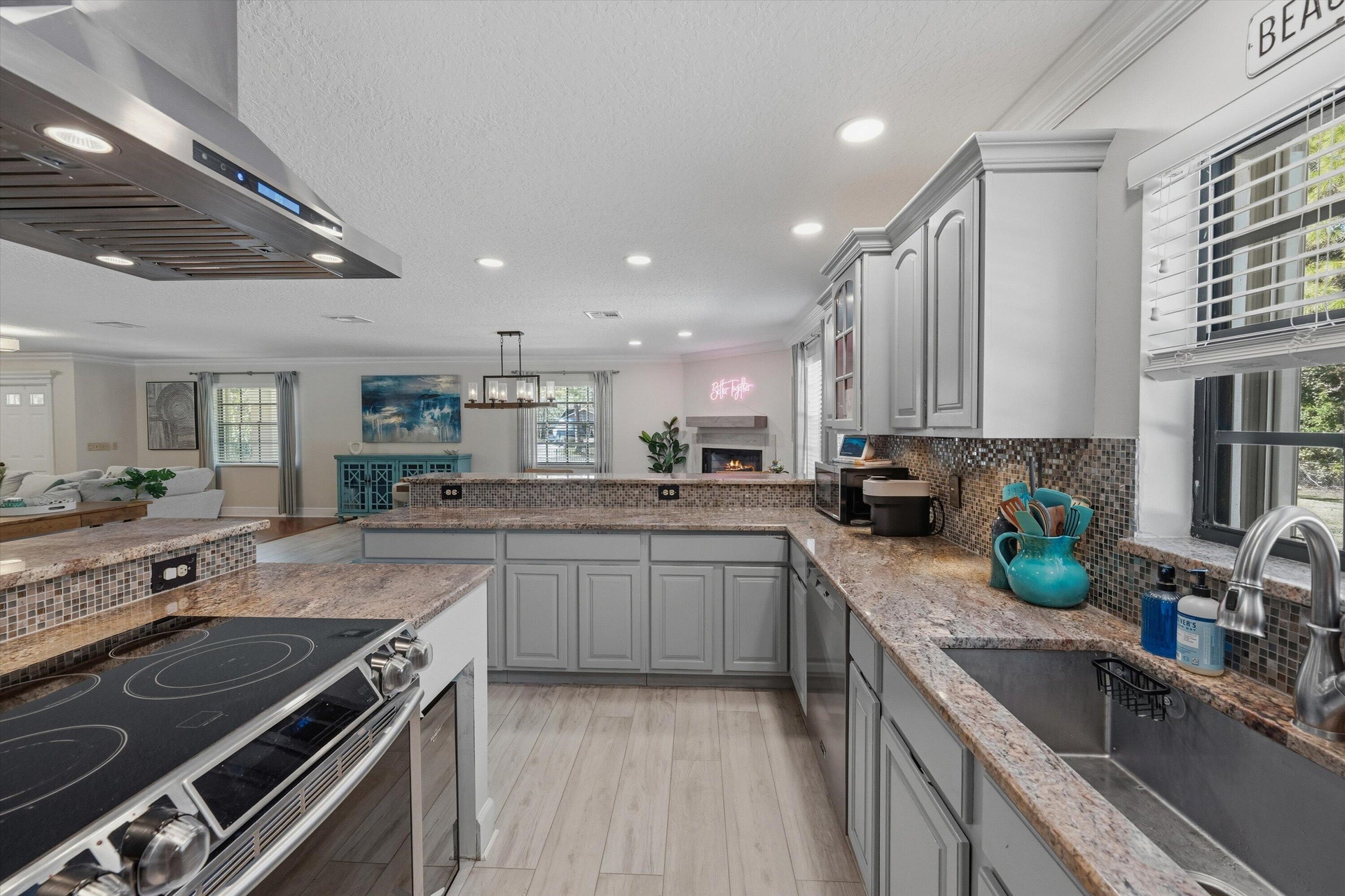 On the opposite side of the home, three additional bedrooms—including a private en-suite and an additional third bathroom- provide ideal accommodations for guests, family, or multigenerational living. The open-concept kitchen and living area is perfect for entertaining, highlighted by a cozy wood-burning fireplace and an inviting flow into the main living spaces. A spacious game or bonus room features sliding glass doors that lead to the newly screened pool, creating seamless indoor-outdoor living. Elegant Brazilian cherry wood flooring, wood-look tile, and abundant closet space throughout the home add warmth, style, and functionality.