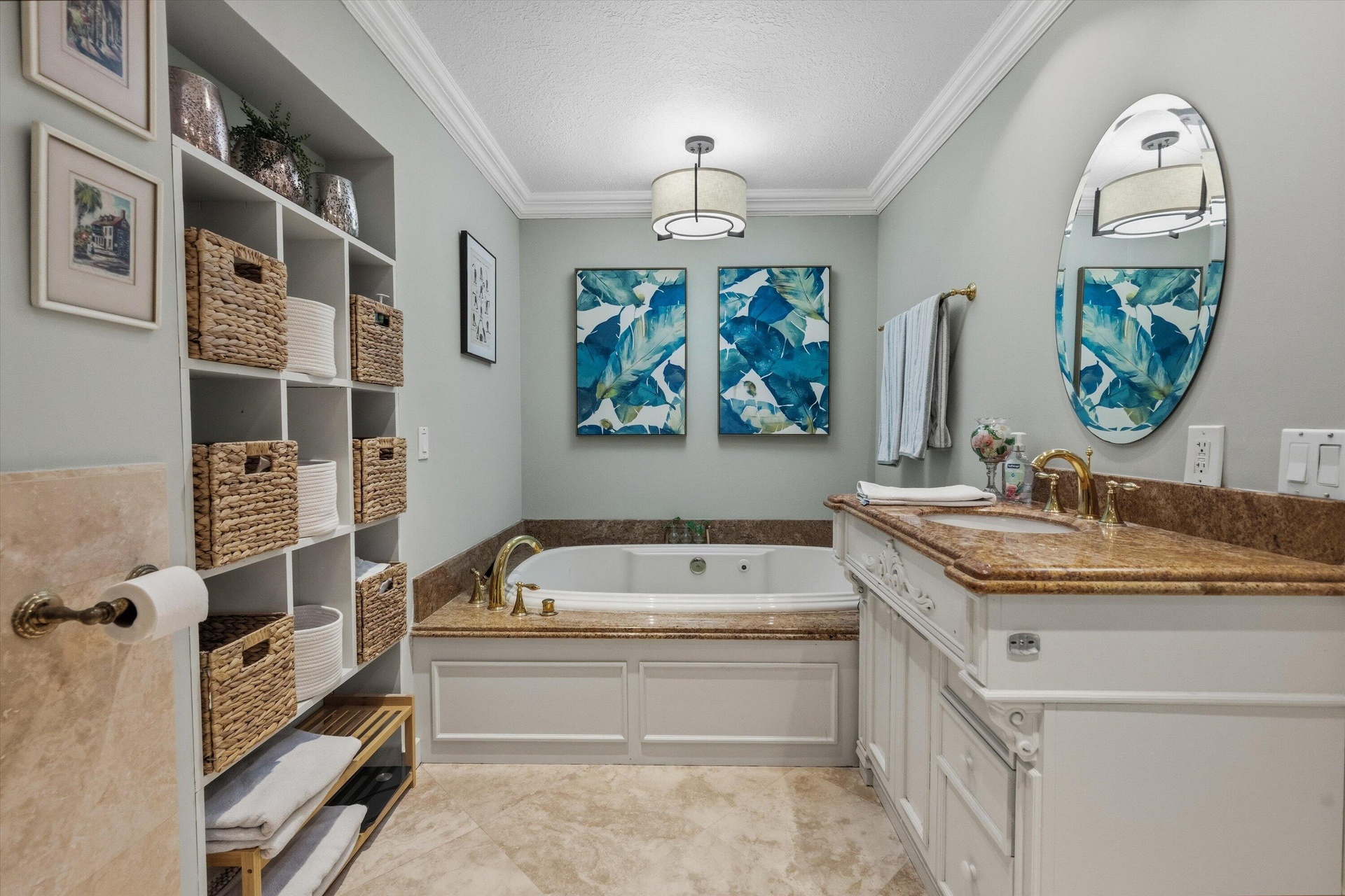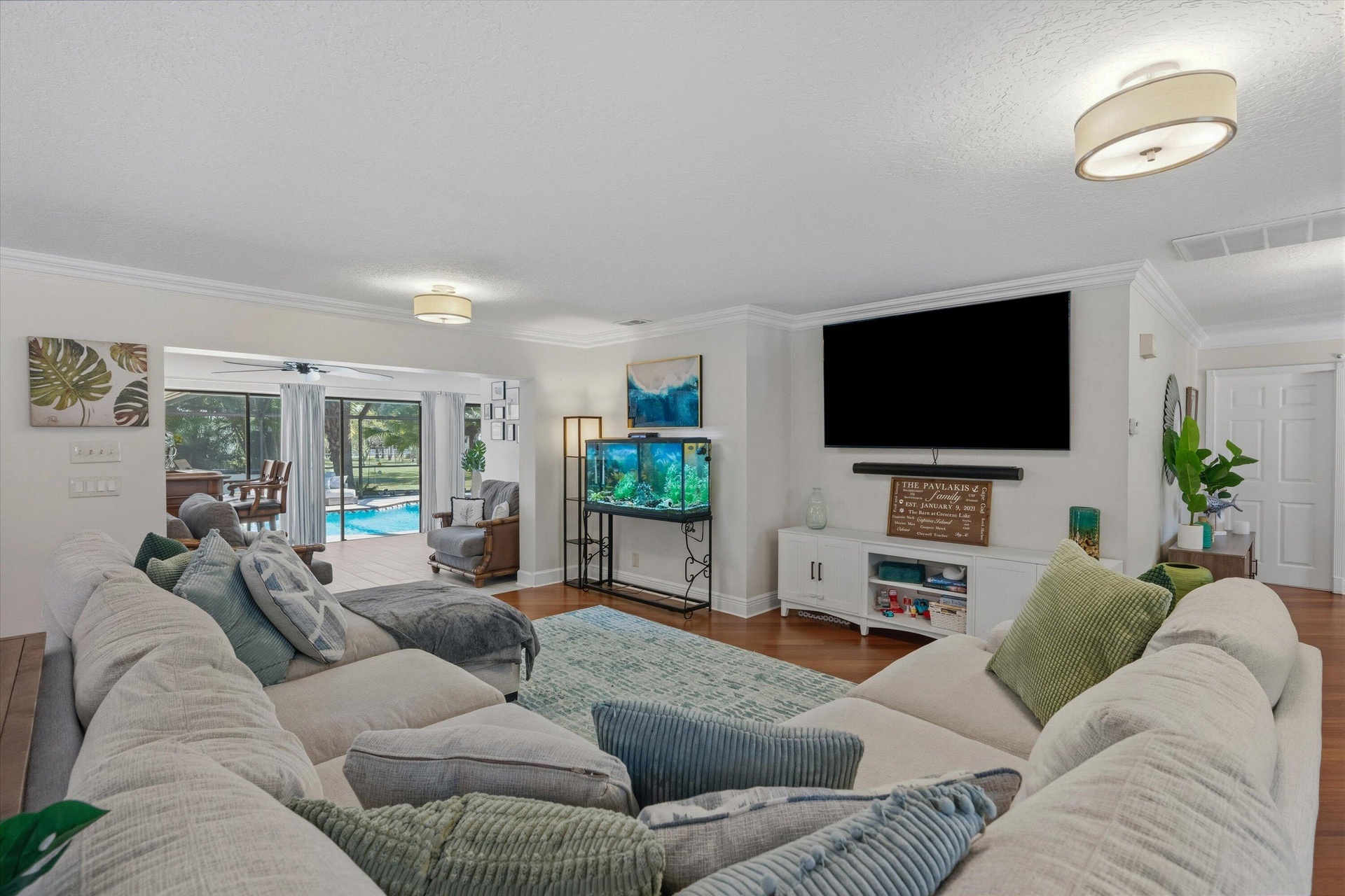 Boasting 3,091 square feet of living space, this thoughtfully designed home features a desirable split floor plan with a generous primary suite showcasing a huge walk-in closet, a spa-style bathroom with soaking tub, walk-in shower, two sink vanities, and French doors that open directly to the screened-in pool.