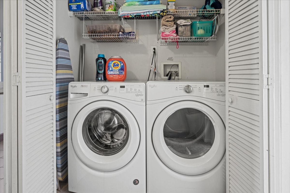 The main living spaces feel bright and welcoming, while the second level is designed for privacy and relaxation. Two spacious bedrooms and two full bathrooms provide plenty of room to spread out. The primary bedroom serves as a peaceful escape, featuring two walk-in closets that offer exceptional storage and organization.