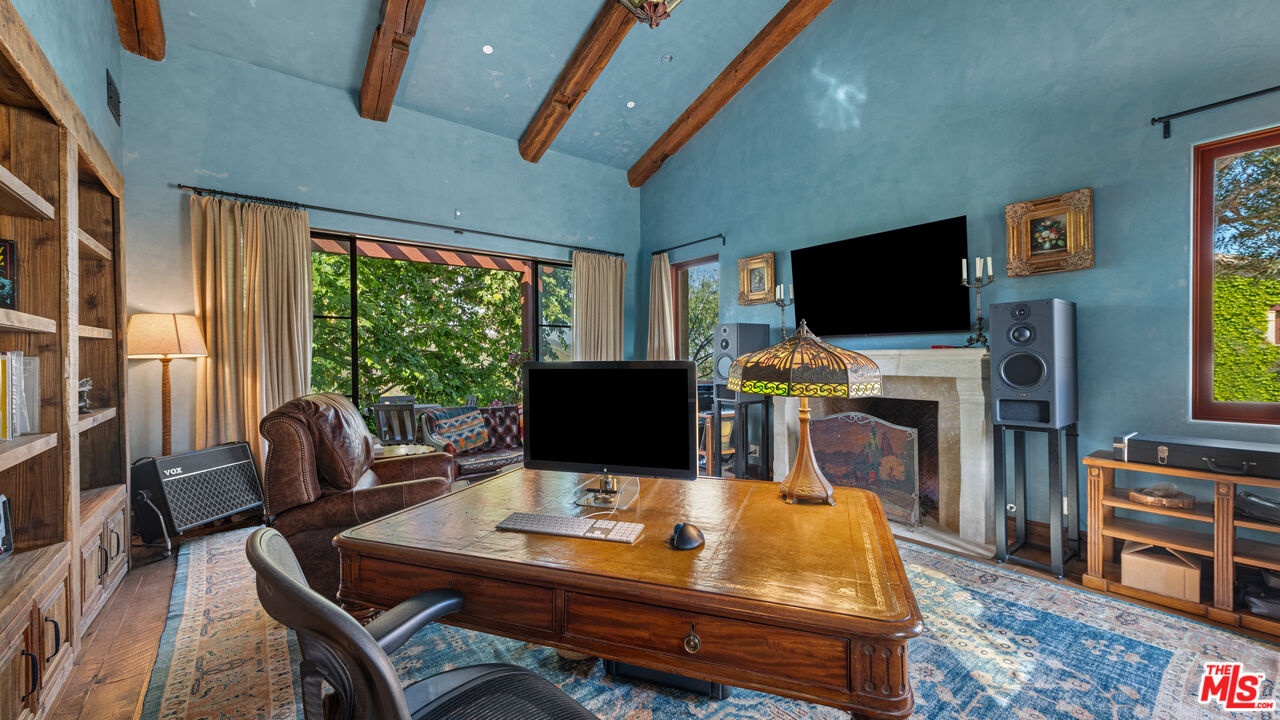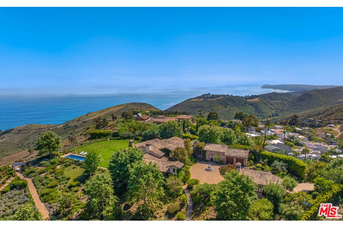 Tucked away behind gates atop the Malibu hills, this enchanting estate captures panoramic ocean and mountain views while evoking the timeless romance of a European countryside retreat. The approach unfolds along a long drive into a broad motor court with parking for 10+ cars, framed by lush gardens and anchored by a stone fountain.Inside, soaring wood-beamed ceilings, French doors, and gallery walls create a backdrop of warmth and elegance. The main living room is crowned by a monumental fireplace and flows to a formal dining room and chef's kitchen, where custom cabinetry, a walk-in pantry, dual ovens, a Viking range, Wolf six-burner cooktop, and a large stone-topped island cater to both intimate evenings and grand entertaining. Nearly every room opens to patios, gardens, or terraces, merging the indoors with the property's dramatic natural setting.The estate is designed with multiple wings for privacy. The primary suite features vaulted ceilings, a stone fireplace, and walls of glass that frame ocean and pool views. Its spa-inspired bath offers dual vanities, a soaking tub, and a large shower with multiple heads. Additional bedroom suites include private patios and marble-clad bathrooms, while a powder room delights with hand-painted lemon grove murals and a sculptural wood vanity. Beyond the main house, a detached office with vaulted ceilings, stone fireplace, reclaimed wood built-ins, and a wet bar creates the perfect studio or guest space. Across the court, a guest suite adjoins the garages, complete with wood floors, vaulted ceilings, en-suite bath, and French doors to a pergola-shaded patio. The outdoor living is extraordinary: a covered loggia with stone fireplace, alfresco dining, and heaters for year-round enjoyment; expansive lawns flowing to a long rectangular pool and spa with automatic cover; and terraced gardens with citrus groves, fountains, koi ponds, and box hedges. Meandering stone paths lead to a barn-inspired guest structure with a porch swing and firepit seating, all overlooking breathtaking ocean and canyon vistas. A professional-grade recording studio with soaring ceilings, custom acoustics, and a sound room enhances the estate's versatility, offering creative refuge for artists and visionaries. Throughout the property, hidden seating areas, romantic pergolas, and layered gardens create a sense of discovery and retreat. Exquisitely landscaped and thoughtfully designed, 2900 Corral Canyon Rd is a rare Malibu estate that combines European elegance, coastal serenity, and boundless possibilities for living, entertaining, and creating.