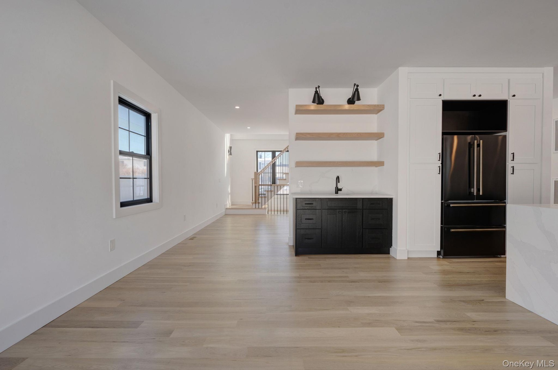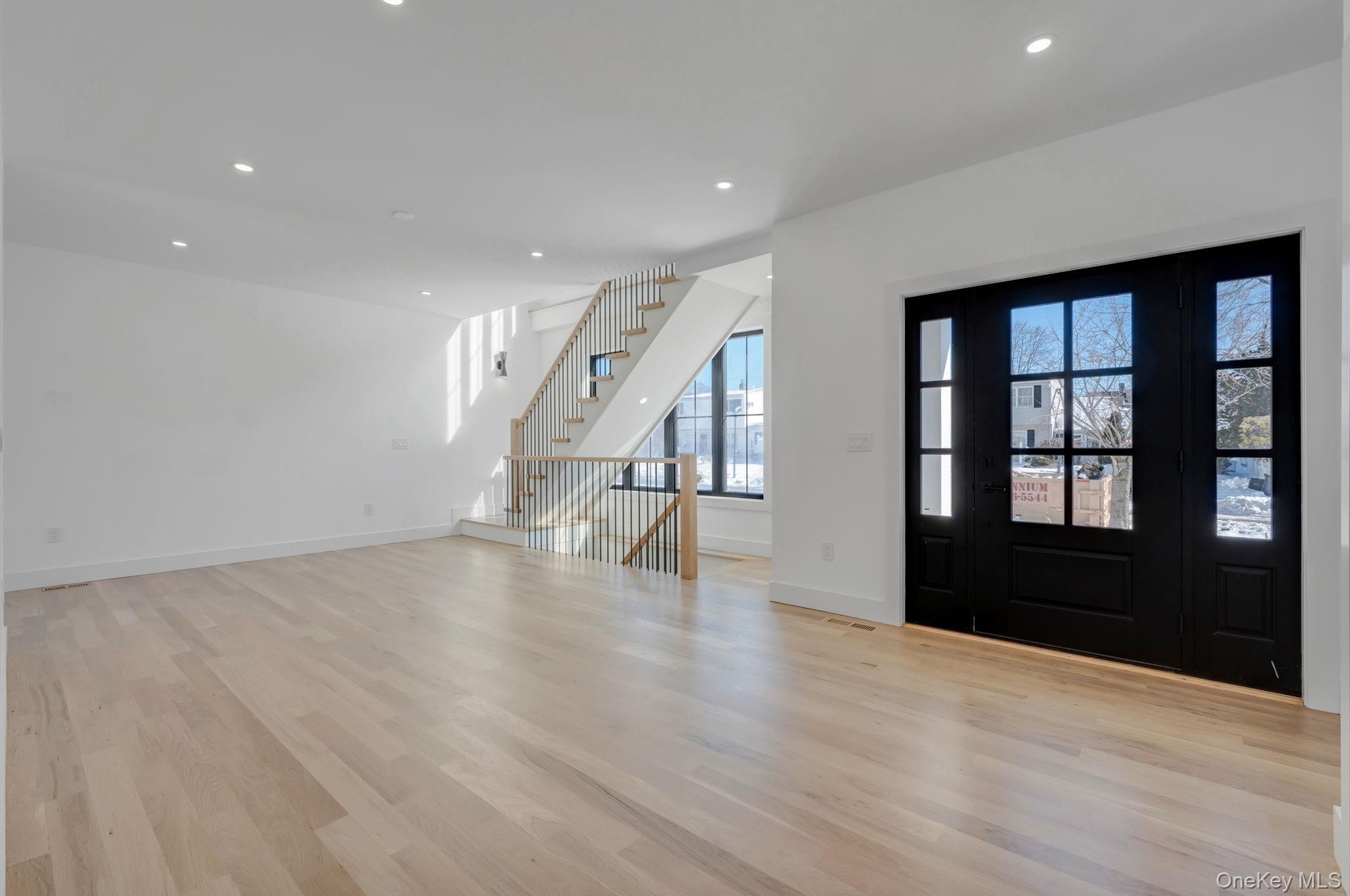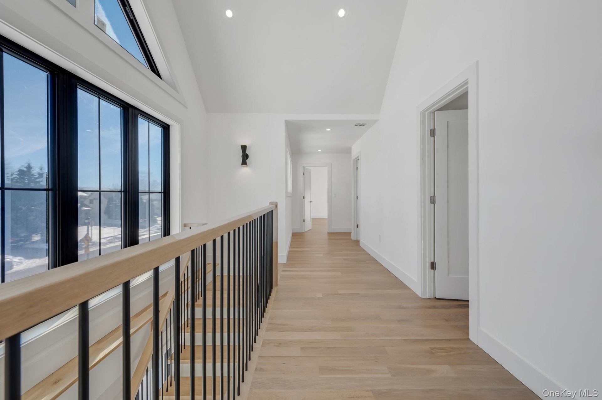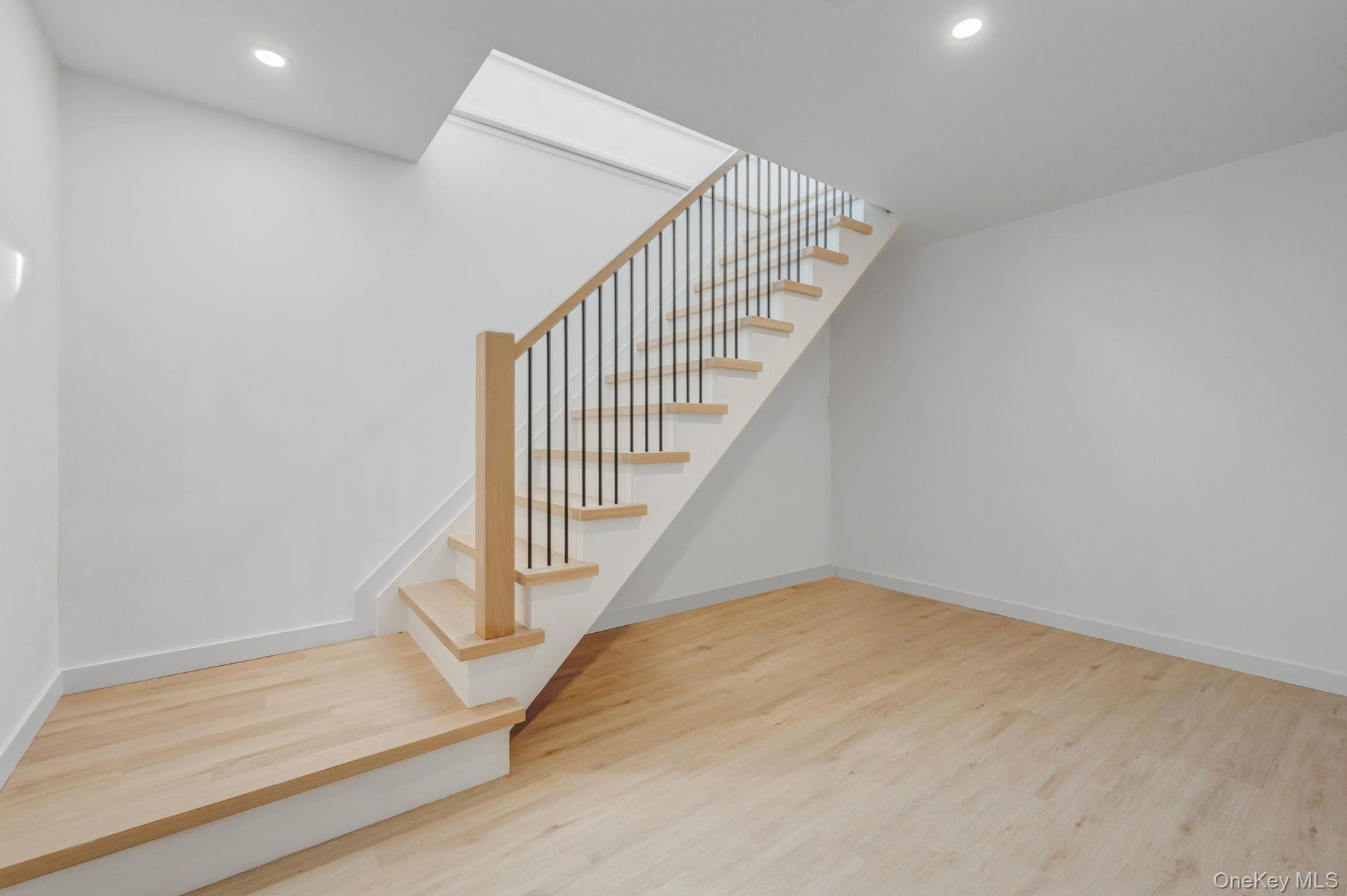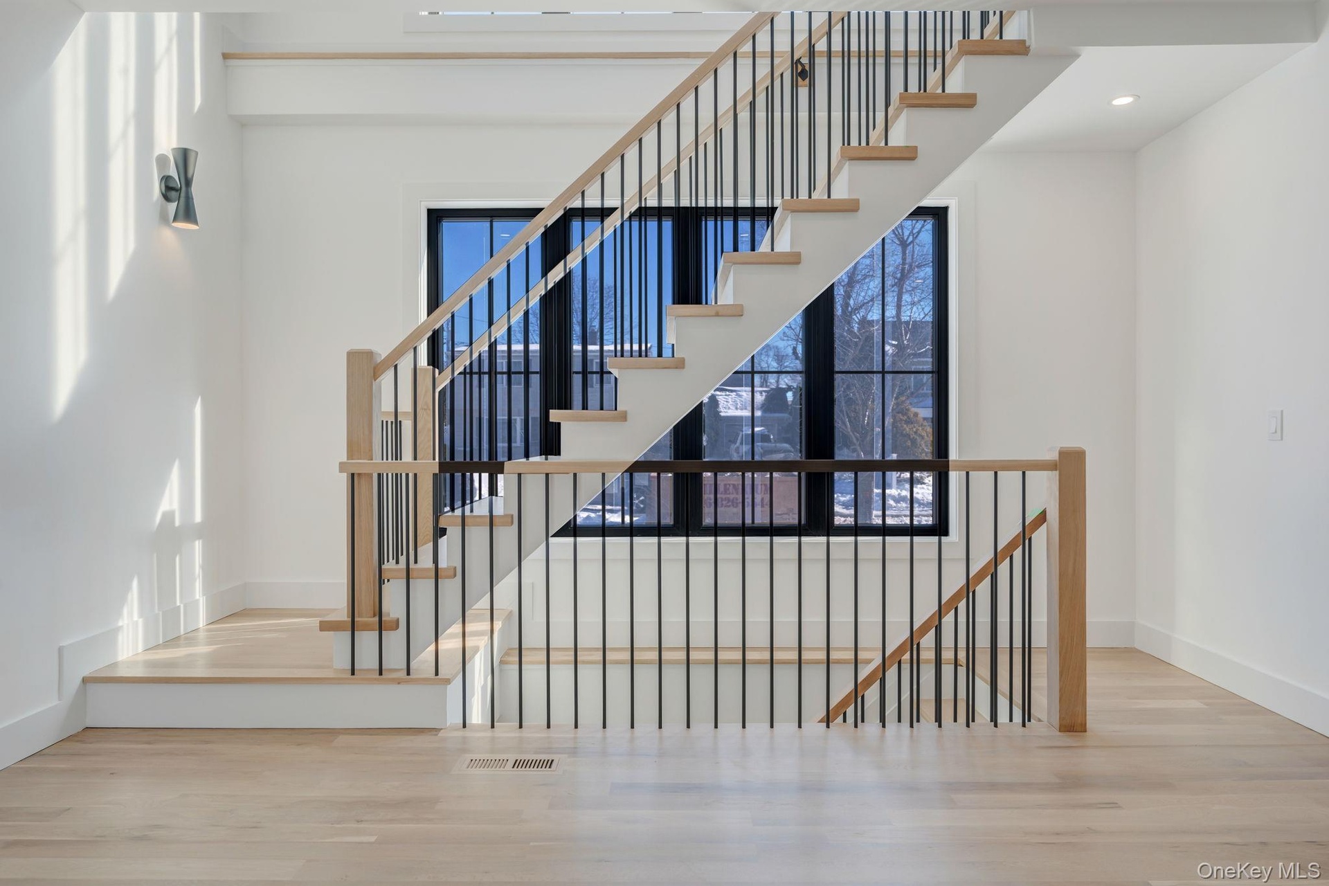 The staircase serves as a design focal point with its modern railing and dramatic window wall, bringing light into both floors and enhancing the home’s architectural character.