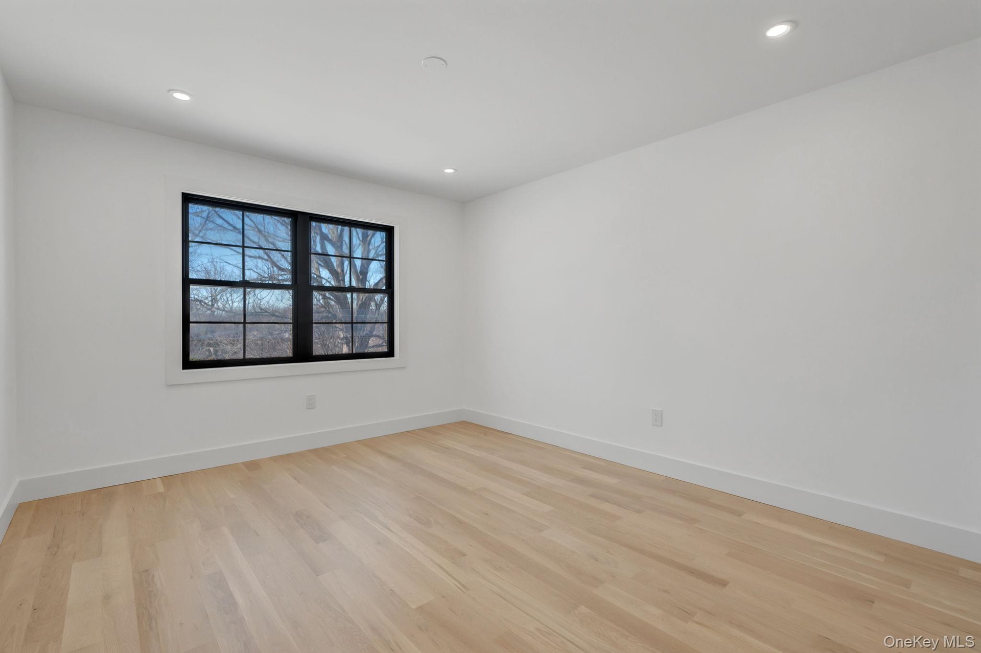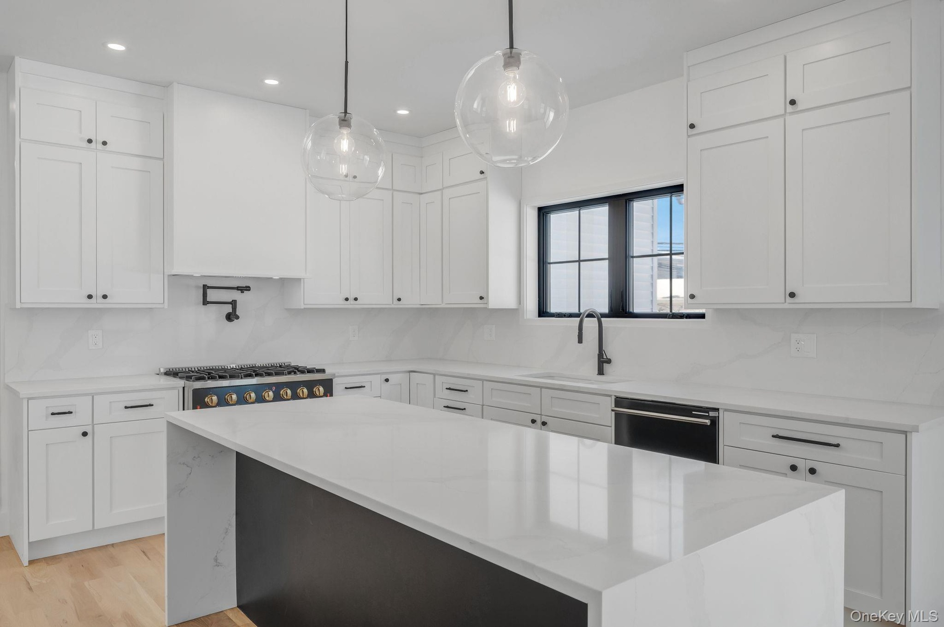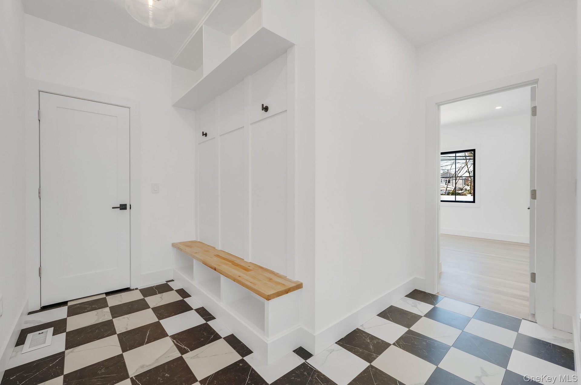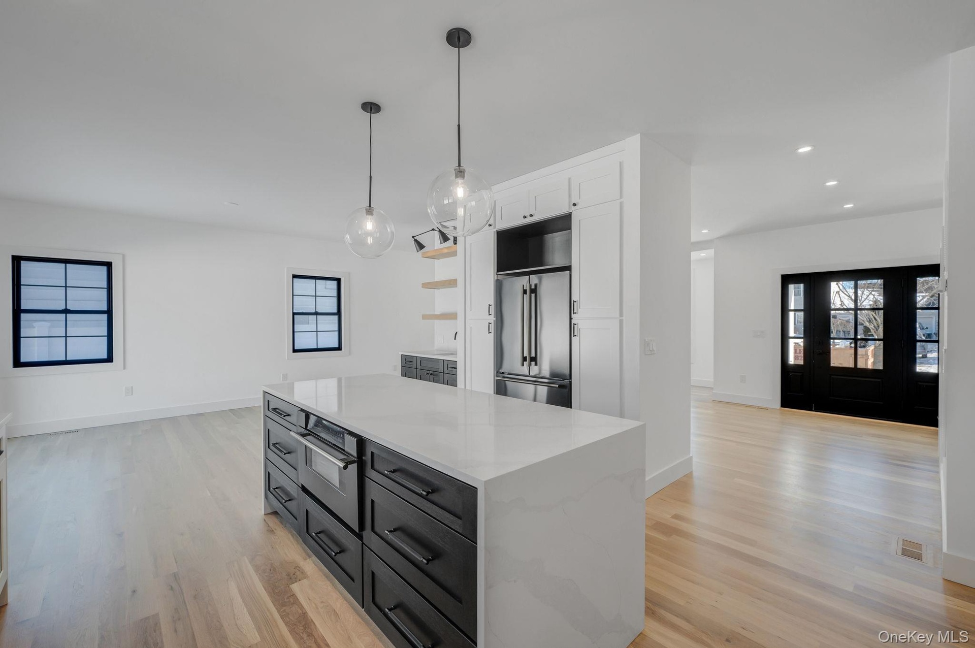 Inside, oversized Andersen windows fill the home with natural sunlight, highlighting the open layout and airy feel. The main level flows effortlessly from the spacious living area into a beautifully designed kitchen with a dedicated dining area and large glass sliders to the yard. The kitchen is anchored by a waterfall edge quartz island, two tone cabinetry, and a full suite of Forno appliances. A standout feature is the first floor junior primary suite with a full bath, ideal for guests, in-law suite, or a private office. Enter from the garage into a built in mudroom area with bench seating and hooks for bags and jackets. A powder room completes this level.