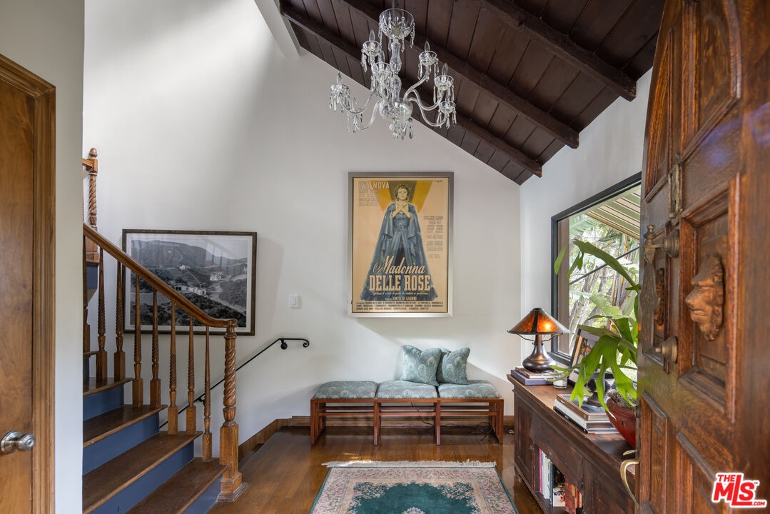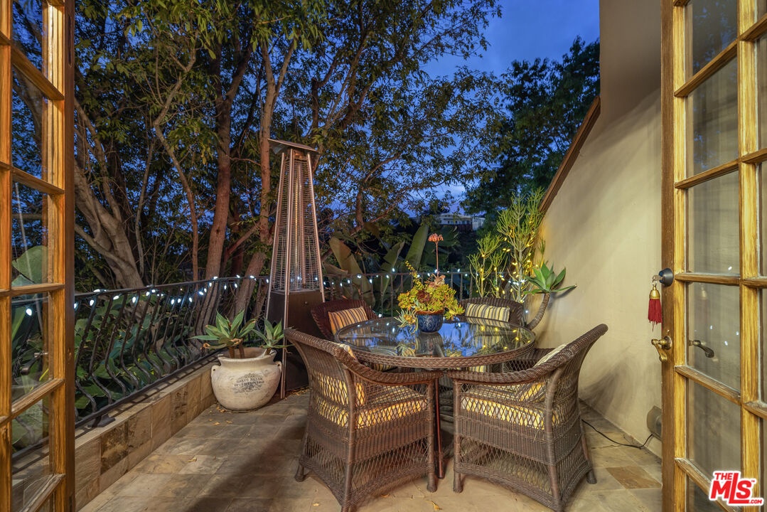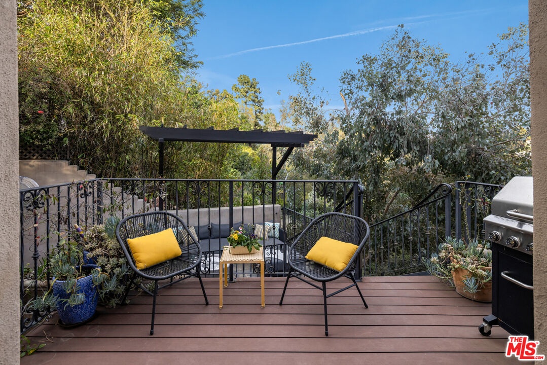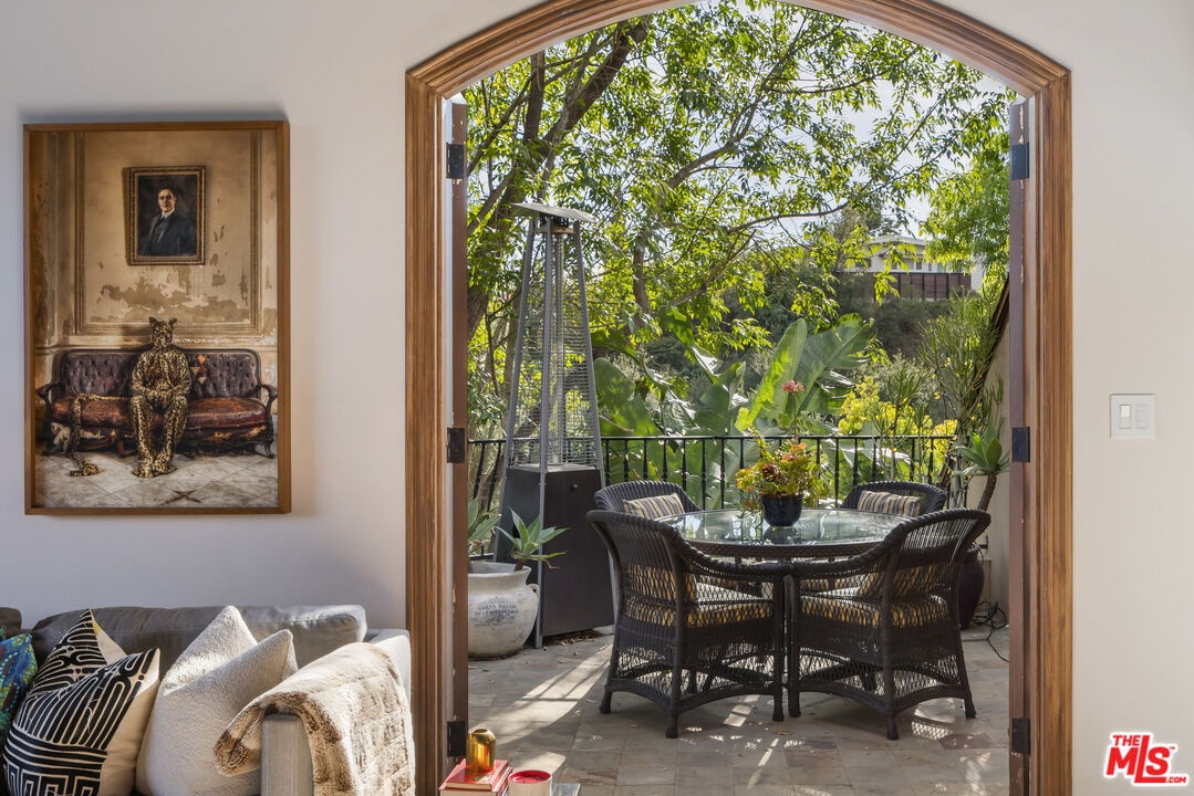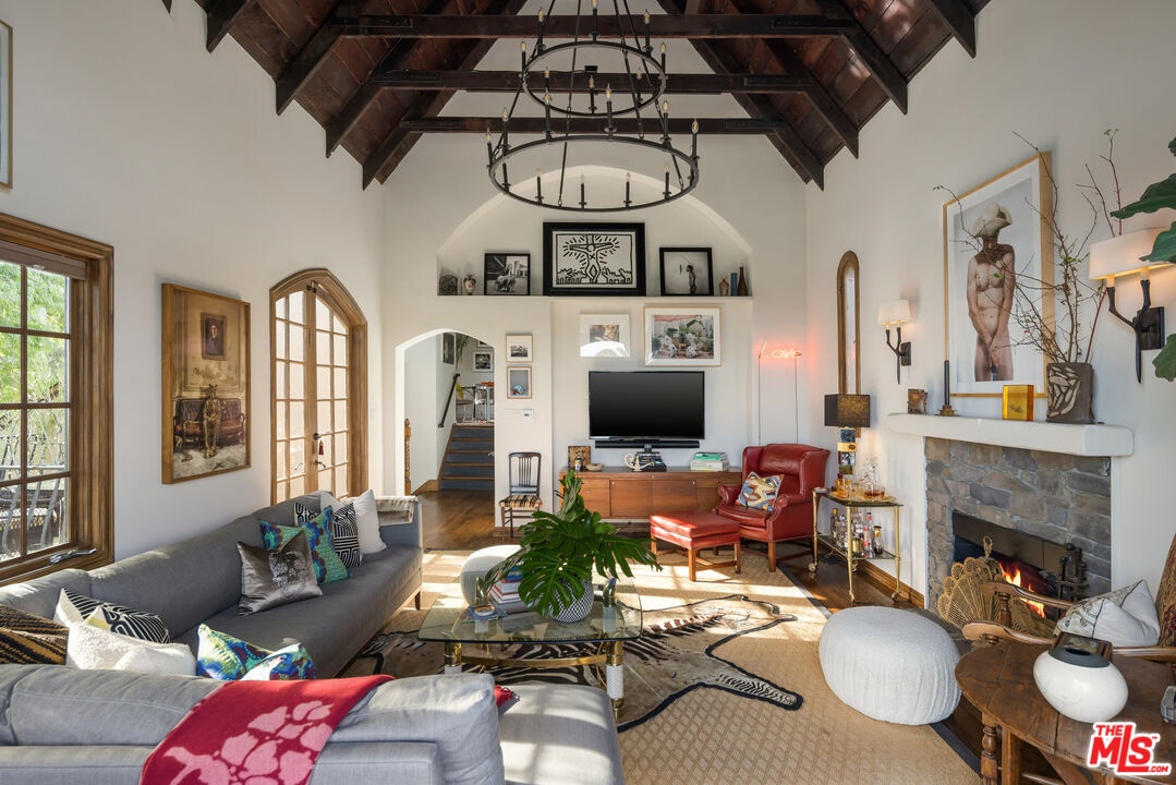 Peacefully tucked amidst the treetops of Beachwood Canyon, this fully furnished 1920s French Normandy chateau is a luxurious retreat where Old Hollywood charm meets modern sophistication! With breathtaking views of the Hollywood Sign, Griffith Observatory, and the iconic Los Angeles skyline, this secluded oasis offers an unparalleled experience in the Hollywood Hills. Step through the arched entryway and be transported to a world of elegance, exquisite walnut millwork, soaring truss ceilings, and abundant windows that bathe the home in natural light. Cathedral ceilings tower over the living room's stone fireplace and scenic French doors, opening to a picturesque deck that sets the stage for unforgettable evenings under the stars. A designer chandelier lends a relaxing mood for intimate gatherings in the dining area. Crafted for the avid cook, the gorgeous kitchen features premium appliances, custom cabinetry, a distinctive backsplash, and gleaming marble countertops. Three generous bedrooms invite you to unwind after a long day, the grandest of which is the primary suite with its exclusive balcony, walk-in closet, and opulent ensuite. Multi-level outdoor seating areas, a covered fitness alcove, and lush greenery make this home an entertainer's dream. Notables include the versatile loft with a separate entry, kitchenette, and a long, gated driveway offering ample parking. Its elevated location makes this sanctuary feel remote despite being only moments from the heart of LA. The house is offered fully furnished