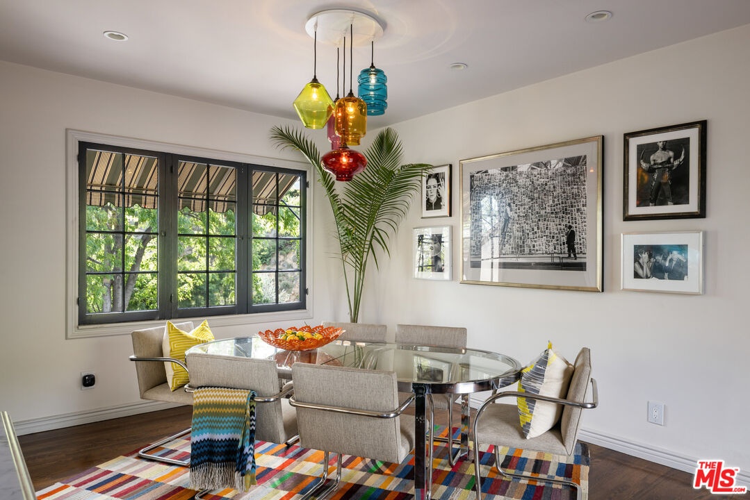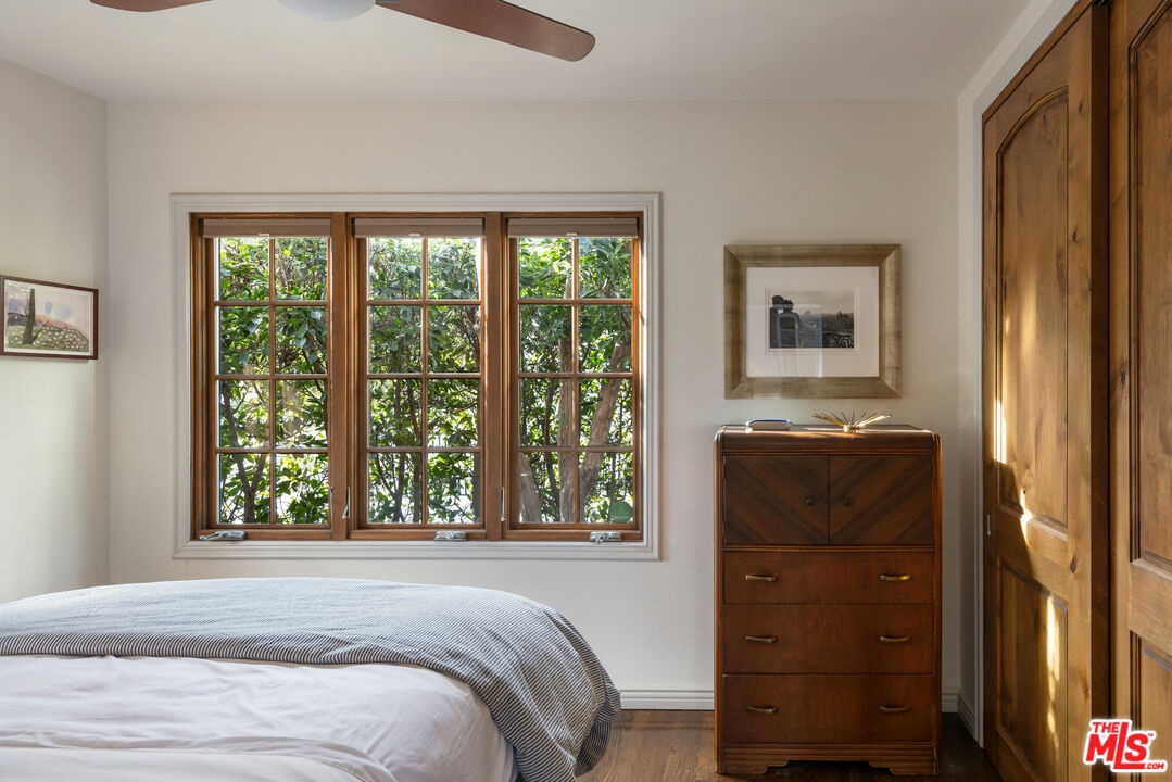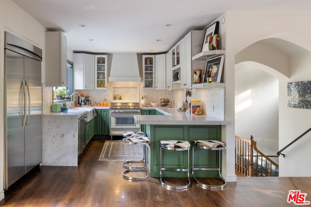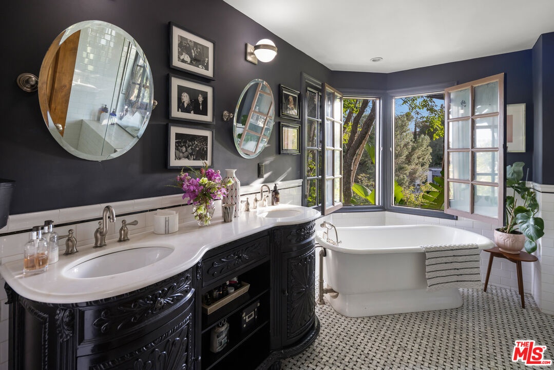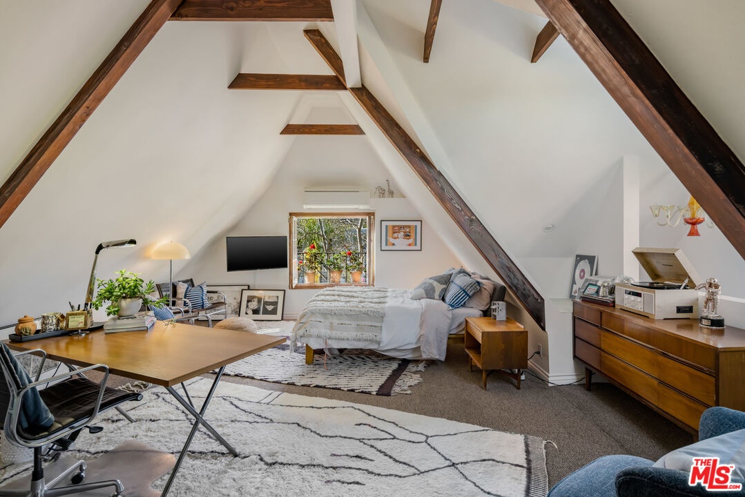 Peacefully tucked amidst the treetops of Beachwood Canyon, this fully furnished 1920s French Normandy chateau is a luxurious retreat where Old Hollywood charm meets modern sophistication! With breathtaking views of the Hollywood Sign, Griffith Observatory, and the iconic Los Angeles skyline, this secluded oasis offers an unparalleled experience in the Hollywood Hills. Step through the arched entryway and be transported to a world of elegance, exquisite walnut millwork, soaring truss ceilings, and abundant windows that bathe the home in natural light. Cathedral ceilings tower over the living room's stone fireplace and scenic French doors, opening to a picturesque deck that sets the stage for unforgettable evenings under the stars. A designer chandelier lends a relaxing mood for intimate gatherings in the dining area. Crafted for the avid cook, the gorgeous kitchen features premium appliances, custom cabinetry, a distinctive backsplash, and gleaming marble countertops. Three generous bedrooms invite you to unwind after a long day, the grandest of which is the primary suite with its exclusive balcony, walk-in closet, and opulent ensuite. Multi-level outdoor seating areas, a covered fitness alcove, and lush greenery make this home an entertainer's dream. Notables include the versatile loft with a separate entry, kitchenette, and a long, gated driveway offering ample parking. Its elevated location makes this sanctuary feel remote despite being only moments from the heart of LA. The house is offered fully furnished