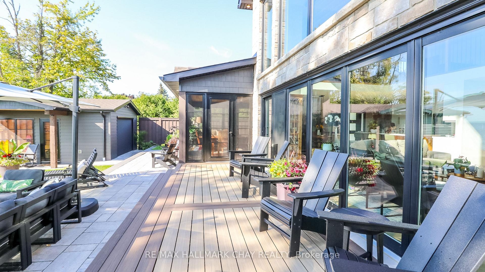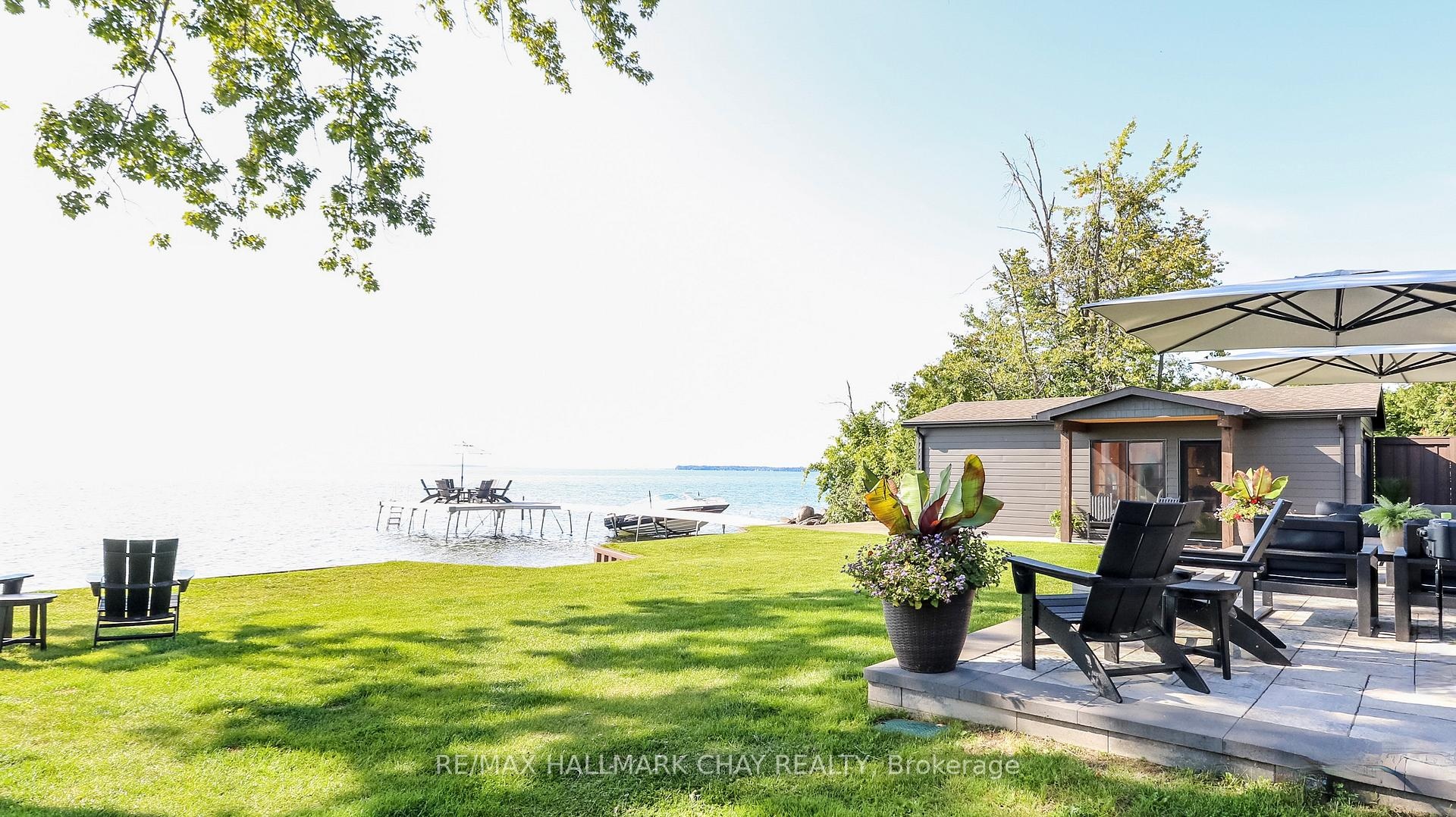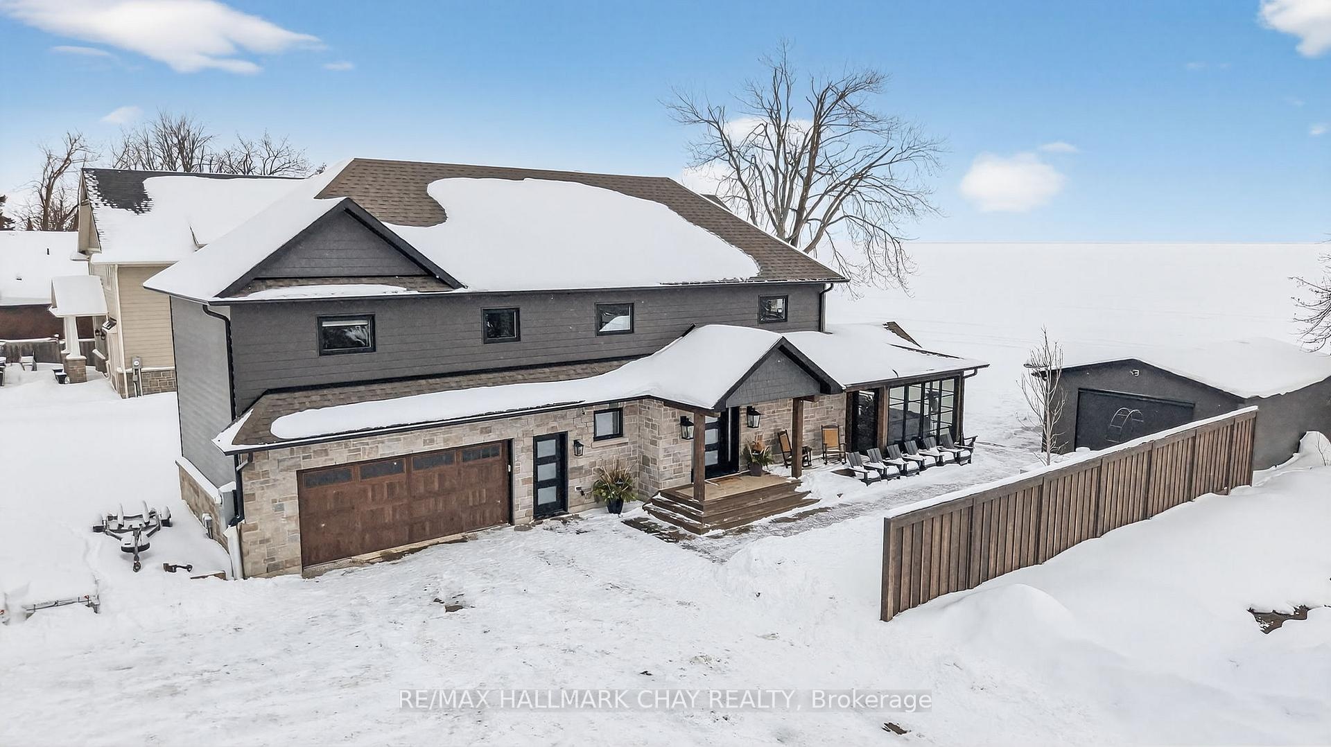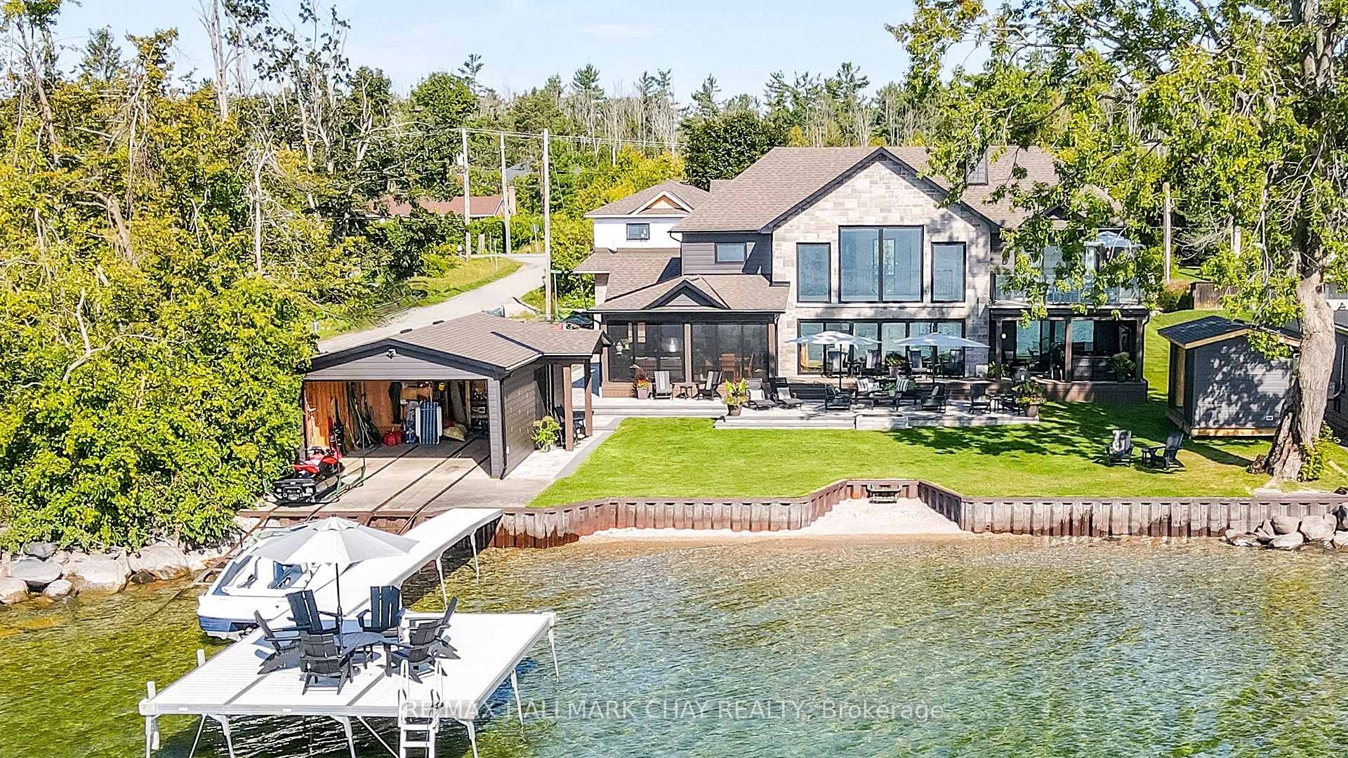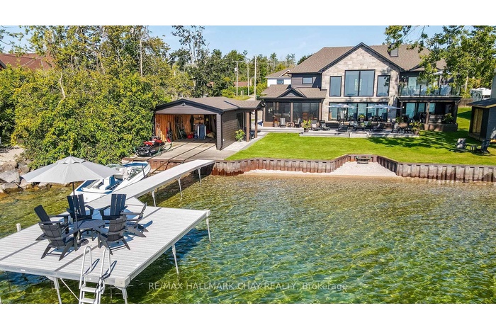 Exceptional south-facing lakefront estate offering 4370 sq ft of fully renovated living on 100' x 194' of flat, steel-pile protected shoreline. Breathtaking water views from nearly every room. Luxury waterfront just 15 minutes from Barrie or Orillia.Thoughtfully redesigned in 2023, features two spectacular Primary Bedrooms, 1 main floor & 2nd upstairs - each with ensuite bathrooms, heated floors, separate water closets, walk-in closets, floor-to-ceiling windows opening to private Lakeview decks. The lower suite offers covered deck hot tub access, while the upper suite features a glass railing deck. The 3rd spacious upper bedroom could be split into 2, has 5 pc ensuite & heated floors. House designed for a fifth bedroom/office or fitness space upstairs, easily converted. The Show-Stopping Great Room has floor-to-ceiling glass, ceiling wood beams, Napoleon wood-burning fp w/ Owen Sound stone and custom built-in cabinets. Hardwood flooring throughout w/ luxury carpet in bedrms. The chef's kitchen offers water views, Bosch Wall Oven & Microwave, gas range, custom cabinetry, Quartz countertops & backsplash, large island for six, and dedicated coffee bar. Enclosed 3 season Sunroom with Douglas Fir floors & ceiling, Sun-Tek windows/screens, room for sitting and eating area. Inside entry from garage into family sized mud/ laundry room, dog wash & powder room. Amenities continue: UV water system, whole-home generator, automated irrigation and lighting, new septic system, lakeside patio & fire pit, dry double boathouse with dual railways, workshop, storage for water toys, new 60' dock with huge seating area. A 2-storey Detached heated/air-conditioned garage built to fit a golf simulator, second story for 5th bedroom or games room. 21' Bow-rider boat included. Refined waterfront living at its absolute best - impeccably renovated, thoughtfully designed, and built for unforgettable moments on the water. Homes of this calibre, condition, and location are rarely offered.