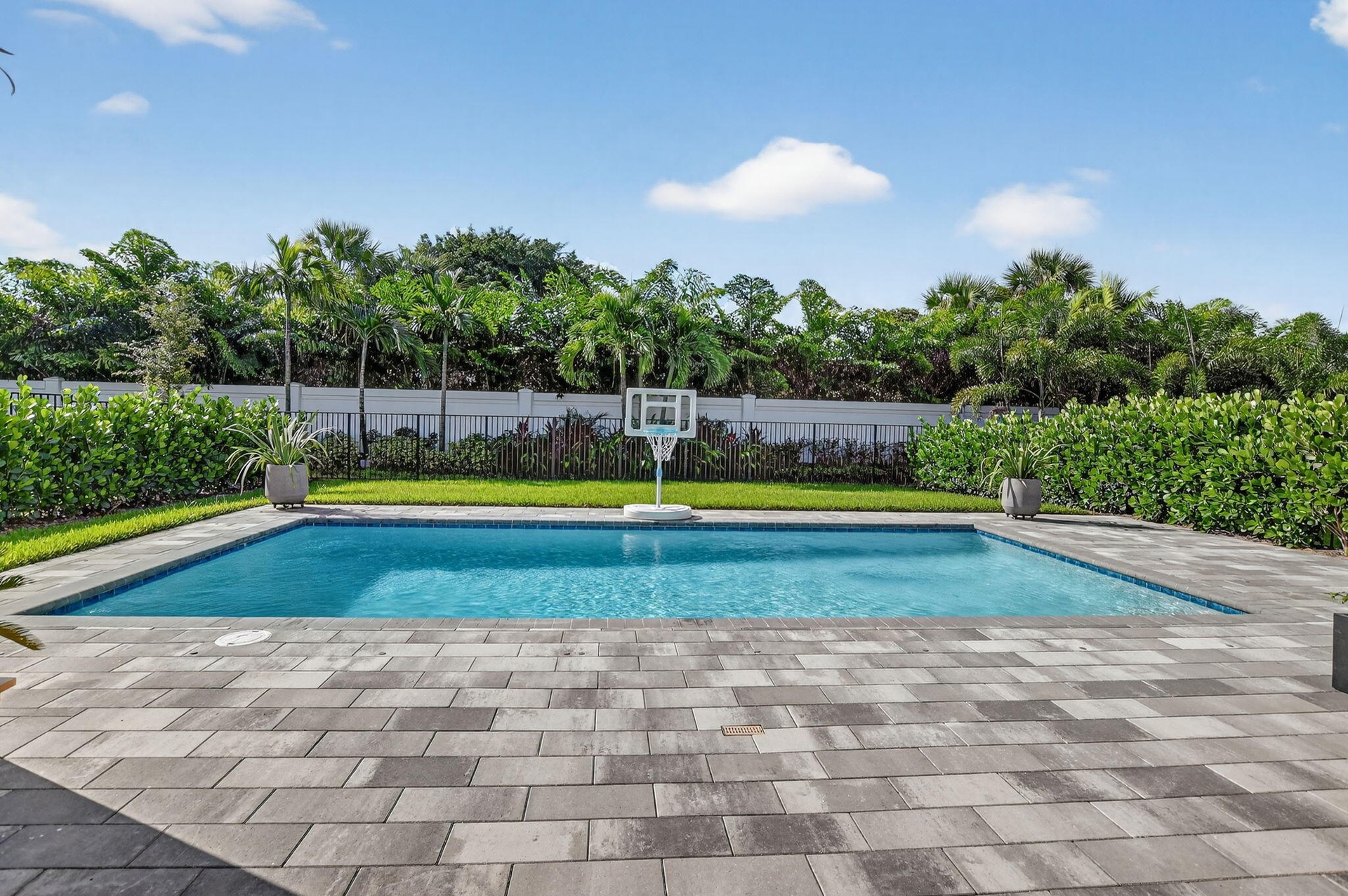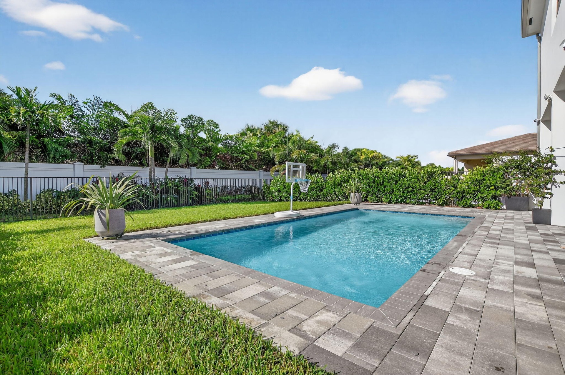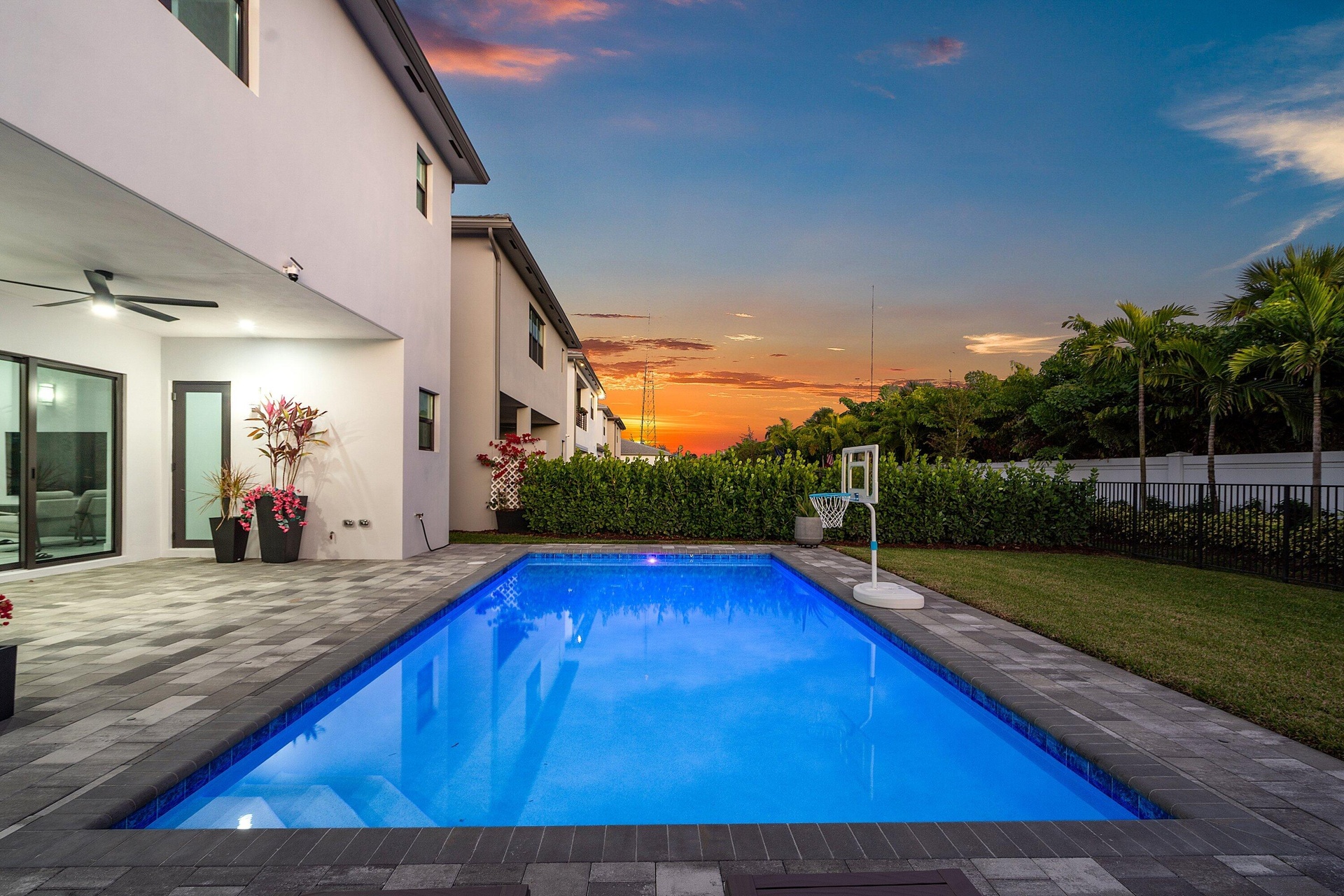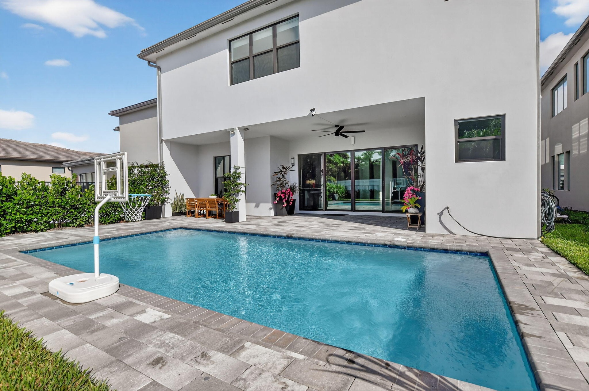 Step outside to your private, lush backyard oasis, highlighted by a saltwater pool, perfect for relaxing or hosting unforgettable gatherings.