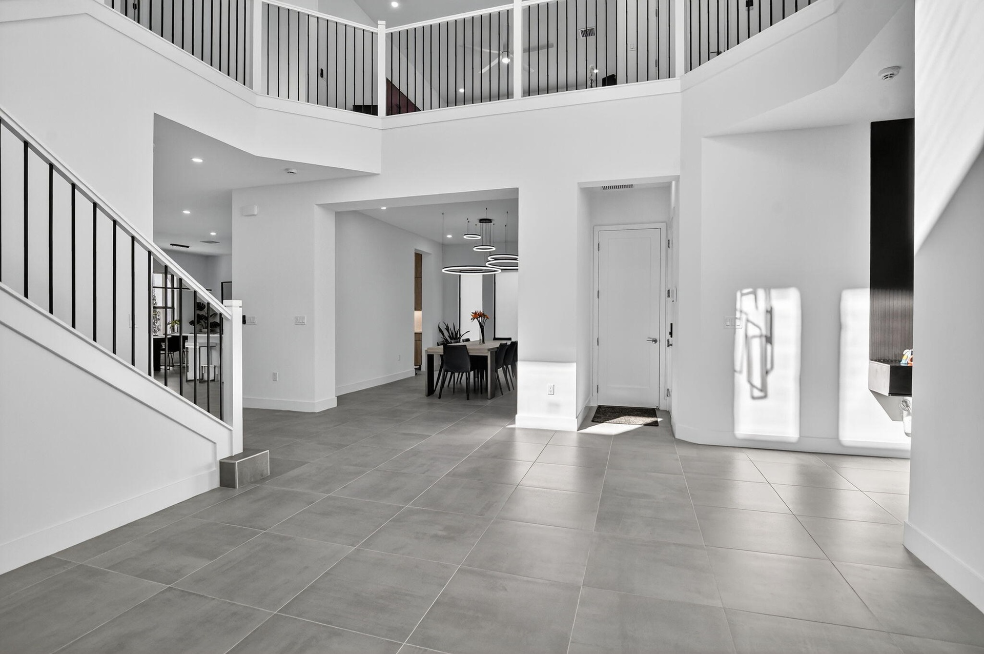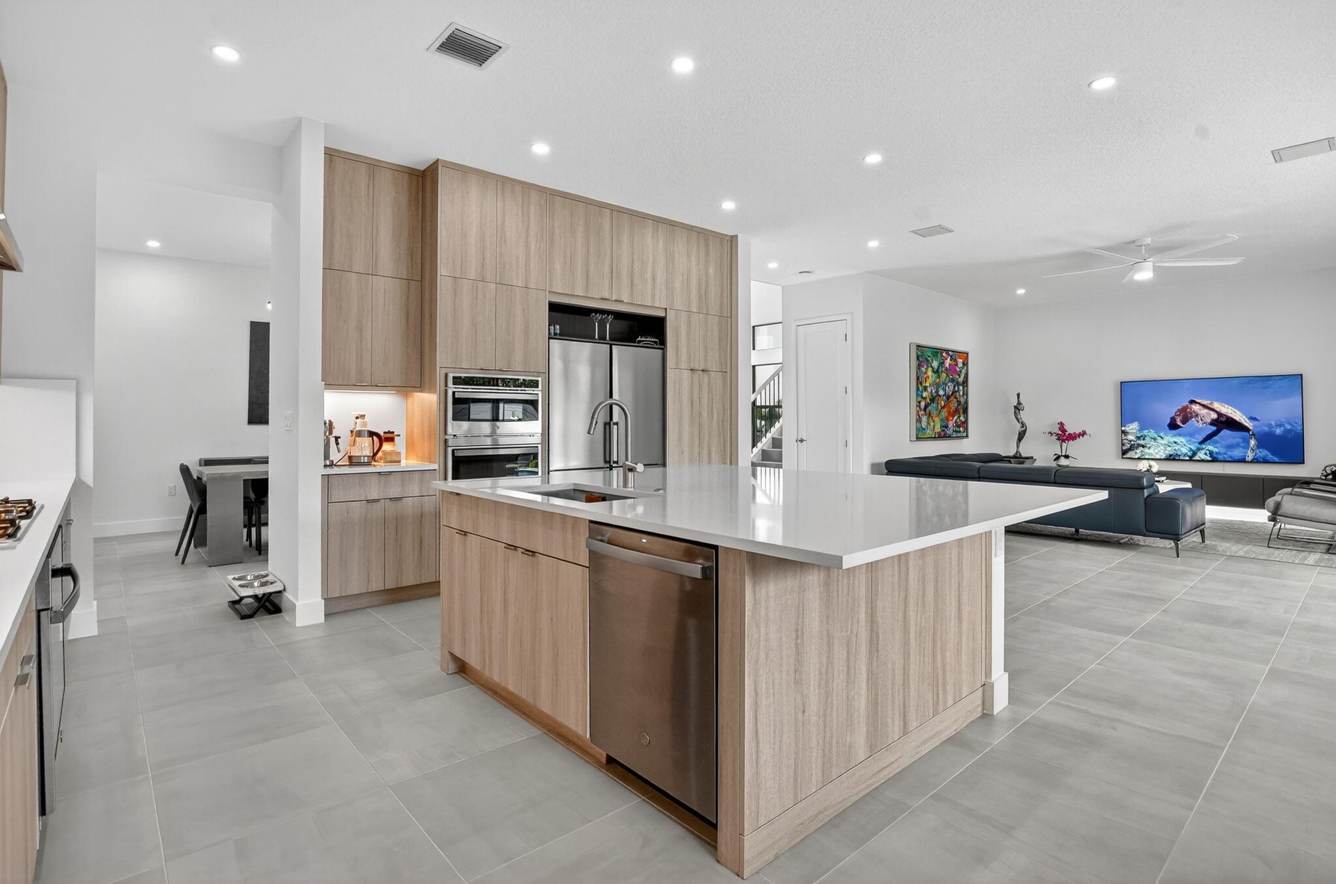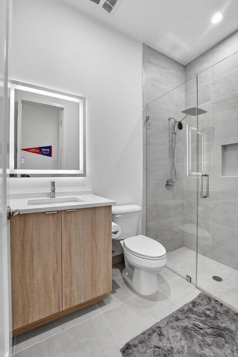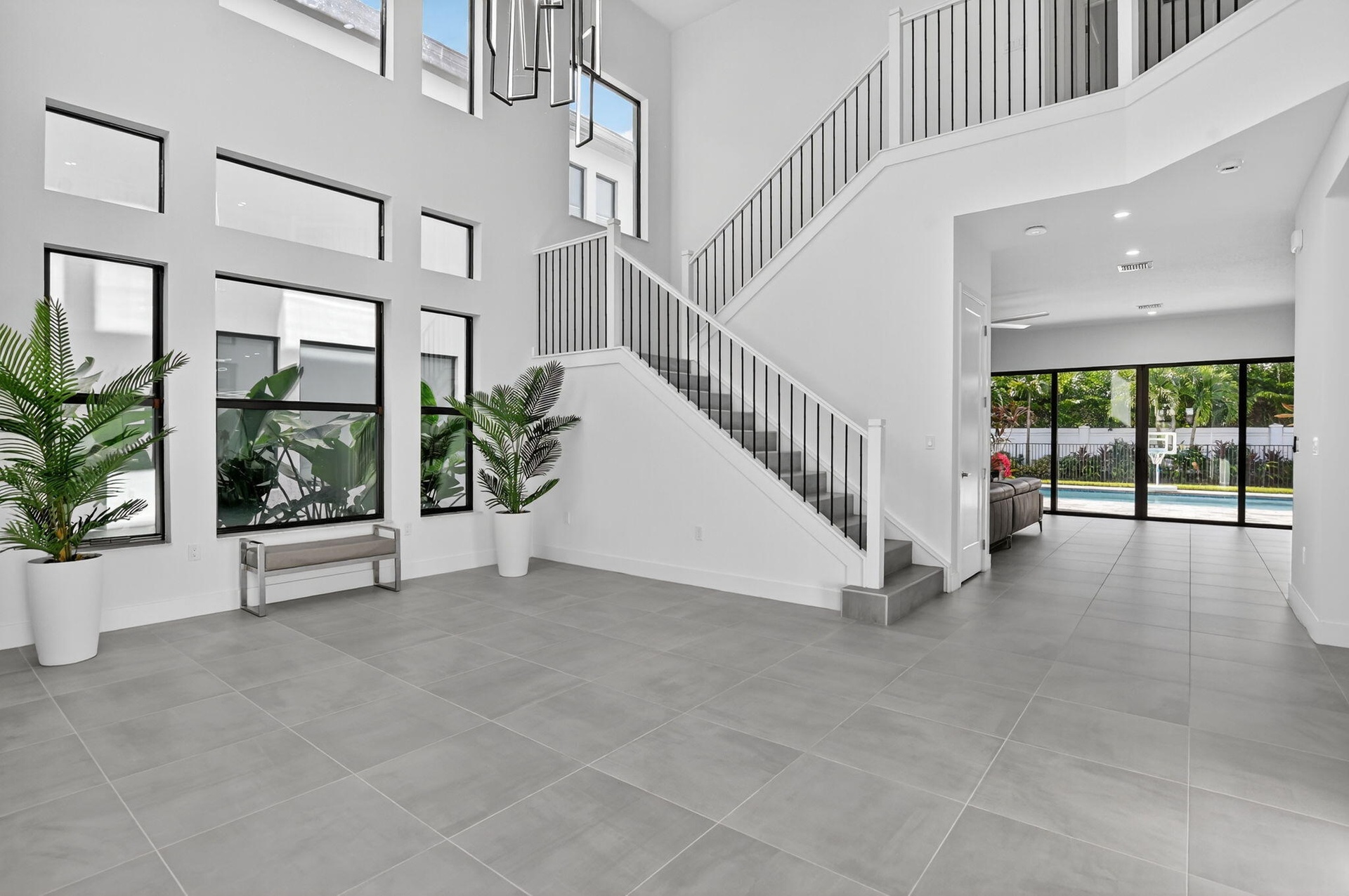 The open layout features upgraded tile and wood flooring throughout, a formal dining room perfect for entertaining, and a convenient downstairs suite ideal for guests or multigenerational living. The chef's kitchen is a true showpiece, complete with floor-to-ceiling cabinetry and seamless flow into the main living areas. All bathrooms have been fully upgraded and include frameless glass shower doors, floor to ceiling upgraded tile and quartz countertops, delivering a sleek, spa like experience. Impact windows and doors provide peace of mind while enhancing energy efficiency.