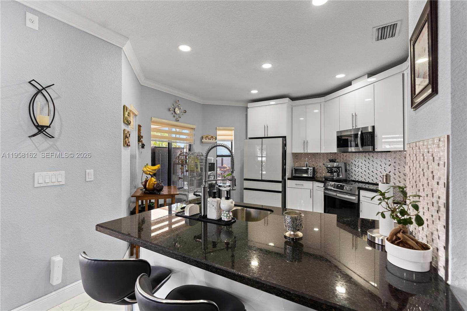 << Sellers are ready to relocate, MOTIVATED to sell>> Corner lot Home NO HOA. It features 4 Beds 3 baths, and a 2-car garage. Porcelain tile throughout home, new modern sleek kitchen cabinets and stainless steel appliances. A spacious primary room with high ceilings adding elegance, freshness, and walk-in closet. Bathroom with modern finishes and a European touch glass stand-up glass shower door. All the bathrooms have been remodeled. Impact windows and doors, CUSTOM zebra window treatments. 5 tons A/C unit approx. 2024. Garage has been divided as man's cave, office or room but it can be converted back. The second floor of home was built on a SOLID CONCRETE structure. Centrally located, with great A+ Schools, many restaurants, easy access to expressways. Travertine-tiled throughout the entire backyard. Spacious outdoor kitchen perfect for entertaining. Room for a pool and also for boat lovers. All reasonable offers will be considerered.