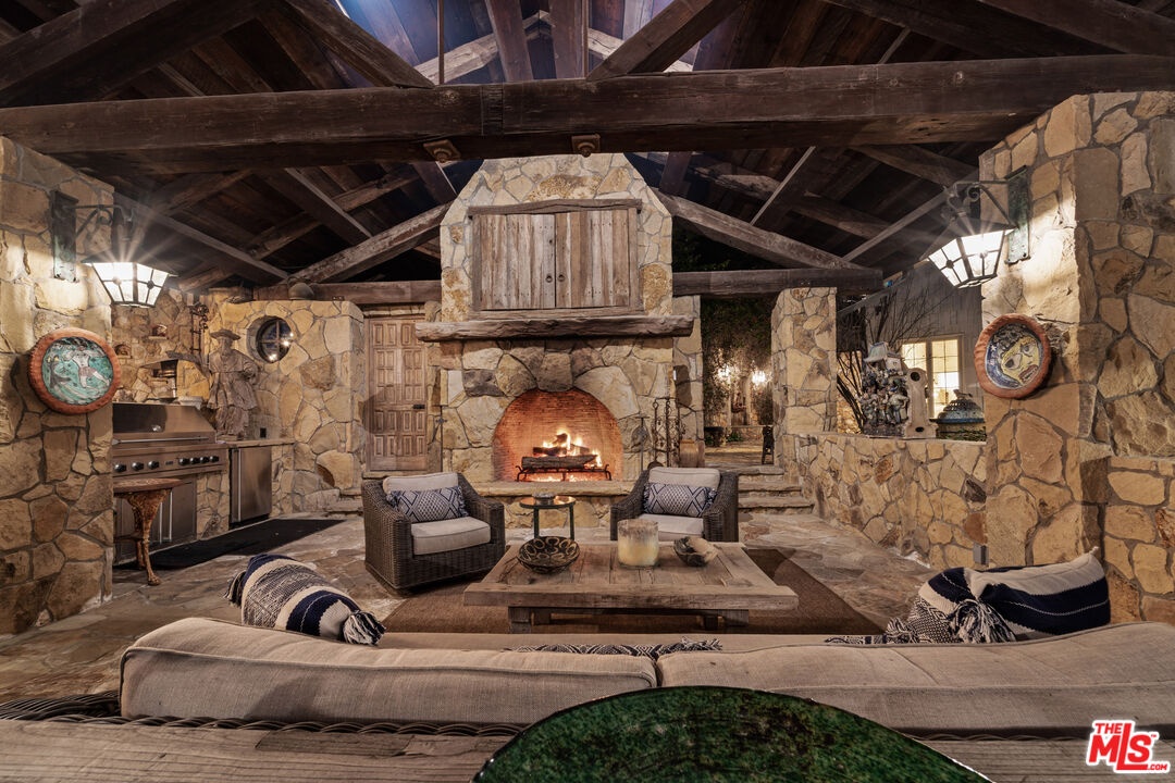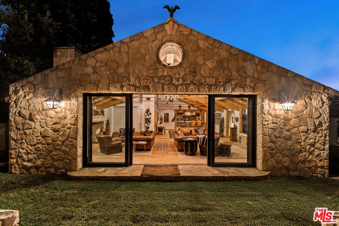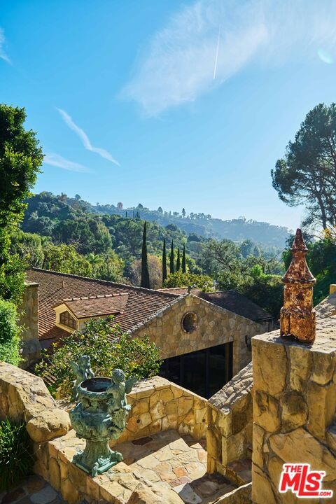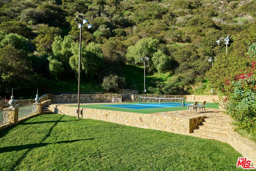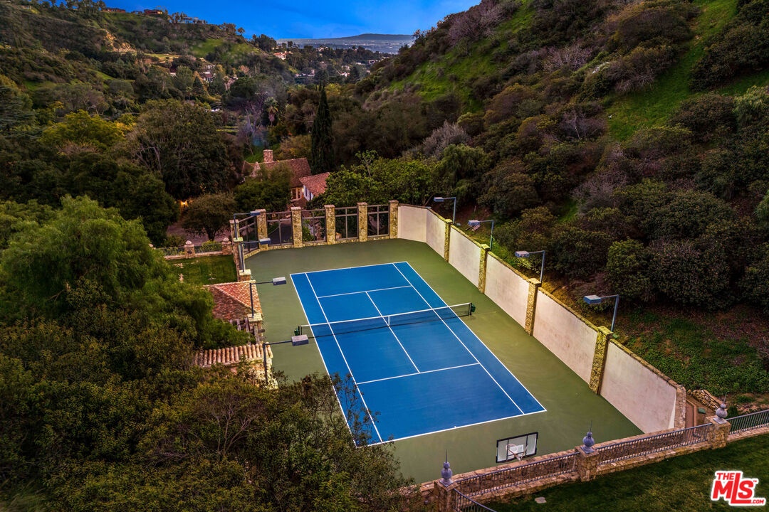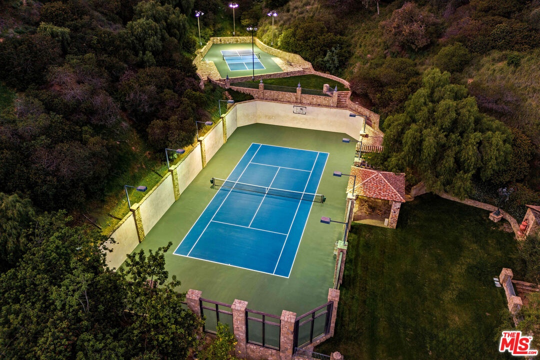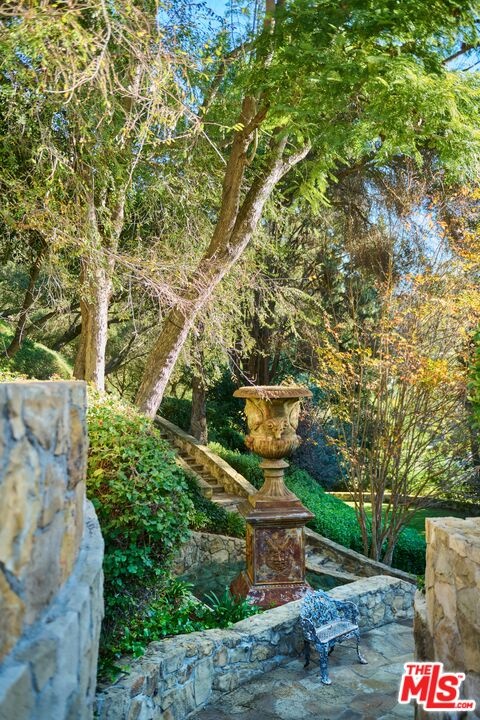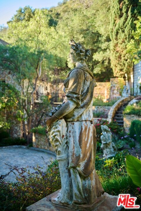 Once the storied Beverly Hills estate of Hollywood legend James Cagney, this rare and formerly celebrity-owned gated compound presents a once-in-a-generation opportunity to acquire a historic luxury estate in Beverly Hills 90210. Tucked privately beneath Franklin Canyon Nature Reserve, this expansive multi-residence Beverly Hills compound spans more than five acres of secured gated grounds, offering an unheard-of combination of acreage, provenance, and seclusion. Extensively renovated, updated and restored over many years, the private gated estate unfolds as a village-like enclave with multiple residences connected by hand-laid stone pathways winding through tiered citrus gardens, sculptural courtyards, candle-carved stone walls, and museum-quality European statuary. Mature landscaping and curated outdoor rooms create a timeless environment ideal for both intimate living and large-scale entertaining. The "Main Villa" is a romantic architectural centerpiece featuring reclaimed European terracotta roof tiles, exposed trussed-beam cathedral ceilings, leaded glass windows, and multiple restored original fireplaces. Designed for seamless entertaining, the home flows effortlessly from wine cellar and butler's pantry to formal dining and elegant yet warm living rooms, evoking timeless character. This main villa residence offers two primary bedroom suites with couture-scale closets and both suites include grand ensuite baths, soaking tubs, double vanities, step in showers for two, while an additional guest bedroom suite features luxurious cedar closet dressing room and en suite bath. Additional structural assets across the estate compound include a secluded guest residence known as "The Boathouse," with wood floors and trussed beams of antique 19th Century reclaimed French Oak complete with its own private gated drive and porte-cochre, ideal as an event venue, creative retreat, or production studio. "The Carriage House-Artist's Studio," is a multipurpose creative studio with full kitchen, en suite bath and auto garages. Plus an additional detached " Guest Cottage", which was Cagney's original art studio where he complete many collection paintings but now renovated to include a full kitchen and en suite bath. This epic compound provides multiple self-contained living environments, making this an exceptional multi-generational Beverly Hills estate uniquely versatile. Other features and amenities include separate regulation tennis and pickleball courts with grandfathered night lighting, a tennis spectator pavilion with wet bar, a glass-tile swimming pool and spa with poolside cabana and outdoor dining bistro. The Pavillion and Pool Cabana each include a fully equipped outdoor chef's kitchen. Expansive flat lawns and play fields offer rare recreational space within the hills above Sunset Boulevard. A true trophy property, the former James Cagney Estate stands as a legacy Beverly Hills estate where architecture, landscape, and artistry converge, perfectly suited for multigenerational living, artists-in-residence, or those seeking an irreplaceable Hollywood history estate in one of Los Angeles' most exclusive enclaves.