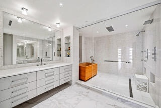 This home is fully integrated with Control 4 automation and J Geiger motorized shades, rain shower, waterfall shower, body sprays in luxurious master bath with double sinks and private water closet. Custom plastered in downlighting by No. 8 Lighting help create a modern aesthetic.