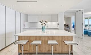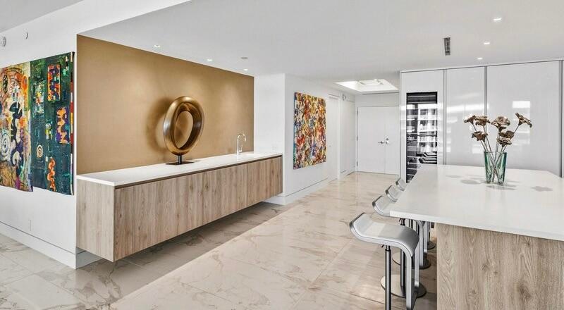 The transition between the lush tropical surroundings and the interior is seamless, thanks to custom Windoor storm doors that vanish to merge the panoramic views with your living space. At the heart of the home, a custom Snaidero kitchen serves as a culinary stage, featuring a full suite of Miele finest appliances and a 170-bottle wine gallery.