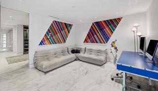 The primary suite is a masterclass in tranquility, wrapped in in bespoke hand-painted wall coverings and anchored by a spa-sanctuary of unparalleled scale. The bath is a sensory experience, featuring a Japanese Enoki wood soaking tub complemented by a rain shower, waterfall feature, and specialized body sprays. Every surface is an intentional choice, from the Ann Sacks tile and stonework to the Porcelanosa countertops with integrated sinks. The suite is completed by a magnificent ORNARE custom dressing room, featuring a dedicated makeup counter and integrated mini-sink.