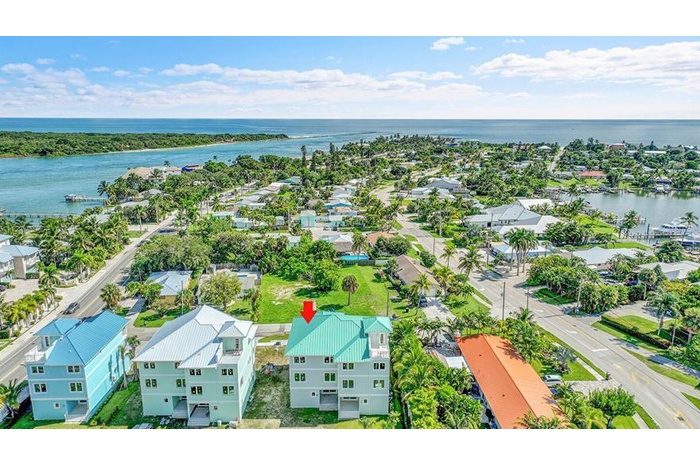Are YOU ready to customize your NO HOA tropical retreat? Nest up in this 3 story home, close to dining with live music, beaches, boat ramps and happy vibes. Featuring 2729 SF 3599 Total 1/2 Duplex 3/4/2 Elevator home. Pick interior finishes. Office, laundry rm w/ sink, Lg flex rm on 1st Floor. 250 gallon propane, Sonos speakers, fire sprinklers, irrigation, 3 AC units for multi zones, elevator, Thor Appliances with gas air-fry oven, tankless hot water tank, washer with gas dryer, a well-appointed kitchen with 10 FT center island with quartz counters, farm sink ,plus a 72 inch Elec fireplace. Ceiling fans, light fixtures and anti-fog and lighted mirrors are included too. Relax on the two spacious covered balconies which face the East, or, on the covered