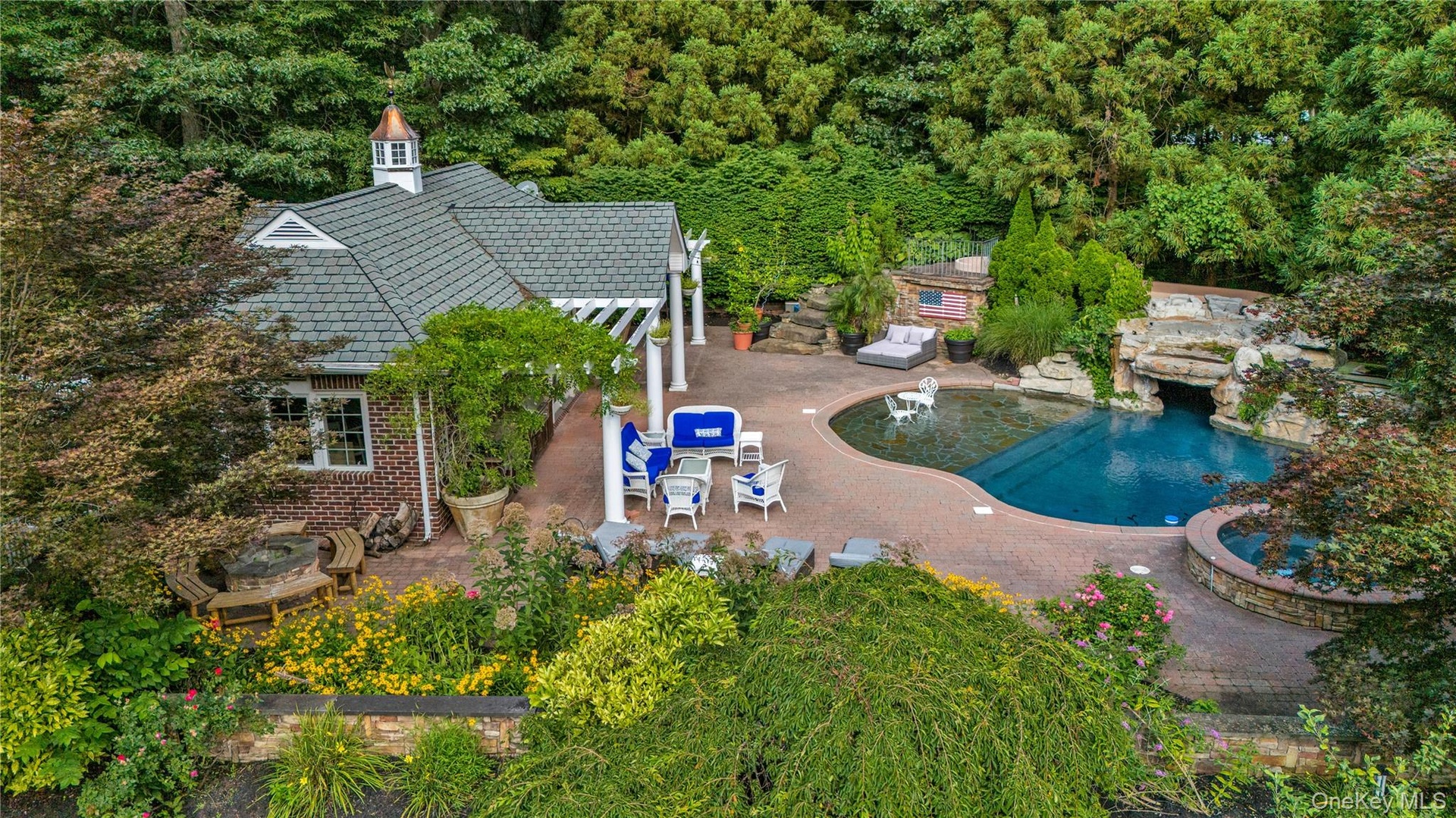 In the exclusive private enclave Lands End in the Village of Lattingtown, this exceptional newer estate is set on four beautifully landscaped acres and built to the highest standards of craftsmanship and design. The stately all brick colonial is introduced by a long paver driveway leading to an elegant courtyard and dramatic portico entry - creating a striking and memorable arrival. Inside, timeless architecture, grand scale and abundant natural light define the sun-filled rooms. A sweeping double bridal staircase makes an immediate statement in the foyer, while a magnificent double height great room, richly appointment den with fireplace, formal dining room and refined library or study each offer distinctive architectural detail and sophisticated living spaces. The updated white chef's kitchen with breakfast area overlooks the expansive patios and manicured grounds. The residence offers exceptional versatility with two luxurious primary bedroom suite options, one on each level, along with a private guest wing, totaling seven bedrooms and six-and-a-half baths in the main house. Designed for effortless resort-style living and entertaining, the property features a spectacular swimming pool with a stunning waterfall, complemented by a fully equipped pool house providing a serene Summer retreat. Mature specimen landscaping ensures privacy and beauty, while multiple terraces and gathering spaces invite seamless indoor-outdoor living. Meandering pathways reveal peaceful, secluded moments throughout the grounds. A separate structure four car garage with heated finished storage space above adds convenience and flexibility. Ideally located in Locust Valley, widely regarded as the crown jewel of the historic Gold Coast - this magnificent estate offers close proximity to Manhattan while enjoying the very best of North Shore living, including nearby beaches, renowned arboretums, Planting Fields State Park, boutique shopping, acclaimed dining, premier golf, tennis and boating clubs and an exceptional sense of community. Located within the Locust Valley School District and nearby private schools, this extraordinary property defines North Shore luxury and offers a rare opportunity to experience refined living at this finest.