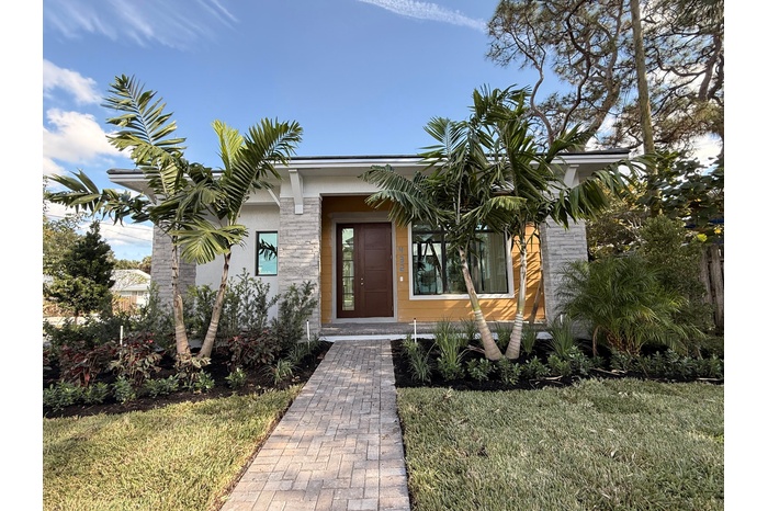 Discover sophisticated living in this stunning new courtyard-style home featuring the convenience of a first-floor owner's suite. This exceptional two-story residence offers seamless indoor-outdoor design with the main-level master bedroom providing single-story living comfort. Located steps from the Saint Lucie River in one of Stuart's most peaceful and tranquil neighborhoods, this contemporary home combines modern luxury with a Florida coastal lifestyle.