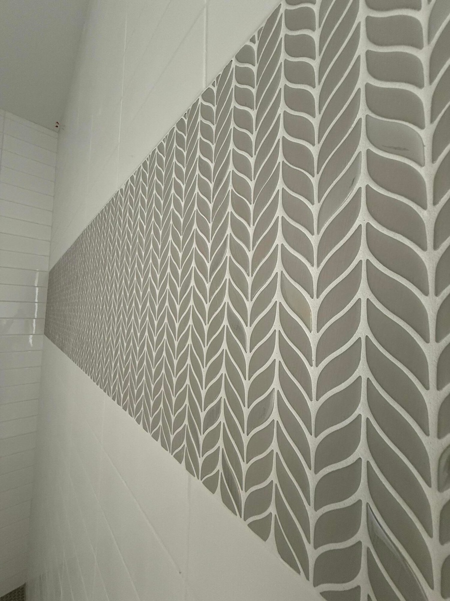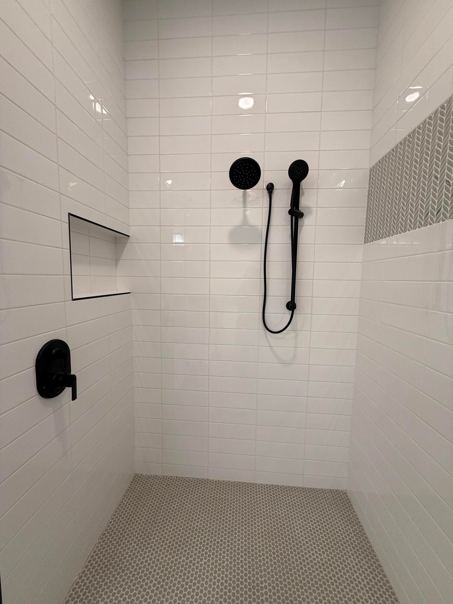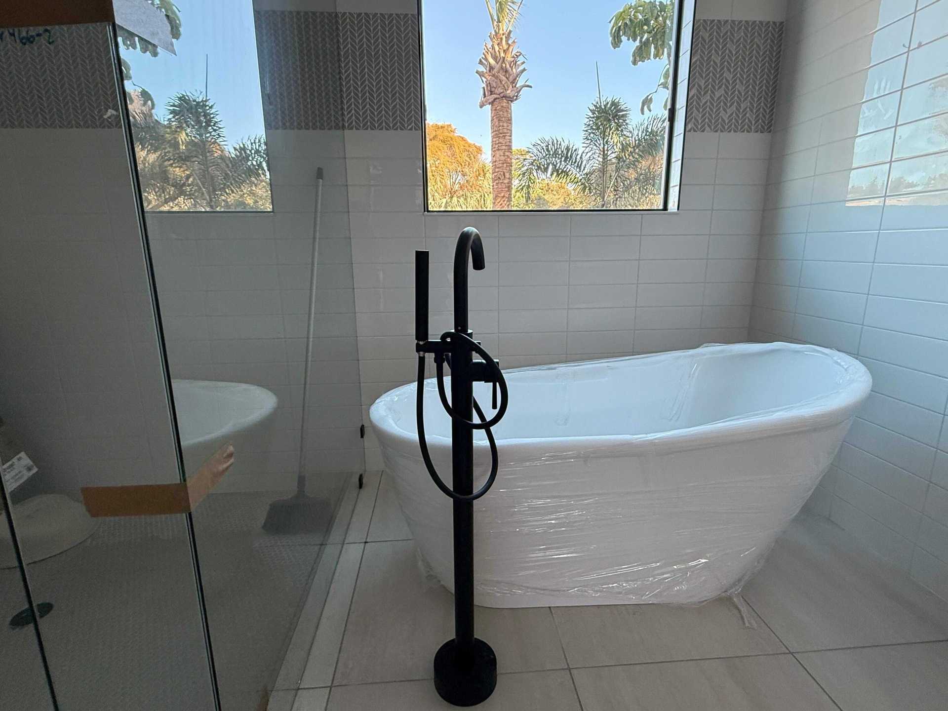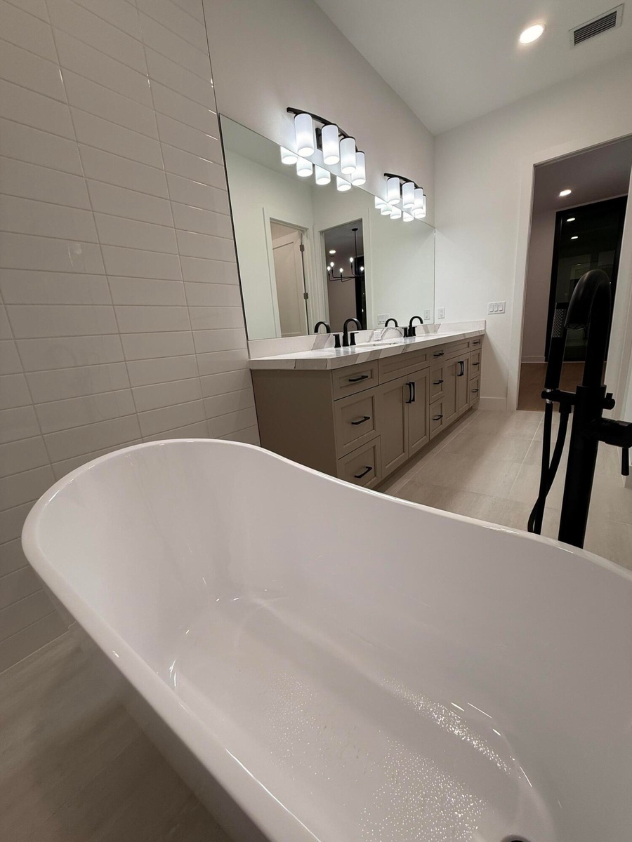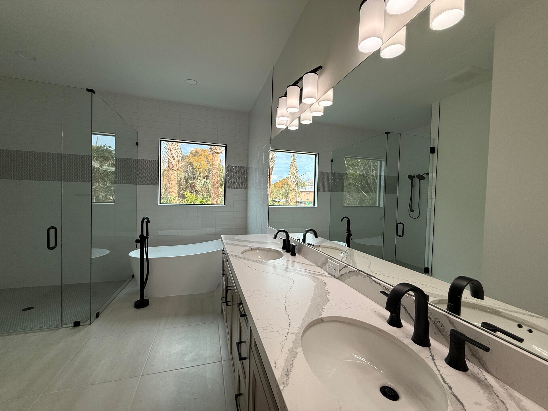 The luxurious master bathroom creates a private spa retreat with a freestanding soaking tub, separate shower, and stunning accent tile. The owners' bath has Cambria quartz countertops.