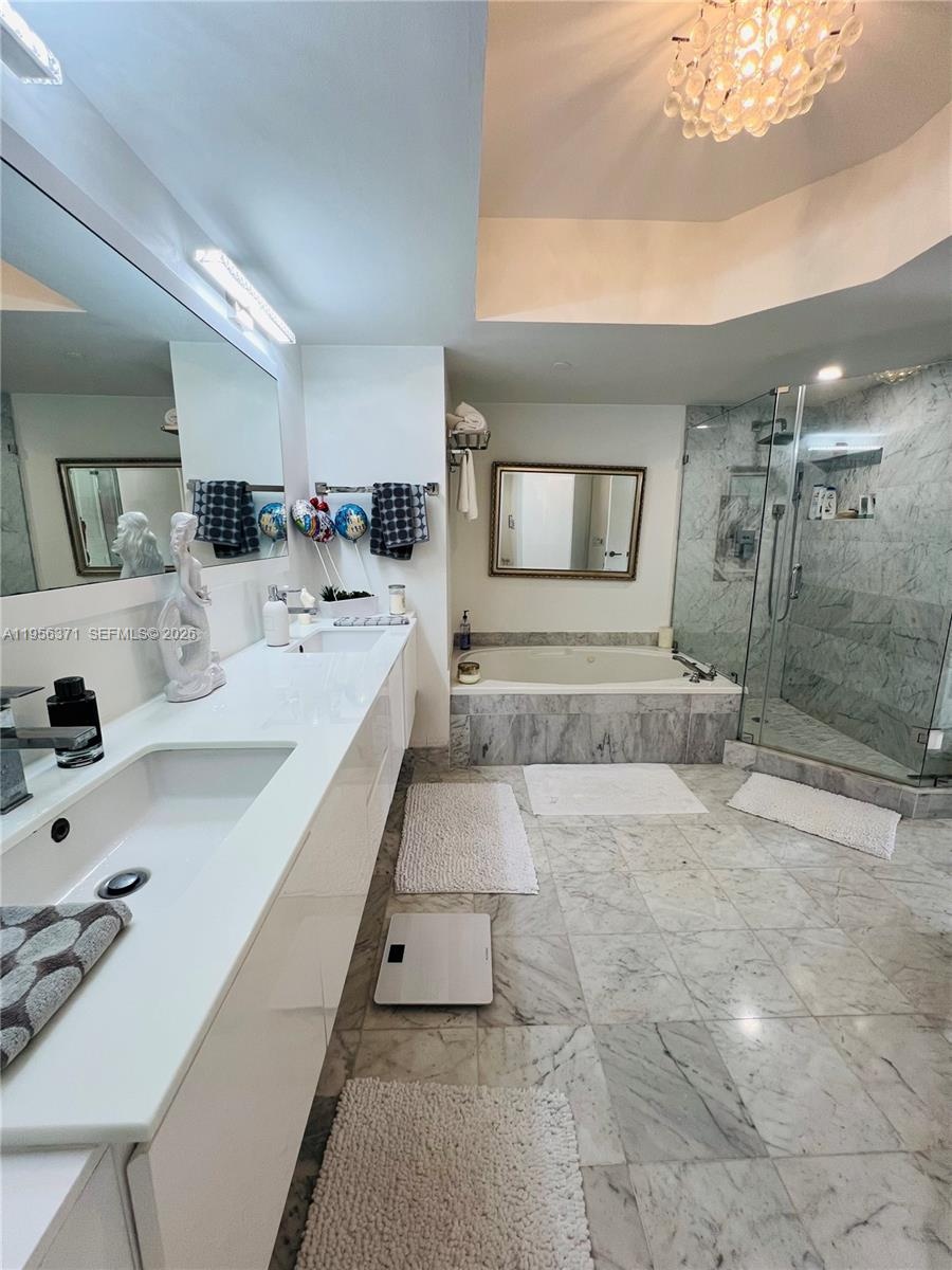 The Primary suite features a very big closet and a luxury big bathroom with double sinks, a jacuzzi tub as well as a glass enclosed shower.