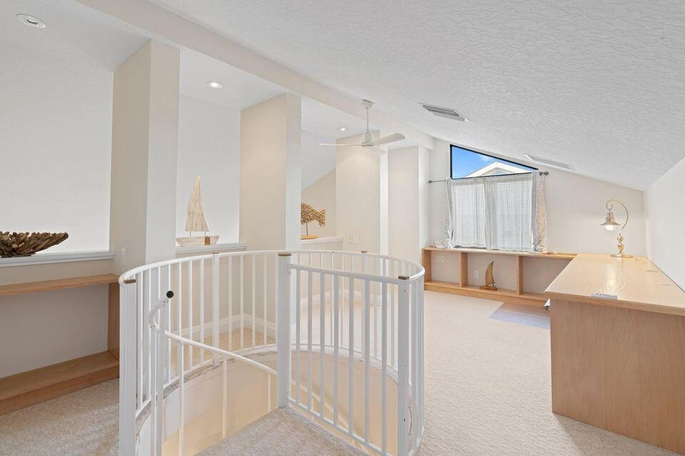 Welcome to The Bluffs a Jupiter Beach Paradise! You will fall in love with this RENOVATED Bluffs home the moment you arrive. Walk to the turquoise waters of Jupiter Beach & the Juno Pier from this light & bright 3 bedroom + loft/den/or bedroom if you like. Located high on the Ridge. Gorgeous east exposure, feel the ocean breezes and listen to the sound of the waves. Relax on the private elevated deck & watch kiteboarders sailing. Custom features: Shell stone & wood flooring throughout, custom millwork, office/den in large sunny loft, extended kitchen w/granite c-tops, French doors, coquina wood burning fireplace, ALL impact glass, atrium dining room, Newer A/C with 4 zones, community heated pool, tennis/pickleball/playgrounds. Perfect Beach Retreat. close to shops, restaurants.