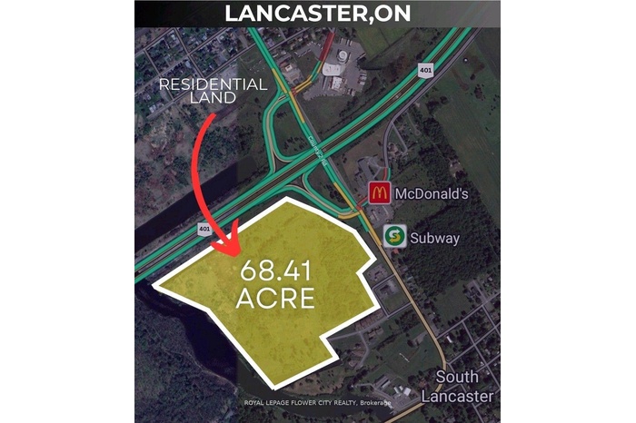 Property for sale formerly known as Cairnview Estates Development is a 68.82-acre property with an Approved Draft Plan of Subdivision located in South Lancaster, Ontario, in the Township of South Glengarry. The Draft Plan calls for 184 residential lots and 4 other blocks of land that could be commercial or institutional. 26 of the residential lots are waterfront lots backing onto the Raisin River and two private canals. From the Raison River, you have access (650meters) to the St. Lawrence River. Lancaster is located 21km from the Quebec/Ontario border and52km from Vaudreuil-Dorion. The Property has access to full services that include: municipal water, municipal sewers, electrical, and natural gas.